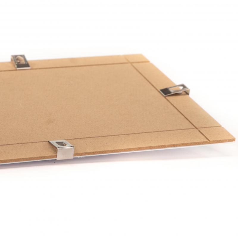 Sul retro, è presente un pannello in fibra di legno ecologico MDF, un materiale robusto e sostenibile. Il supporto regolabile con clips metalliche consente di inserire facilmente la foto e di appendere la cornice in modo pratico, sia in verticale che in orizzontale.