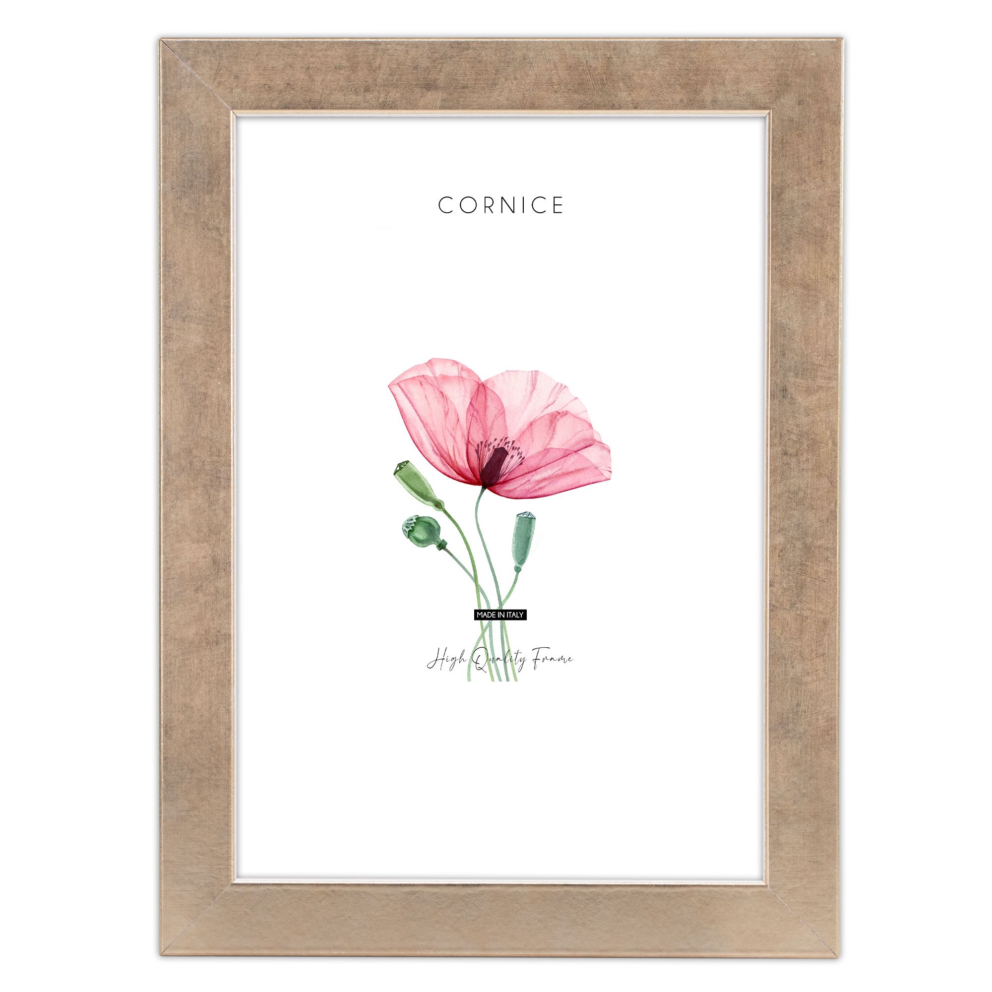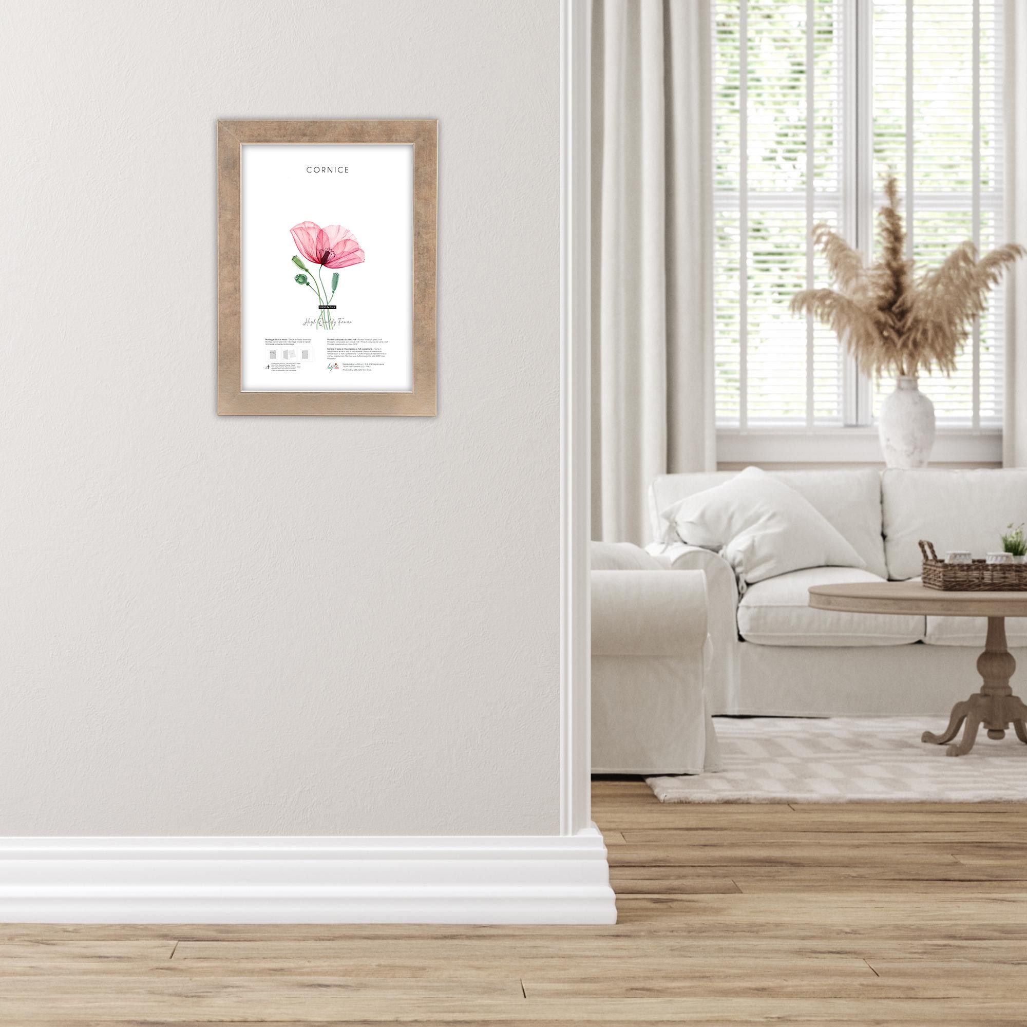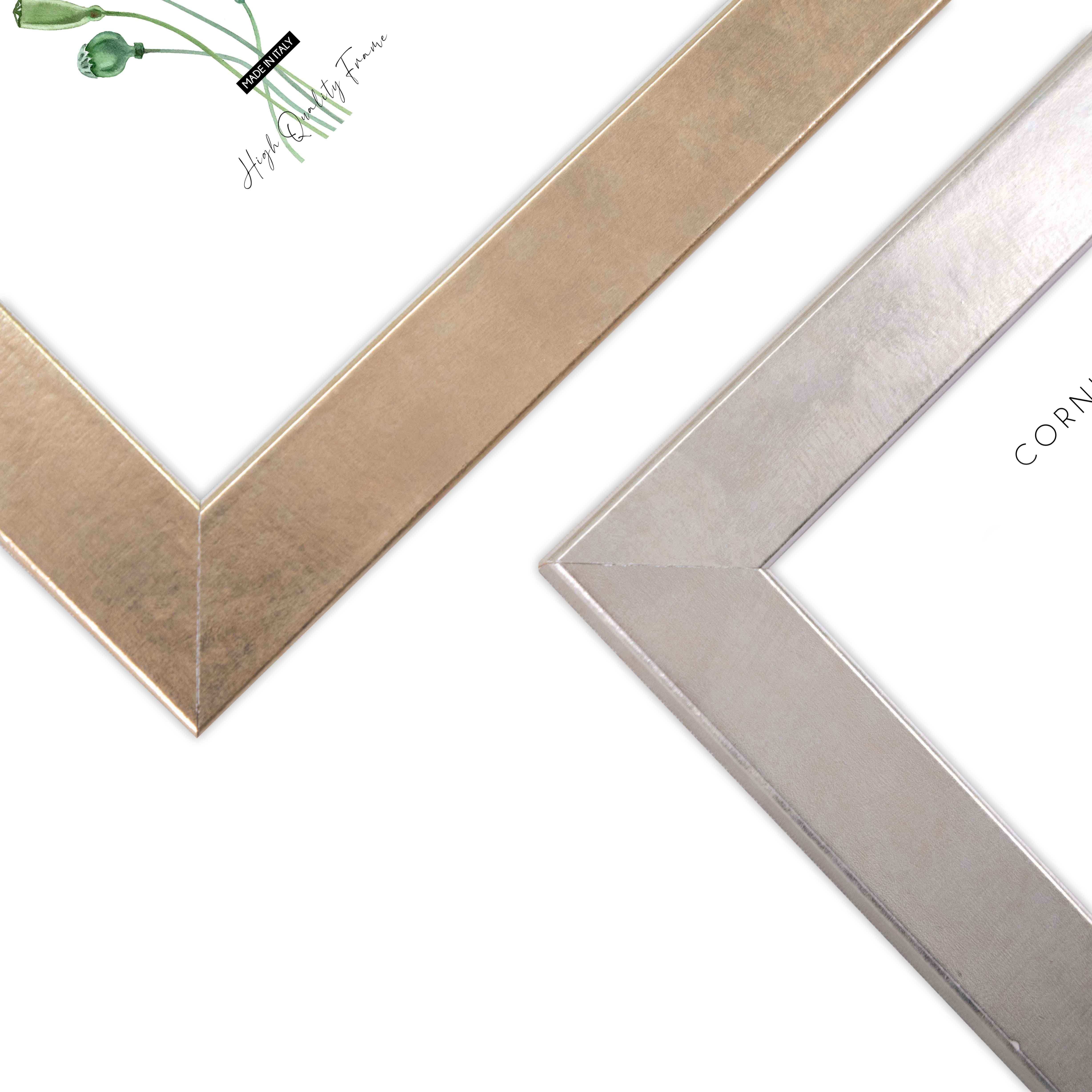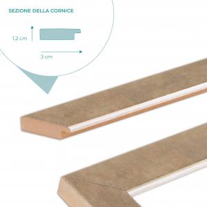 Il bordo interno, in filo bianco, e la finitura color champagne, aggiungono un tocco di classe che arricchisce ogni ambiente. Perfetta per il soggiorno, la camera da letto o l'ufficio, questa cornice valorizza ogni tipo di stampa o fotografia con un'eleganza senza tempo.