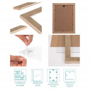 La cornice è realizzata in legno MDF ecologico, che conferisce robustezza e stabilità alla cornice, mantenendo al contempo un impegno verso la sostenibilità. Sul retro sono presenti ganci a scomparsa per appendere la cornice sia in orizzontale che in verticale.