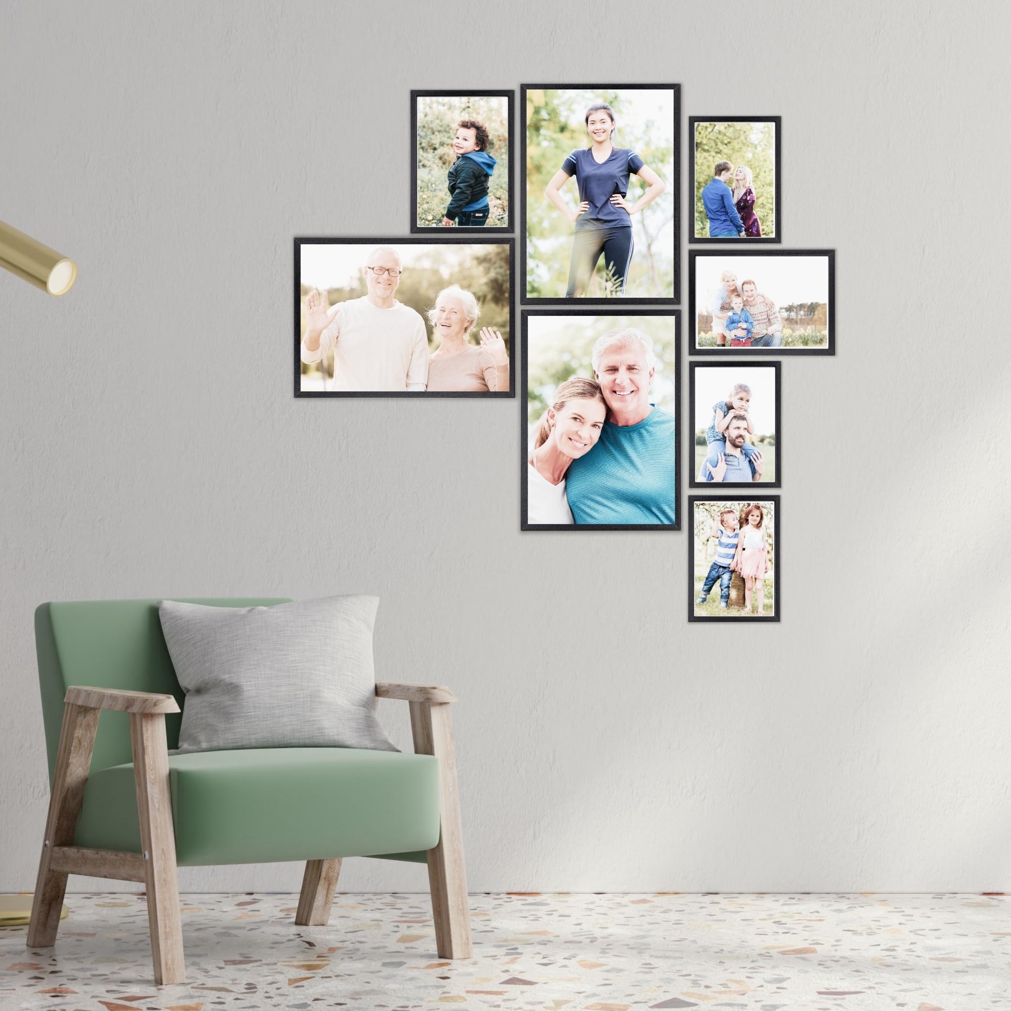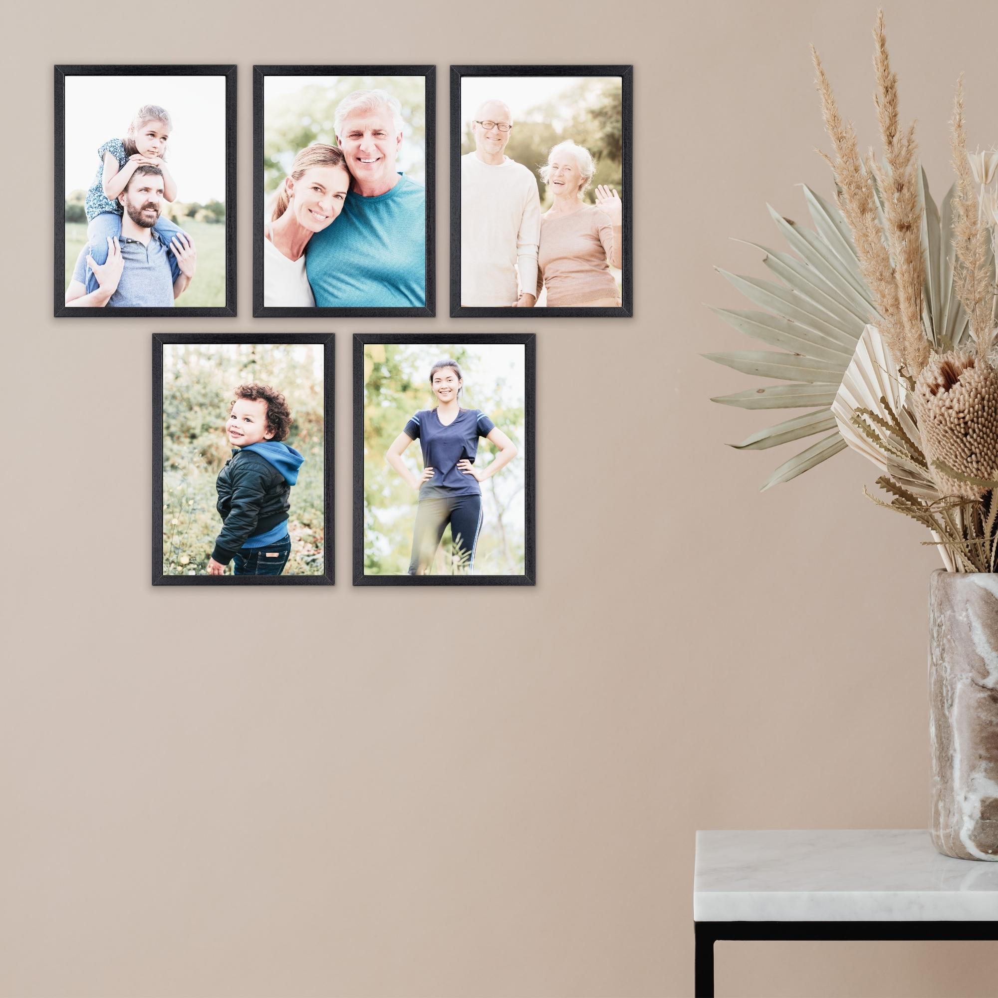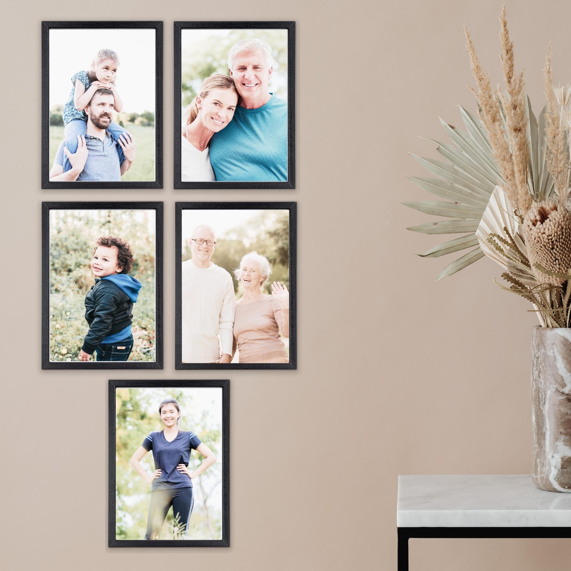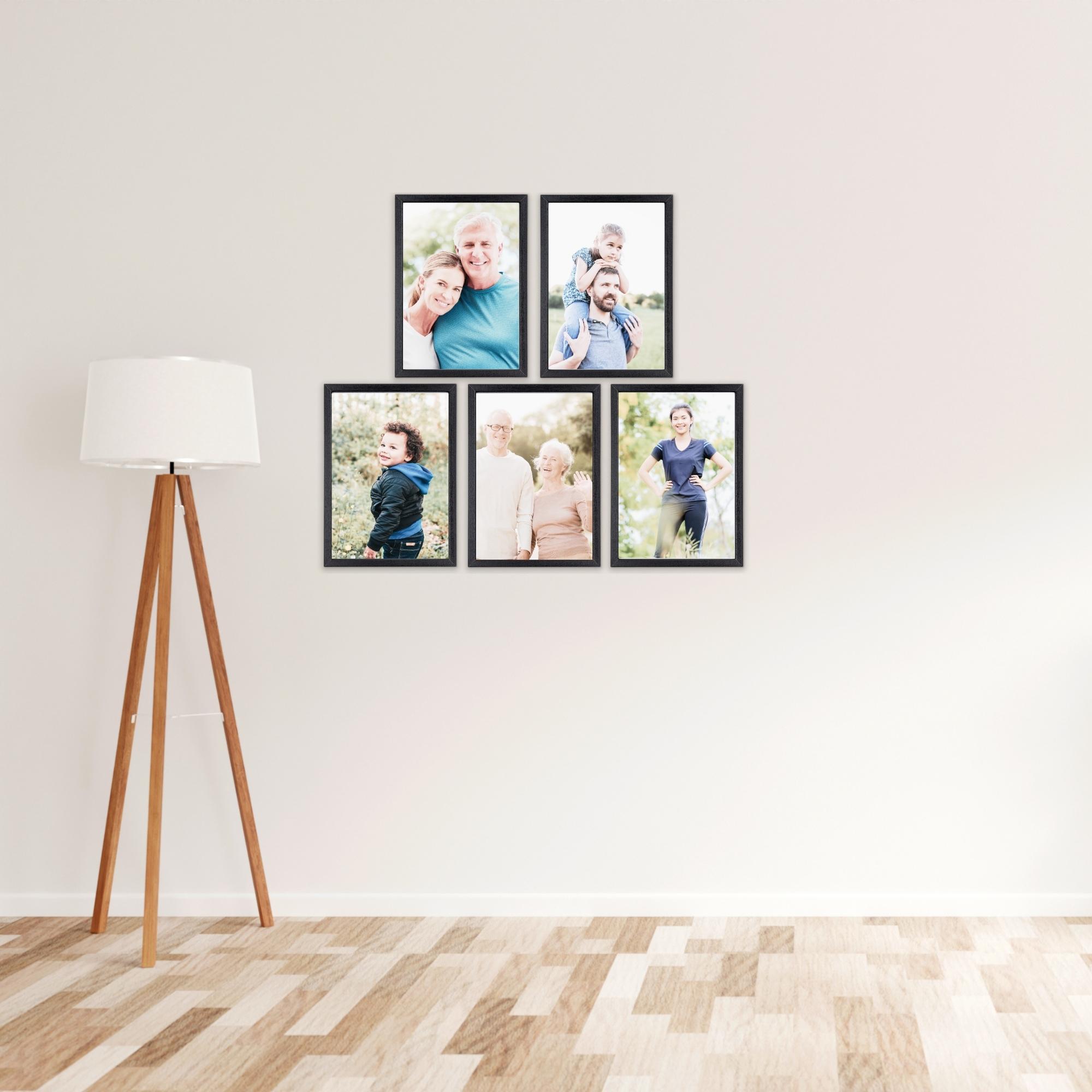 Set di Cornici in Legno Made in Italy da posizionare verticalmente e creare la vostra Parete Fotografica personale. Il set comprende una combinazione di cornici su misura con dimensione interna da scegliere per incorniciare le tue foto, stampe o poster, ma anche documenti, pergamene, diplomi ed attestati.