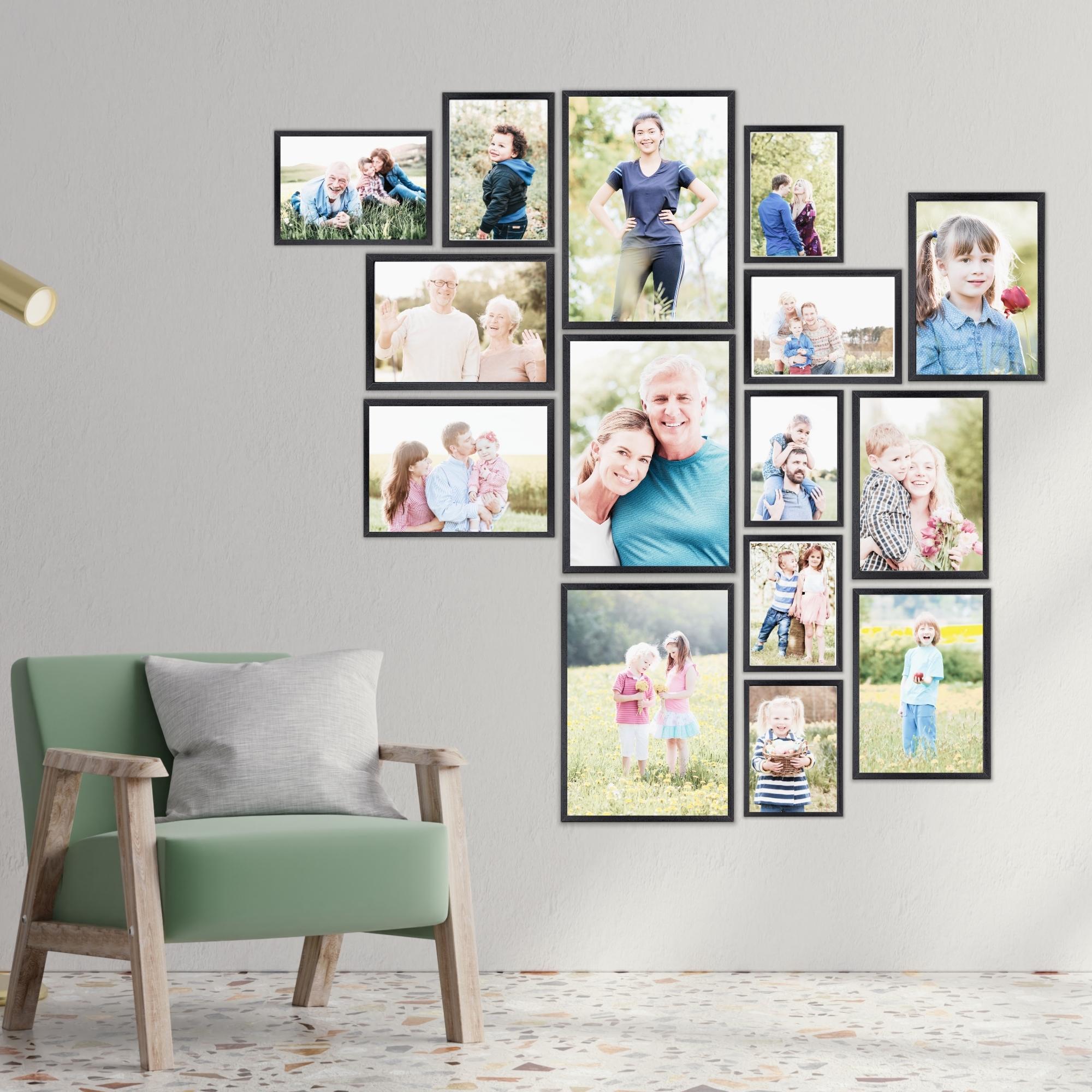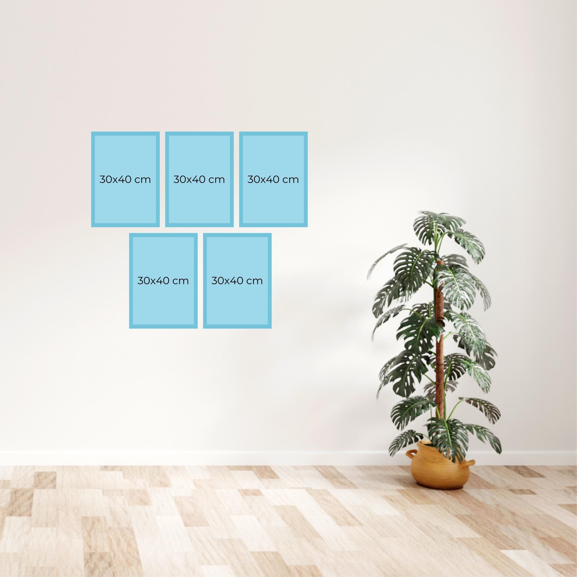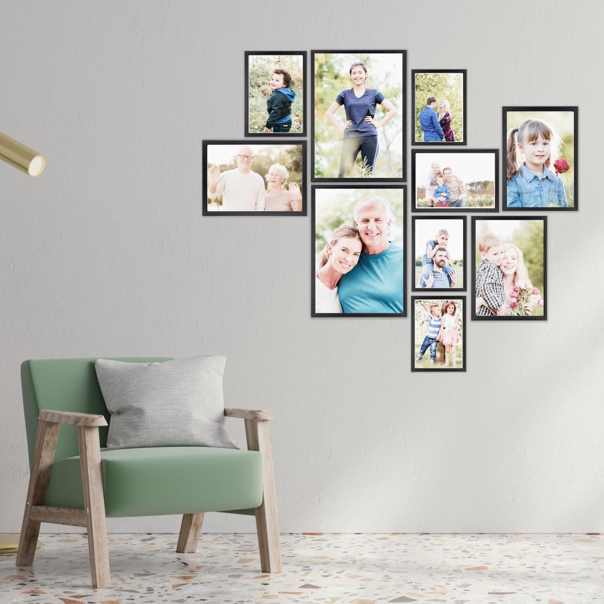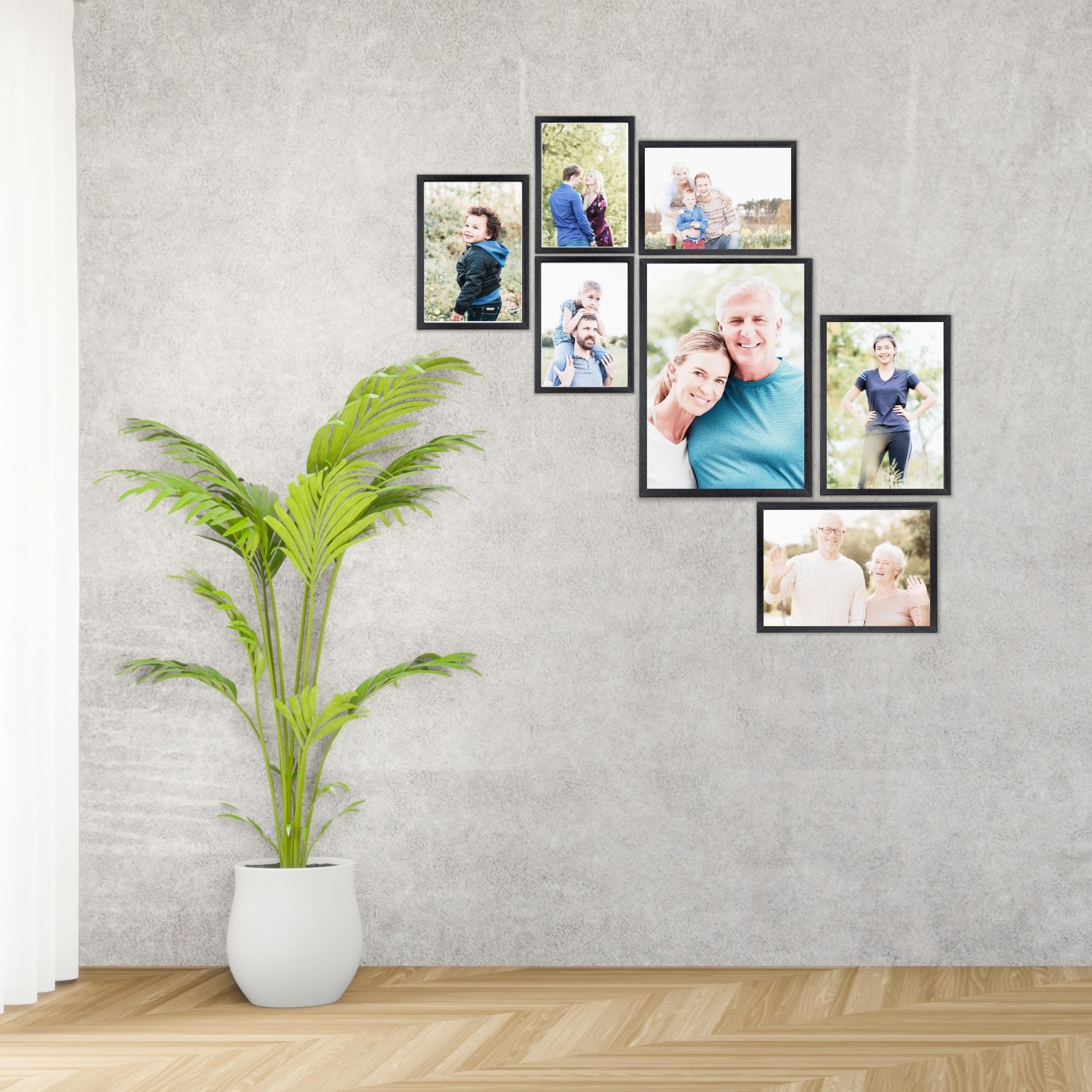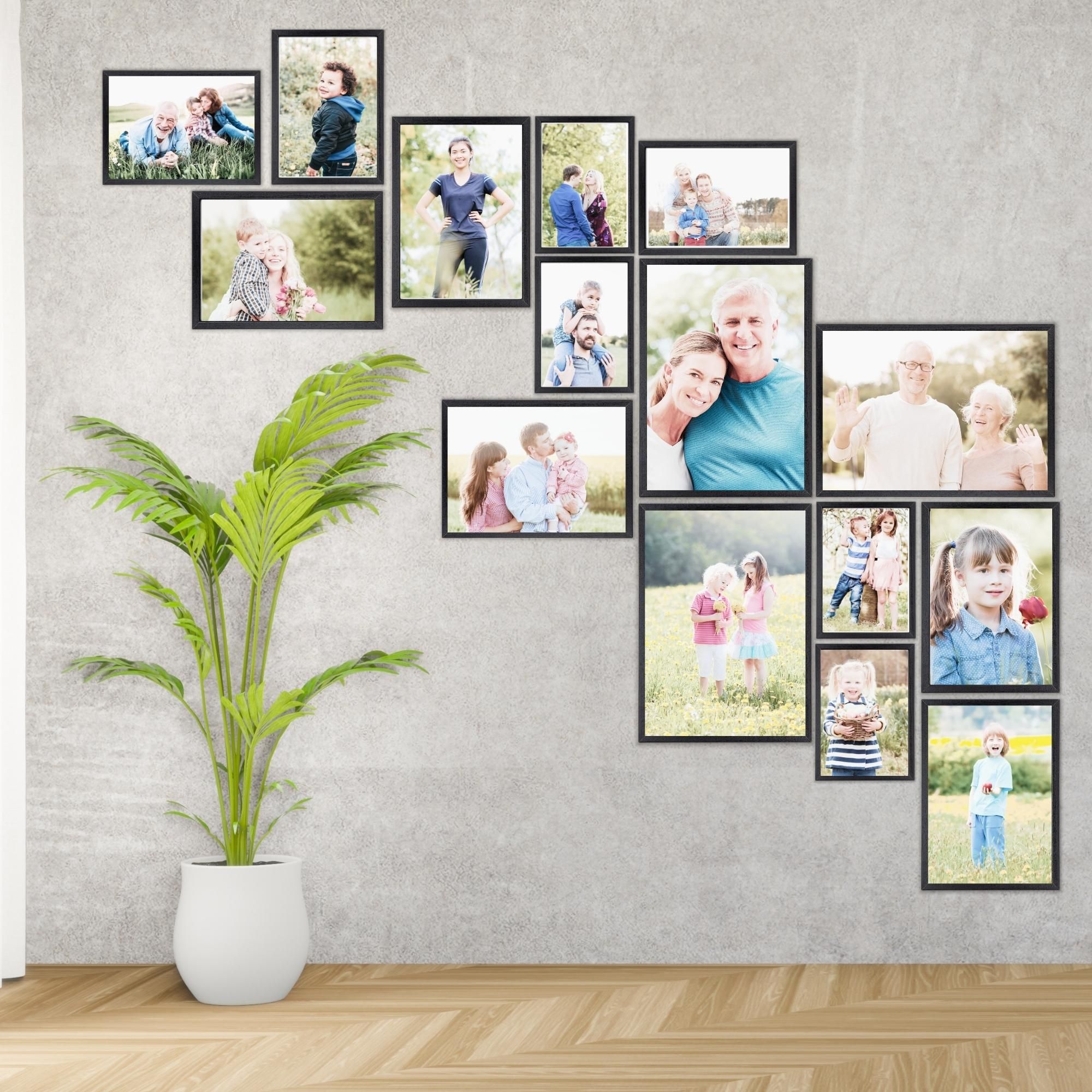 Set di Cornici in Legno Made in Italy da posizionare verticalmente e creare la vostra Parete Fotografica personale. Il set comprende una combinazione di cornici su misura con dimensione interna da scegliere per incorniciare le tue foto, stampe o poster, ma anche documenti, pergamene, diplomi ed attestati.