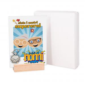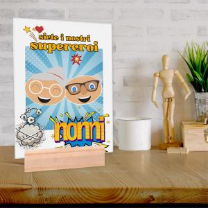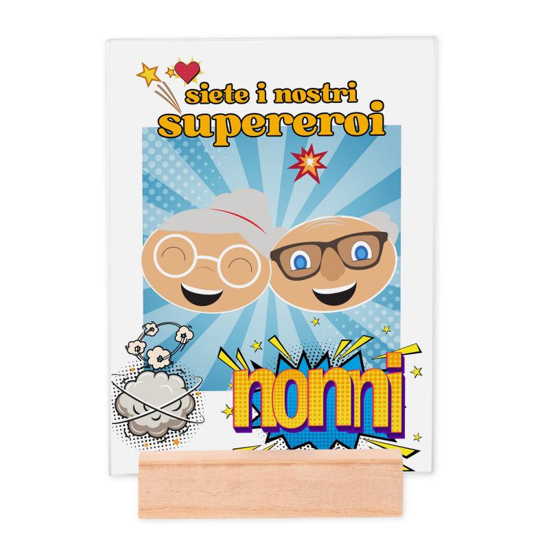 La struttura in legno naturale funge da piedino e supporto da tavolo, mentre il vetro protegge l’immagine da graffi e polvere, garantendo durabilita’ e qualita’ nel tempo. La grafica dedicata alla Festa dei Nonni, aggiunge un valore sentimentale, rendendolo un regalo ideale per dimostrare affetto e gratitudine in un giorno speciale.