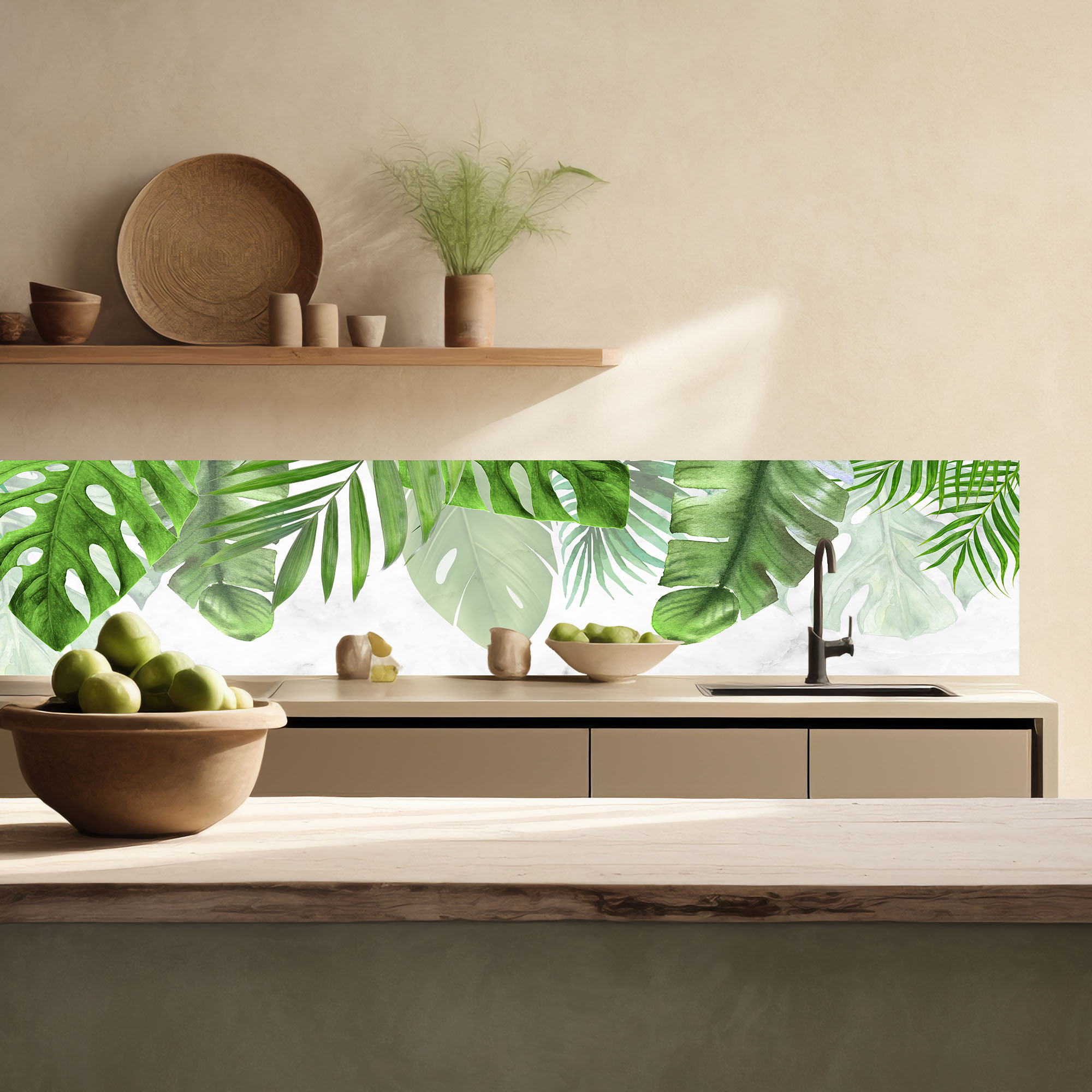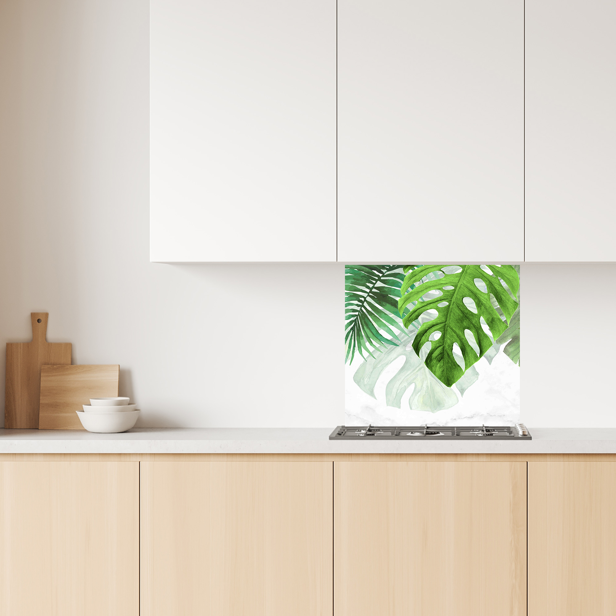 Il motivo moderno di foglie tropicali in verde acceso, combinato a uno sfondo bianco con delicate venature grigio chiaro, richiama l’eleganza di una savana lussureggiante. Le figure armoniose si accavallano, creando un effetto visivo di grande impatto, perfetto per una cucina moderna o minimalista. Ideale per decorare spazi monocolore, il paraschizzi cucina è un’utile barriera contro macchie, calore e umidità. Inoltre, la sua superficie liscia e priva di fughe semplifica la pulizia, eliminando le difficoltà di manutenzione tipiche delle piastrelle tradizionali.