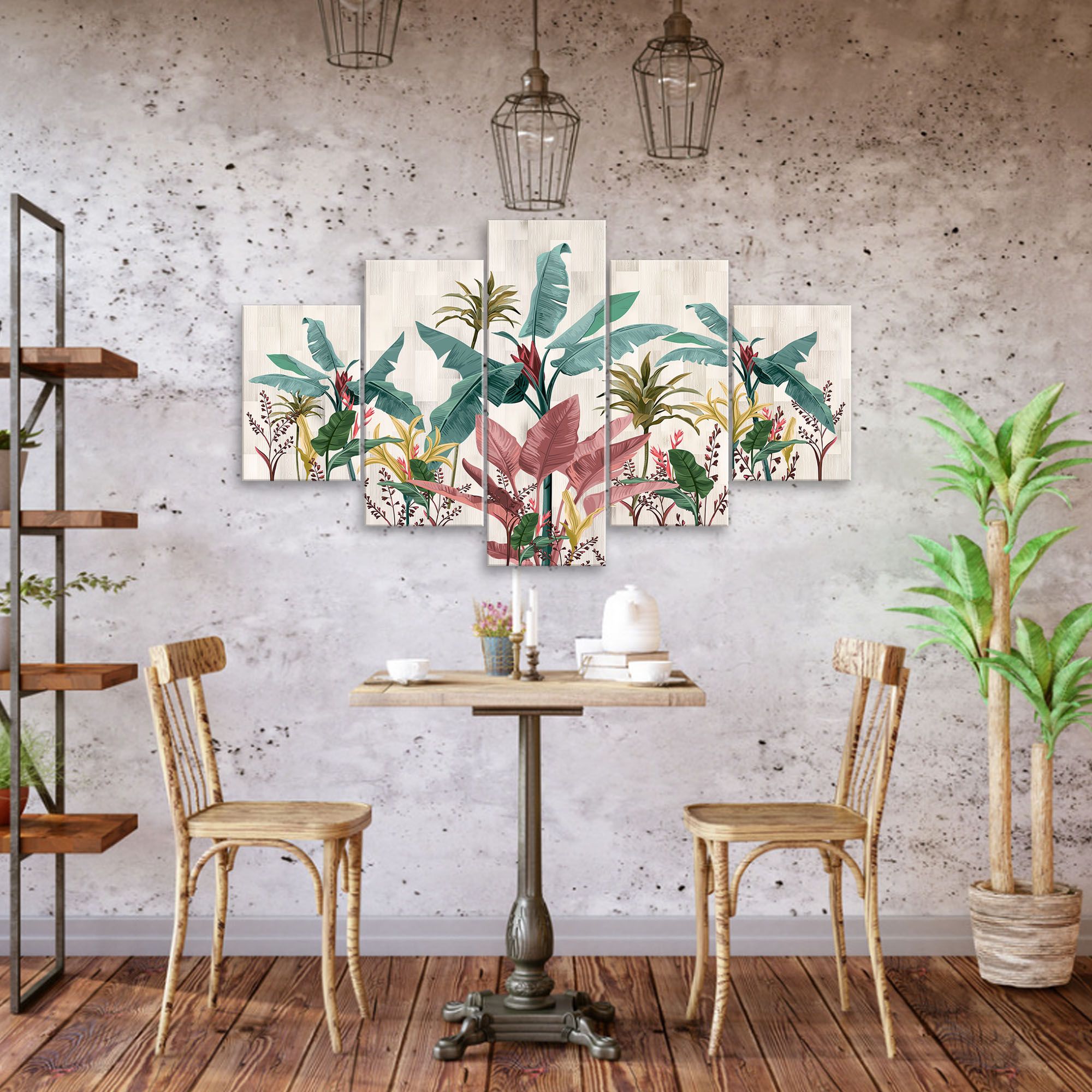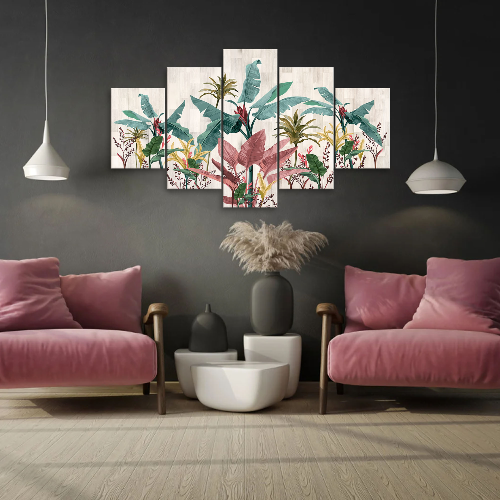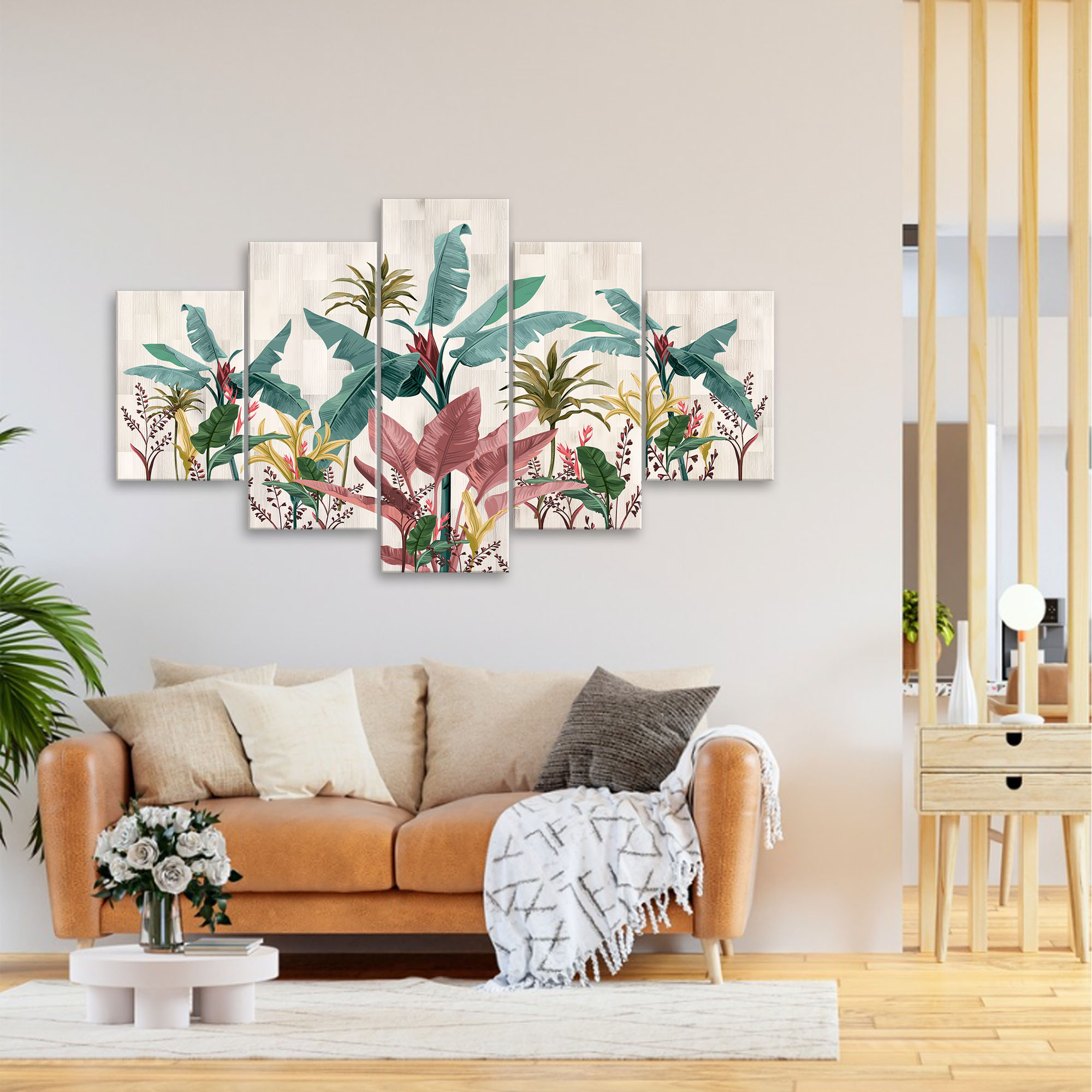 Lupia - Quadro Moderno VOGUE 66x115 cm BANANA LEAVES BEIGE a 5 Pezzi, Stampe Artistiche modulari e Digitali, Pannelli in Legno Ecologico MDF, Pronti da Appendere, Soggiorno e Camera da letto, Ufficio -
