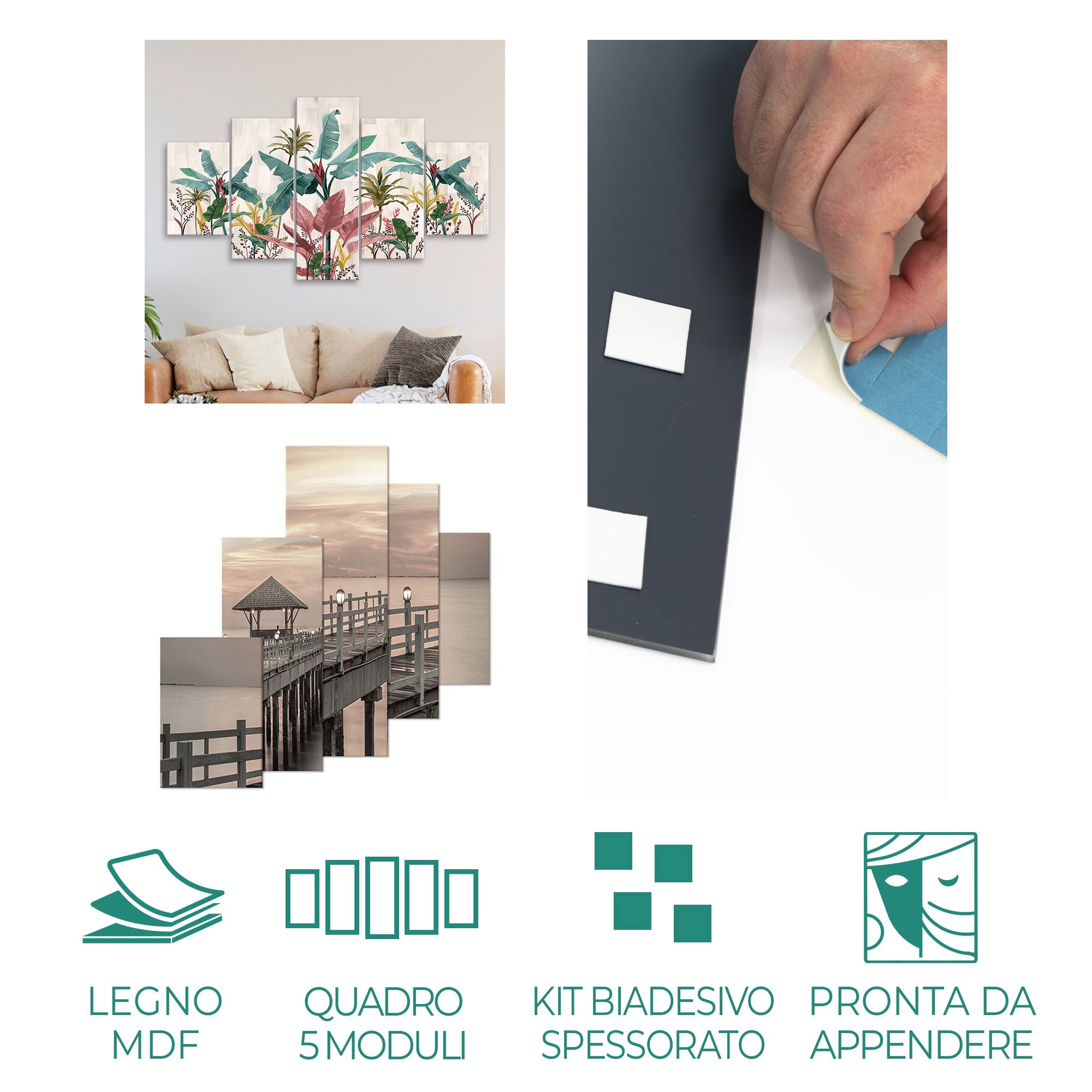 Scopri l'eleganza del Quadro Moderno 5 Pezzi in Legno Vogue 66X115 cm di Lupia. Questo capolavoro artistico e' composto da cinque pannelli in legno ecologico, per formare un'unica immagine mozzafiato. Con un design moderno e sofisticato, questo quadro e' ideale per arricchire qualsiasi ambiente, dal soggiorno alla camera da letto, fino a spazi commerciali come uffici e hotel.
