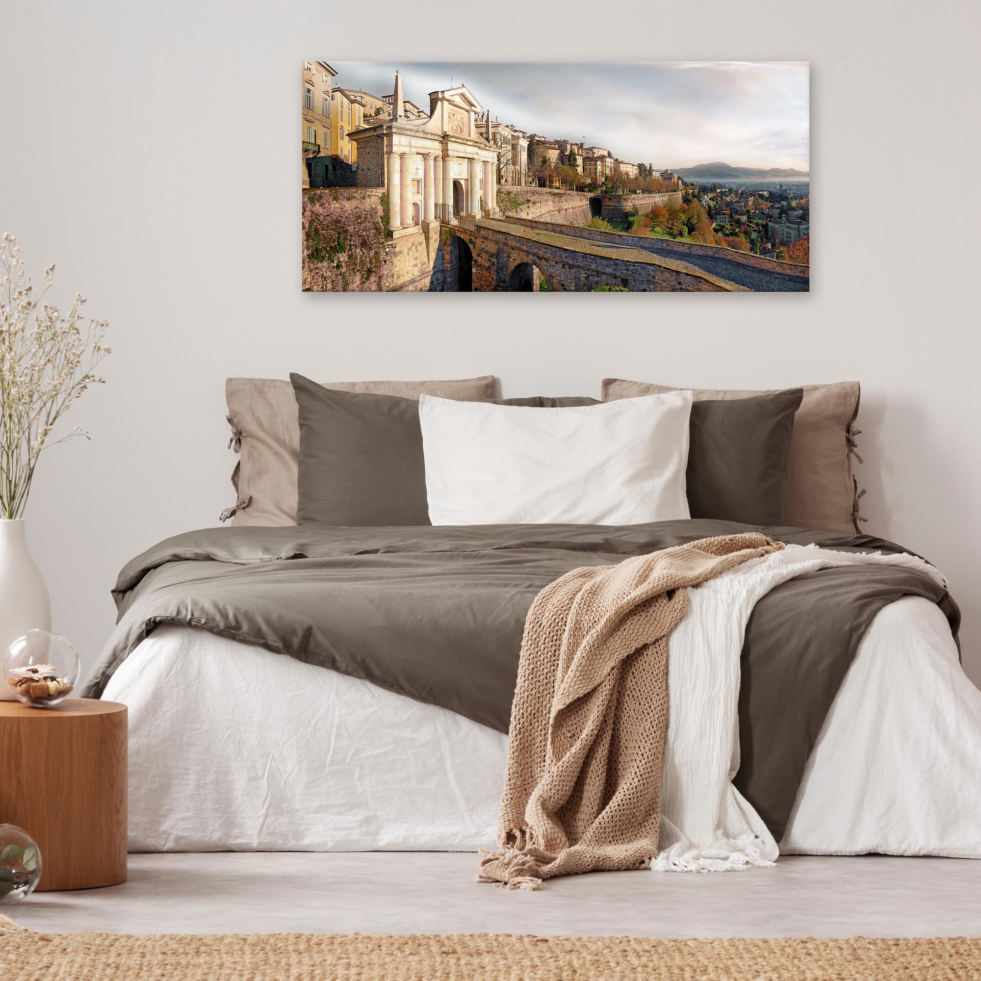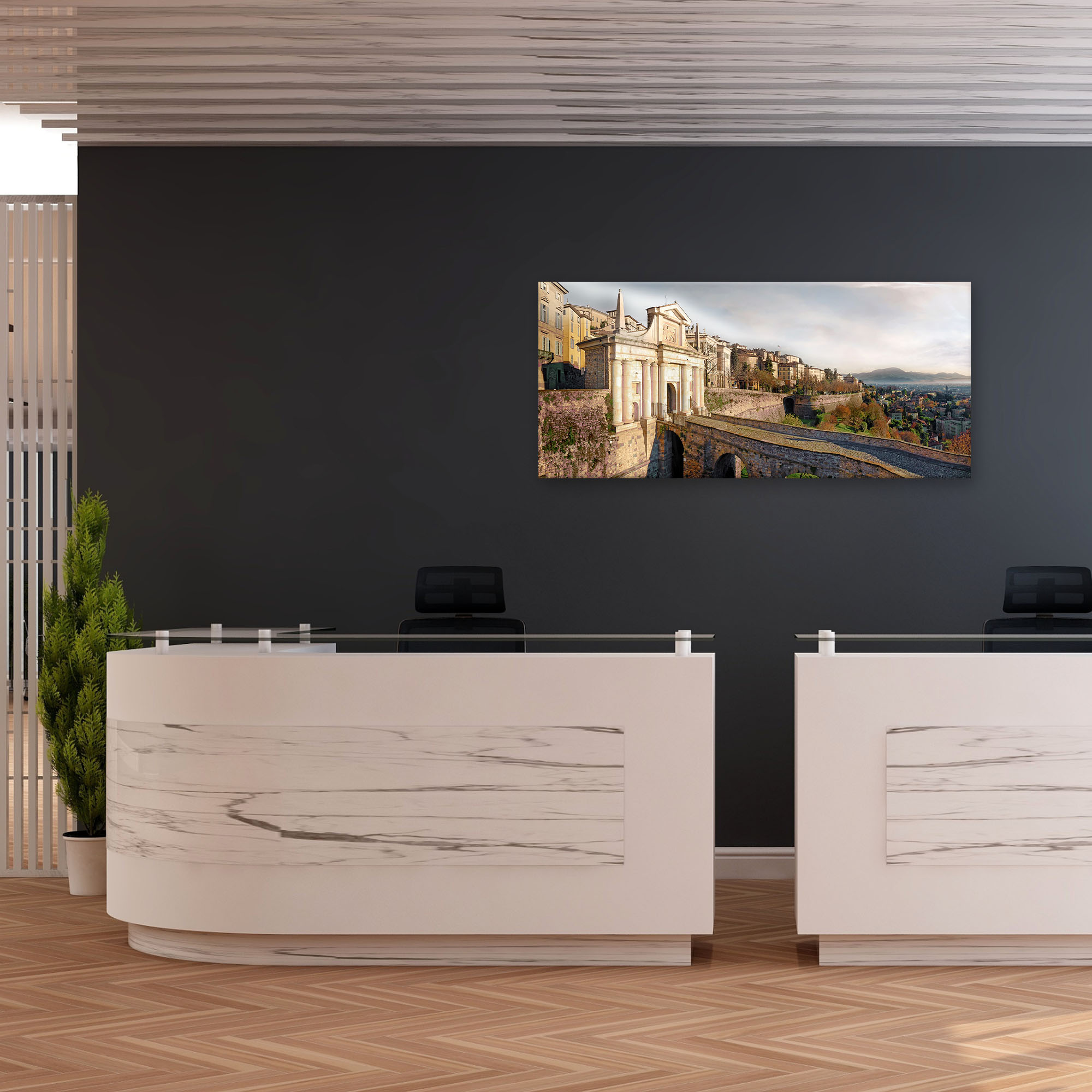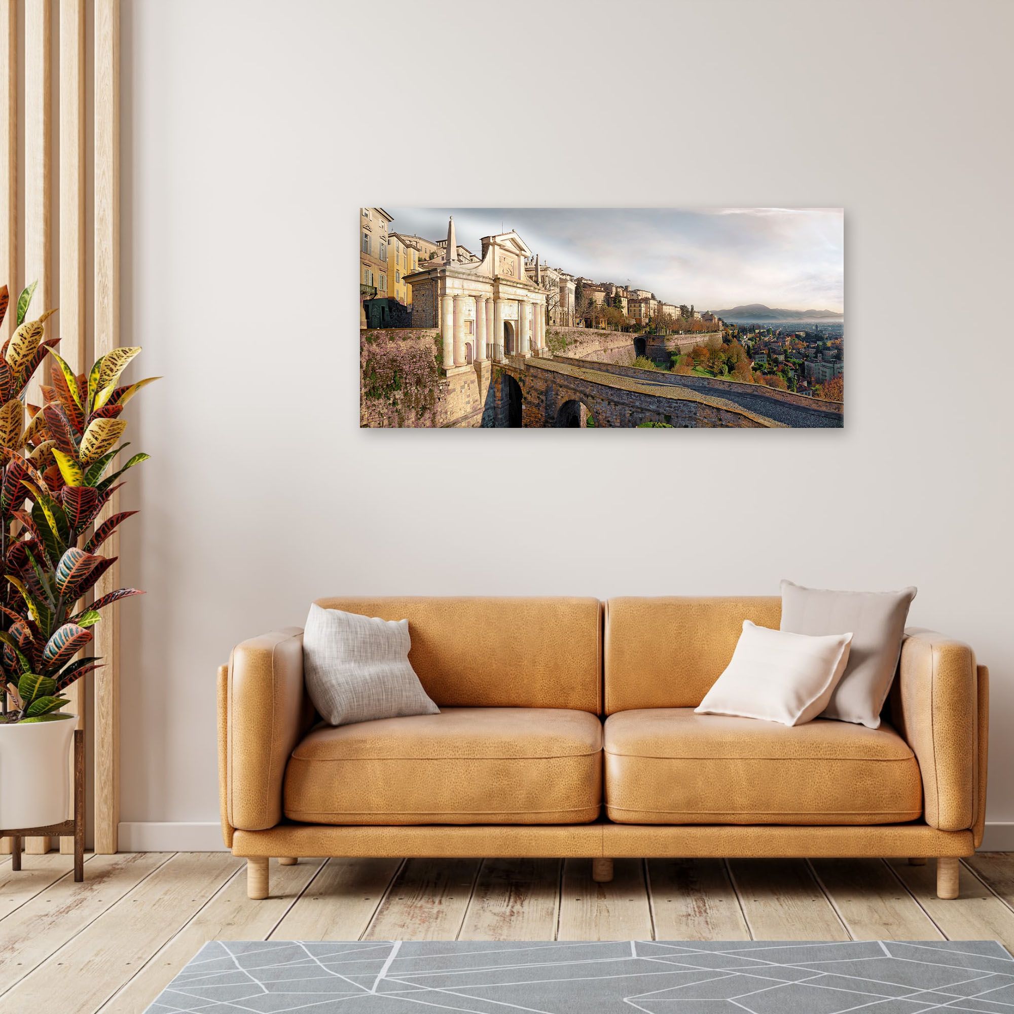 Lupia - Quadro moderno su Tela Canvas DEEP 65X143 cm, con paesaggi e localismi italiani, per casa, soggiorno, capezzale camera da letto, hotel, ufficio, BERGAMO - NEW PORTA S. GIACOMO PANORAMA -