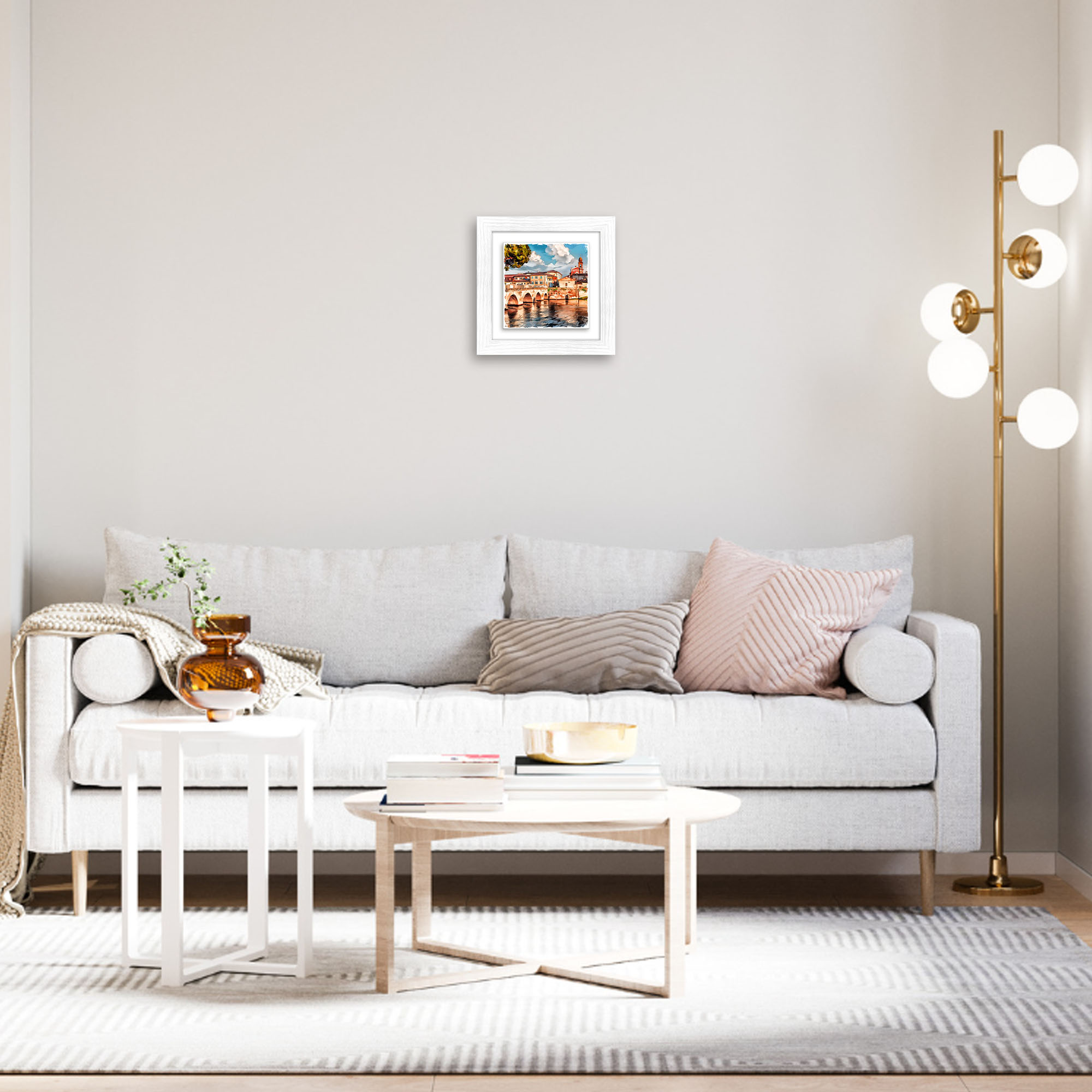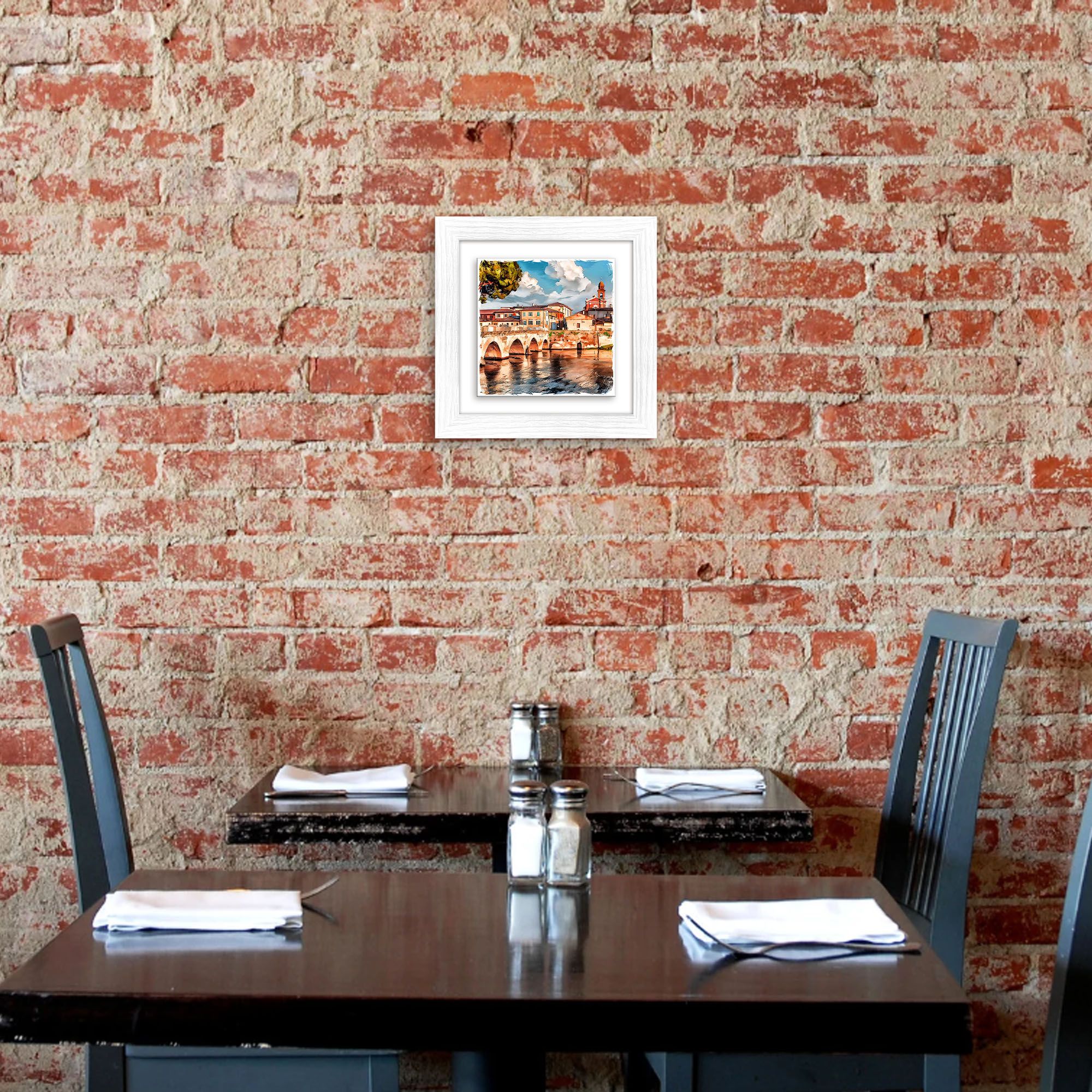 Lupia - Quadro moderno con paesaggi e localismi italiani, Ceramica e Stampa Rilievo, Cornice Legno Shabby Modern bianca, Decorazione Parete, Quadretti Soggiorno, 29x29 cm, RIMINI PONTE DI TIBERIO -