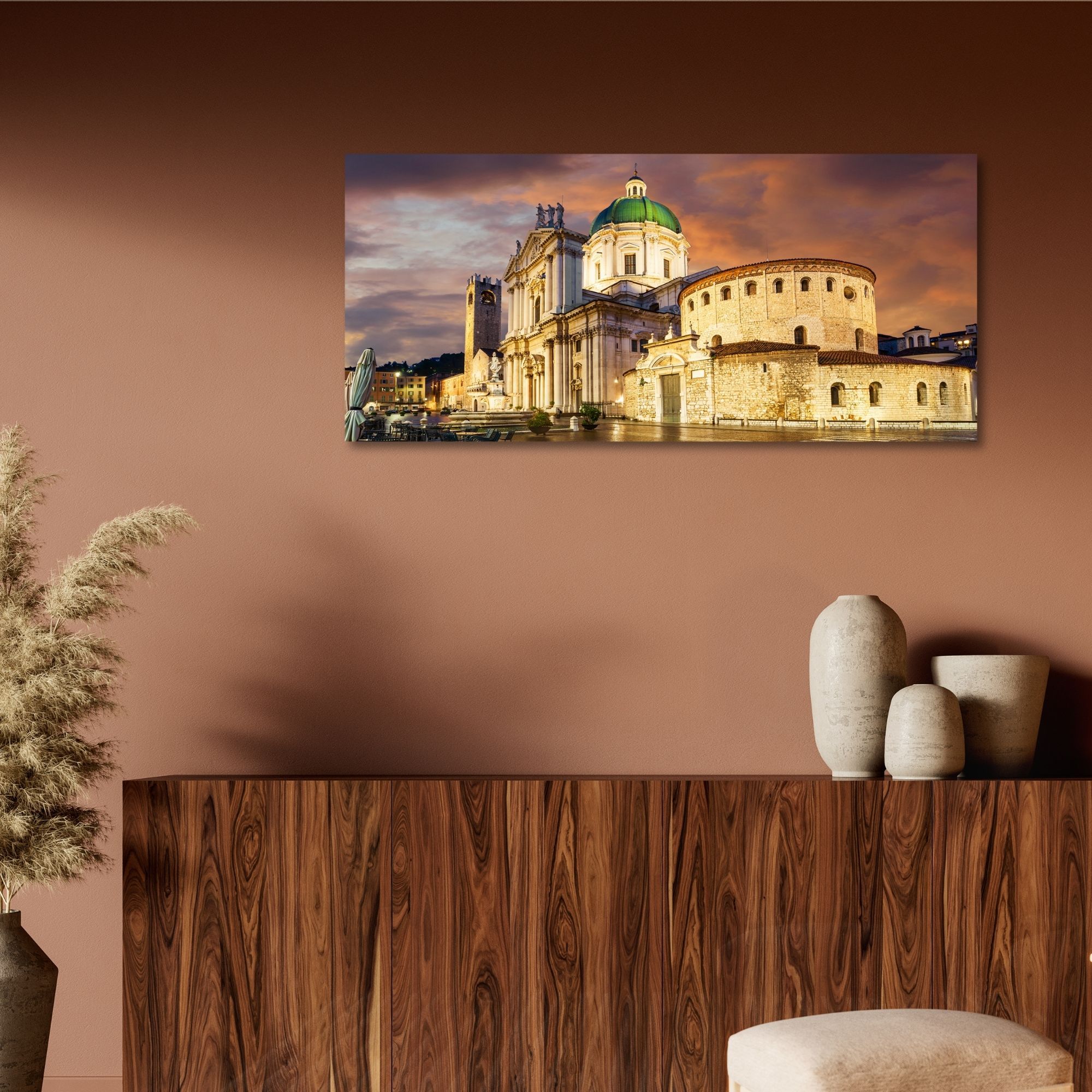 Lupia - Quadro moderno su Tela Canvas DEEP 65X143 cm, con paesaggi e localismi italiani, per casa, soggiorno, capezzale camera da letto, hotel, ufficio, BRESCIA - DUOMO NUOVO E VECCHIO -