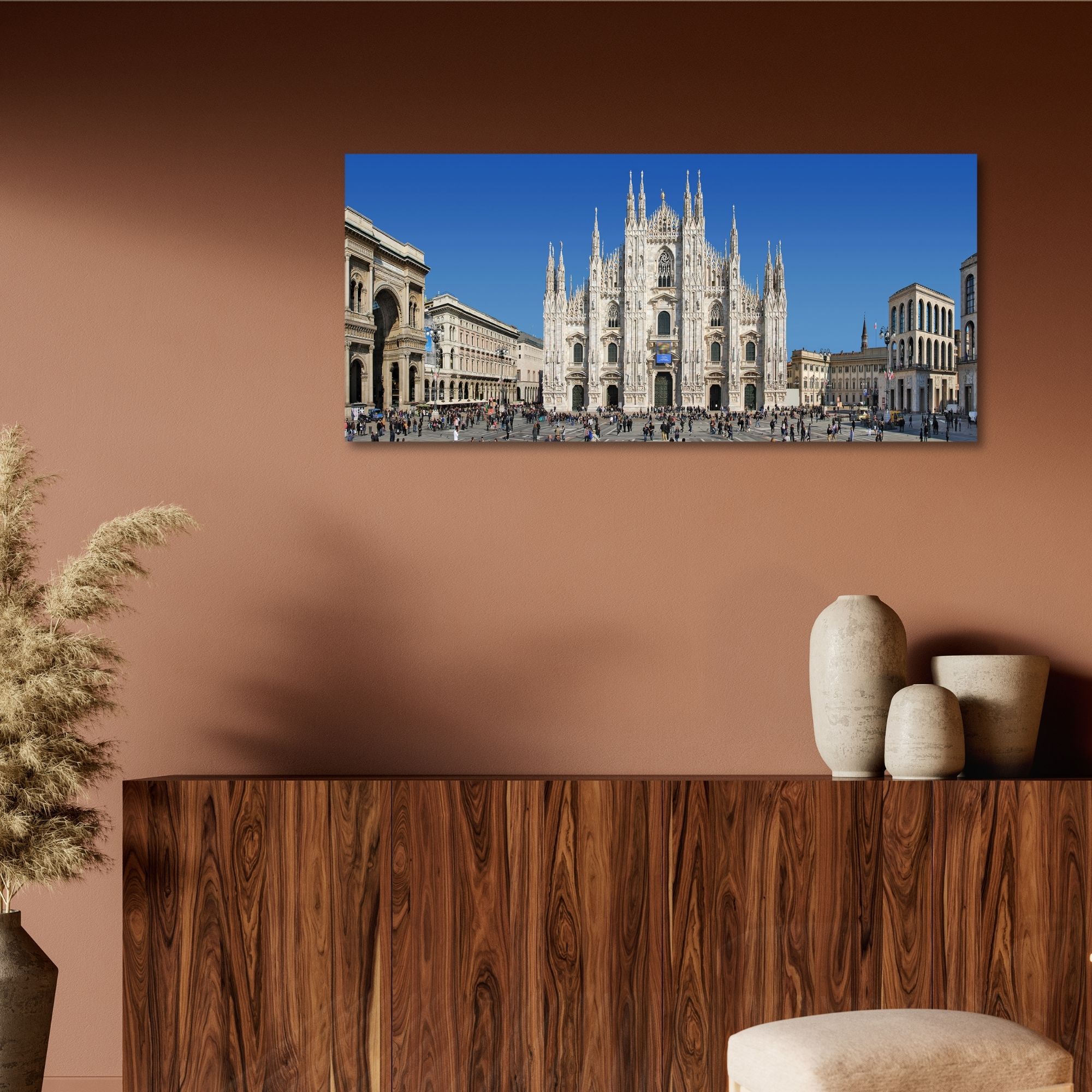 Il quadro moderno su tela canvas raffigura in maniera straordinaria il cuore pulsante di Milano: Piazza Duomo. Con un’accurata vista panoramica, quest'opera cattura ogni dettaglio della maestosa Cattedrale gotica, simbolo inconfondibile della città. La magnificenza del Duomo è arricchita dalla presenza dei celebri edifici circostanti. Risaltano il Museo del Novecento e la maestosa Galleria Vittorio Emanuele II, con il suo imponente arco che sovrasta la piazza.