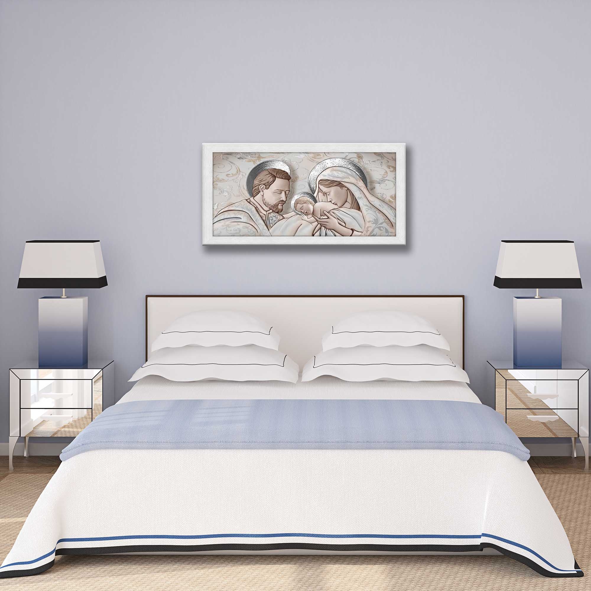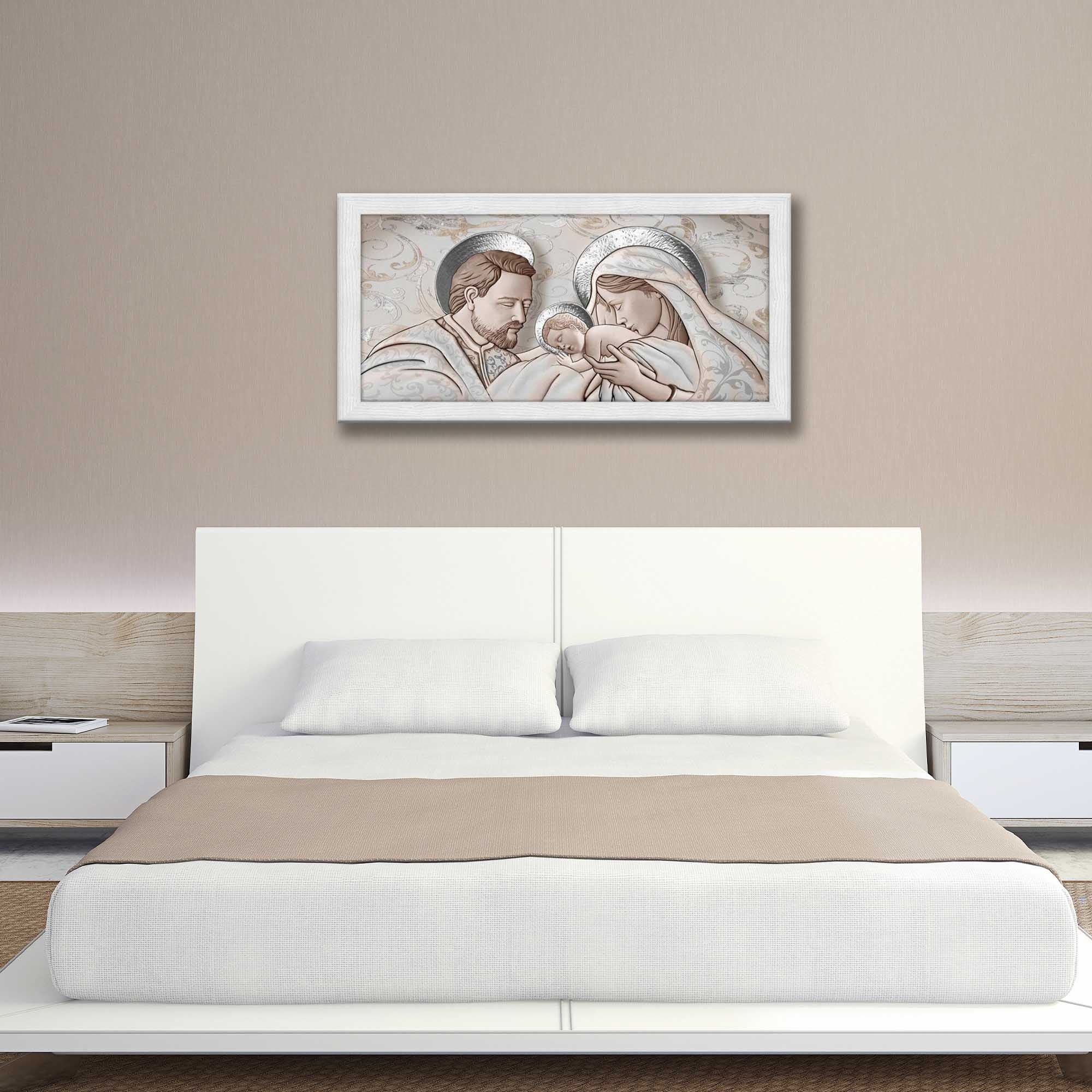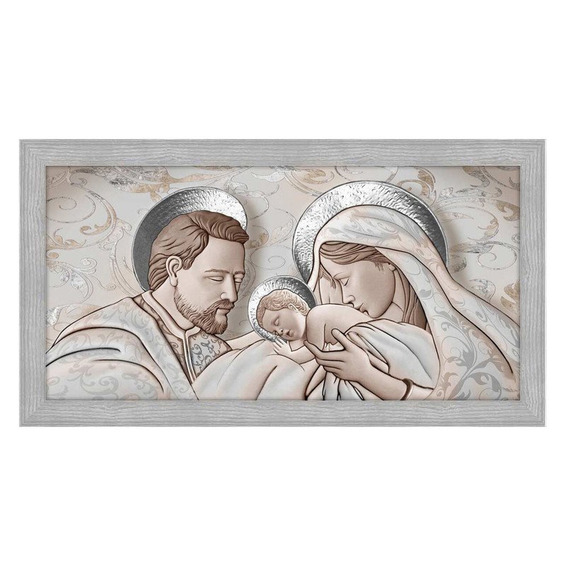 Quadro moderno Sacra Famiglia realizzato con una stampa su pannello in fibra di legno, impreziosito dalla sua cornice Boston semi intagliata di un elegante grigio chiaro. Si adatta perfettamente a qualsiasi ambiente domestico e non, e con ogni tipo di arredamento: può essere facilmente esposto in soggiorni, camere da letto, cucine e salotti, dallo stile moderno, classico o tradizionale.