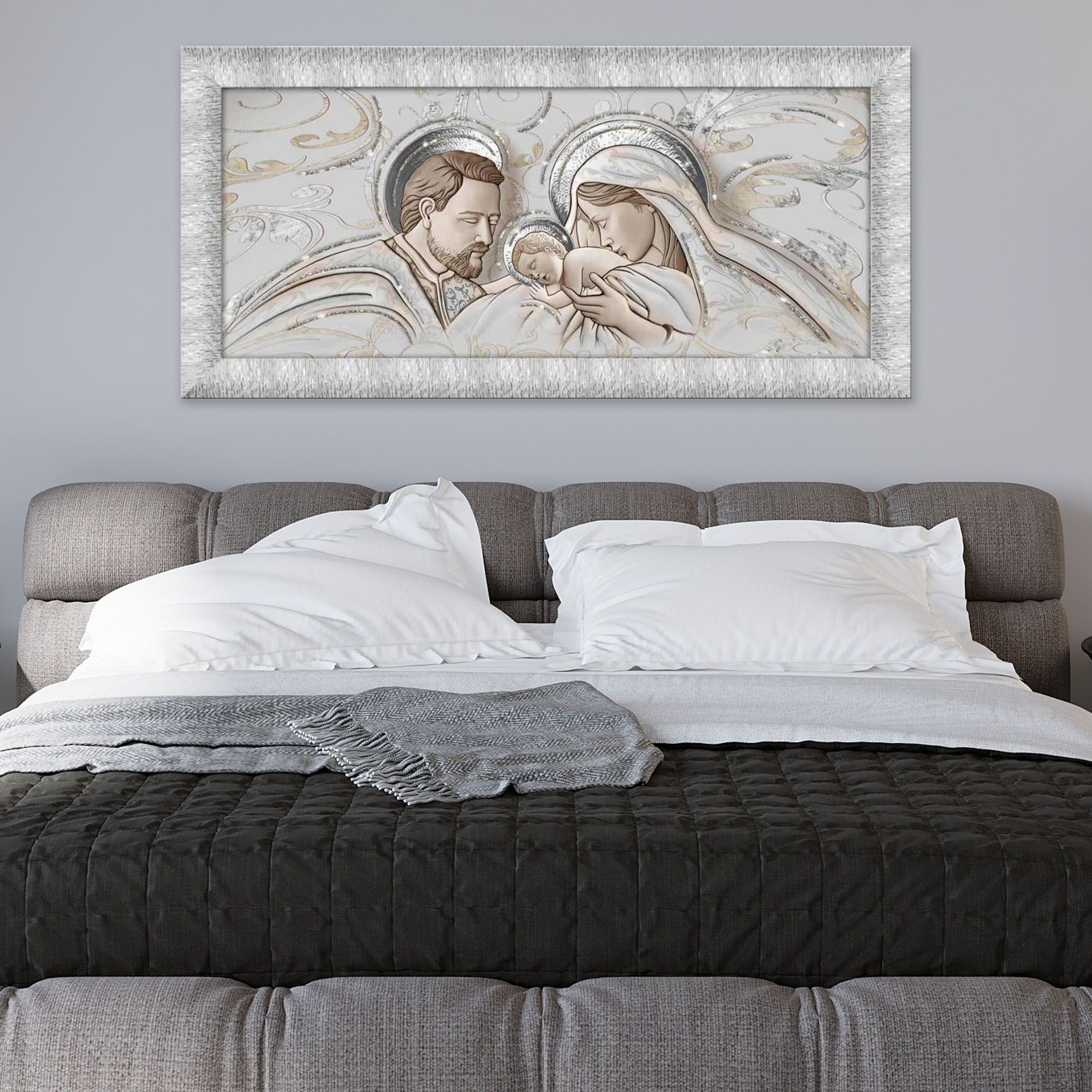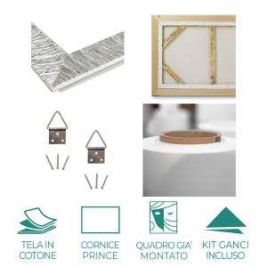 La cornice PRINCE in Argento Silver oppure Oro Glod con spessore di 3 cm e larghezza di 7 cm valorizza la grafica e dona profondità alla stampa, rendendo il quadro una vera e propria opera decorativa da parete. L’opera è pronta da appendere: non sono richieste installazioni complesse. Il tutto rigorosamente Made in Italy, con cura artigianale.