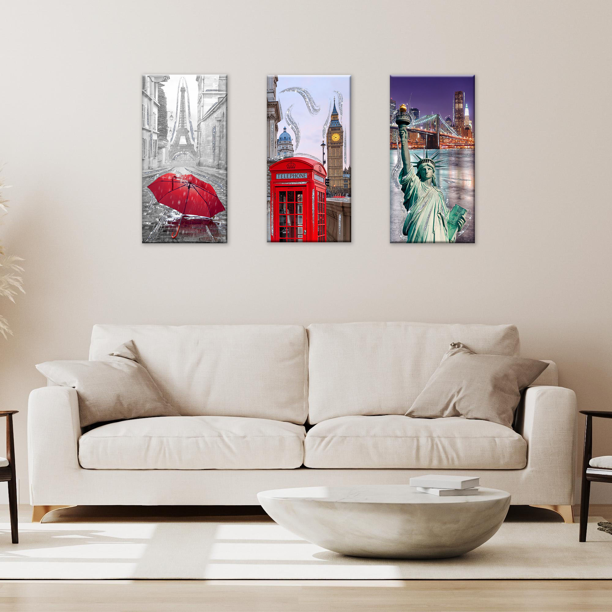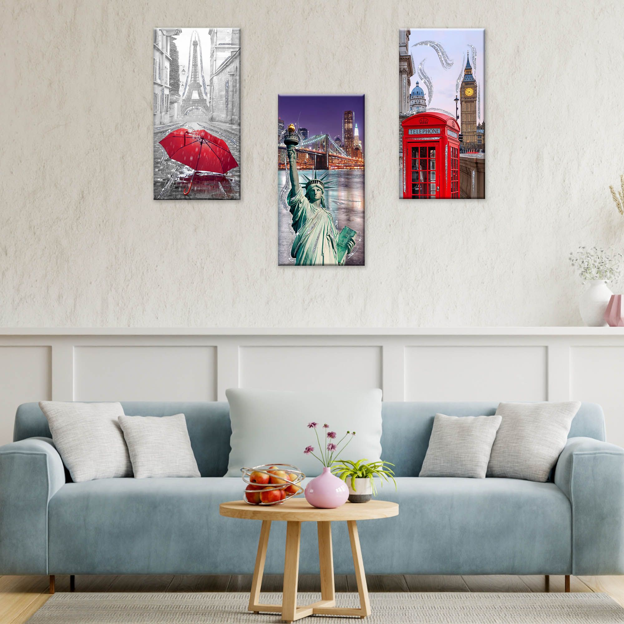 Set 3 pezzi Quadri su tela Canvas Day Brillant con glitter NEW CITY 38x75 cm, tema città del mondo, per soggiorno, capezzale camera da letto, cucina -