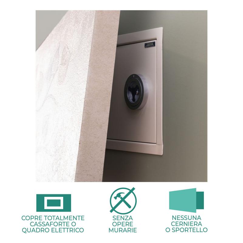 Questo elemento decorativo permette di celare in modo discreto e raffinato elementi poco gradevoli alla vista, come quadri elettrici, modem, contatori o casseforti.