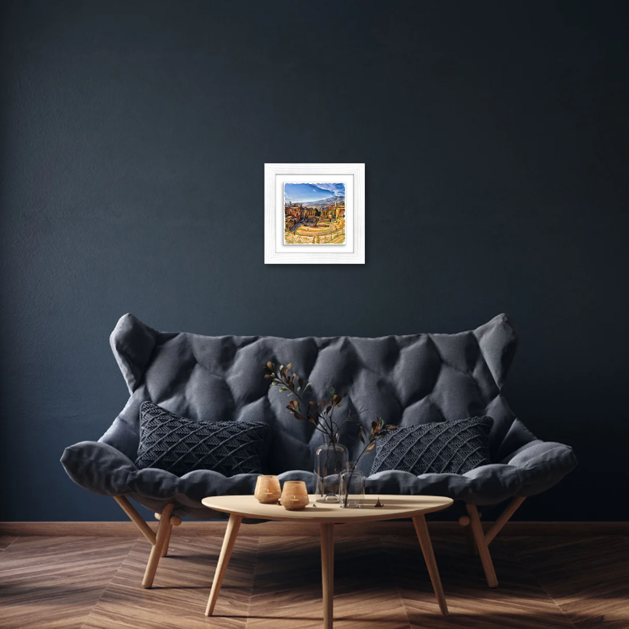 Lupia - Quadro moderno con paesaggi e localismi italiani, Ceramica e Stampa Rilievo, Cornice Legno Shabby Modern bianca, Decorazione Parete, Quadretti Soggiorno, 29x29 cm, CATANIA TEATRO TAORMINA -