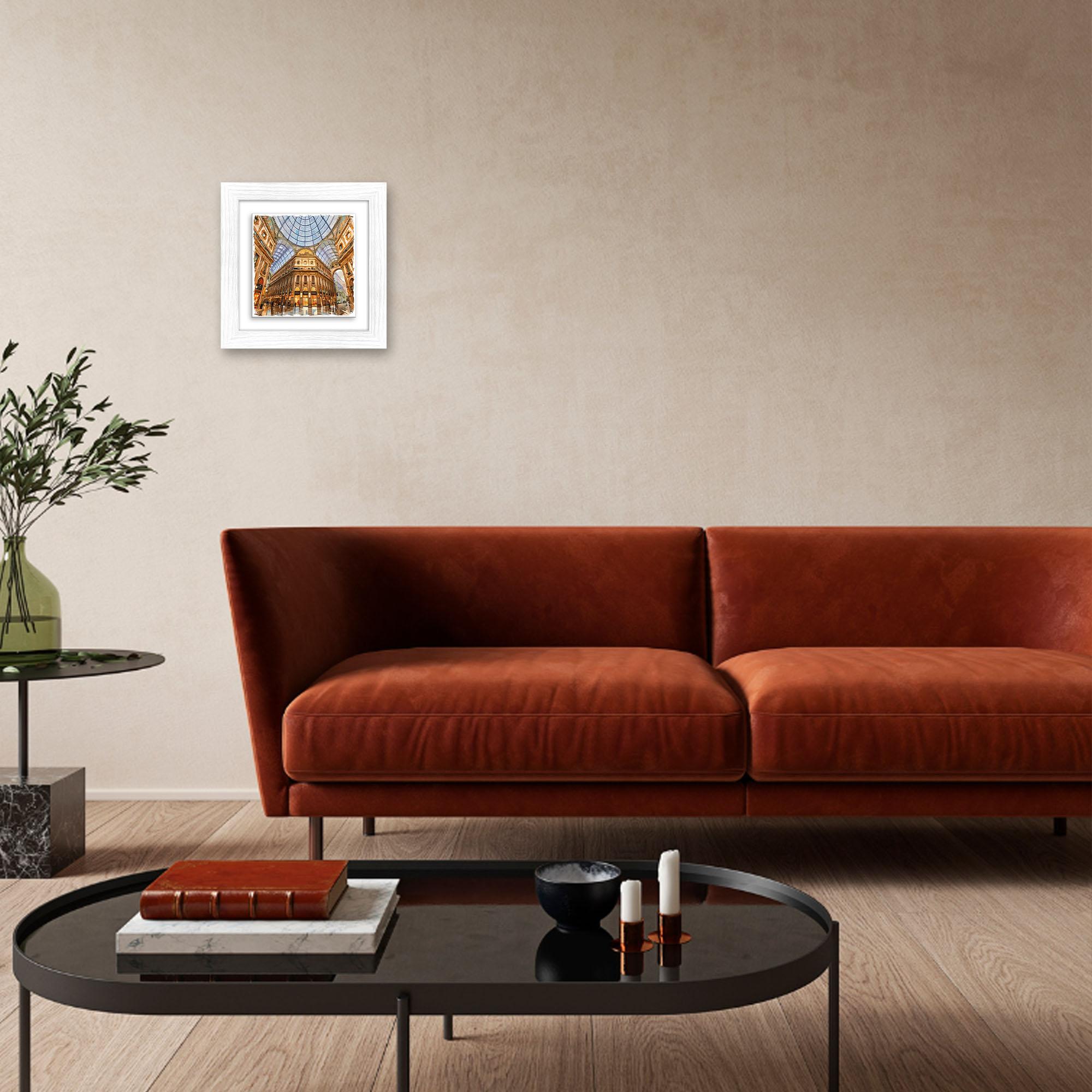 Lupia - Quadro moderno con paesaggi e localismi italiani, Ceramica e Stampa Rilievo, Cornice Legno Shabby Modern bianca, Decorazione Parete, Quadretti Soggiorno, 29x29 cm MILANO GALLERIA VITT.EMANUELE -