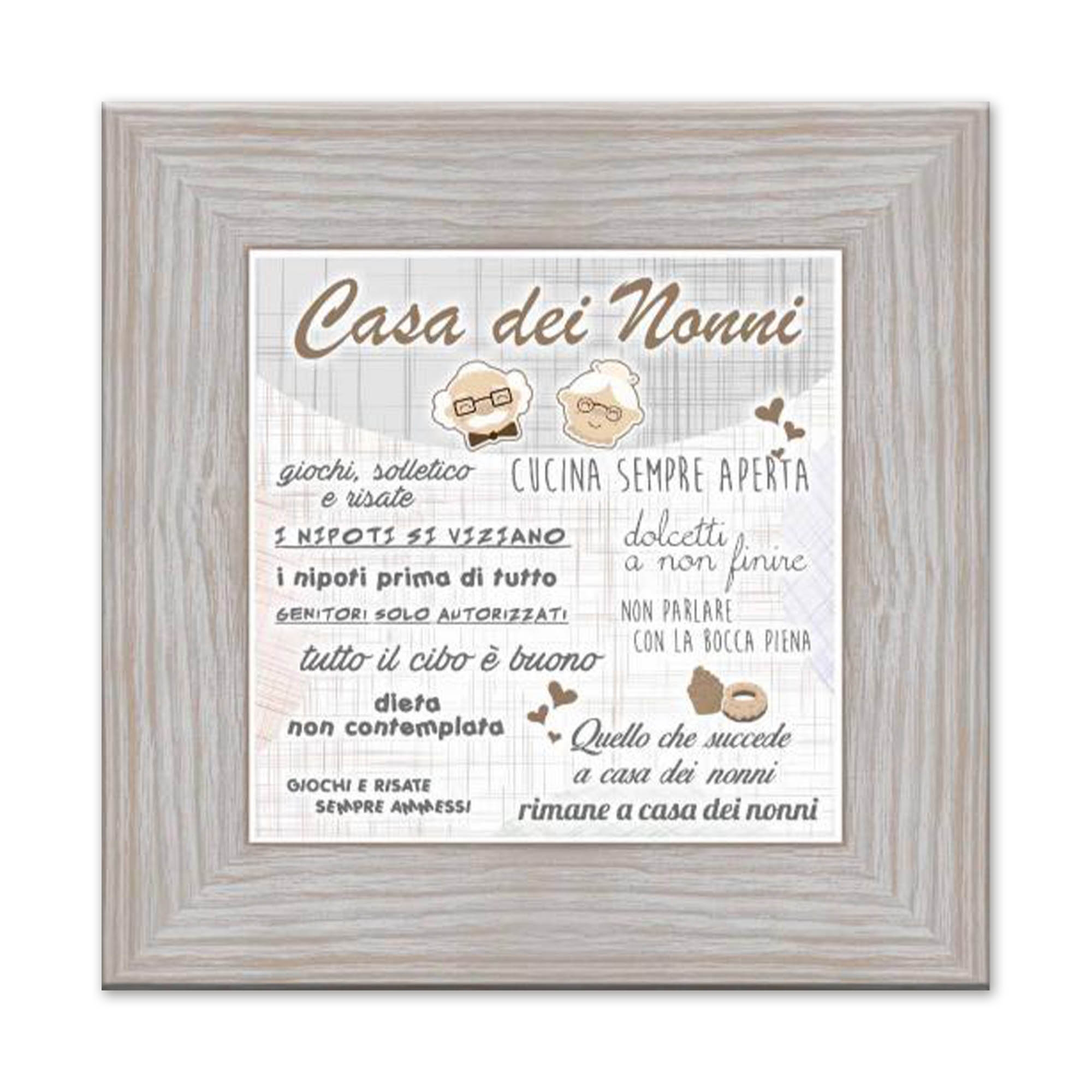 Quadro con decorazione a tema dei Nonni della Linea Ceramic con mattonella di vera Ceramica decorata con stampa caratterizzata da colori profondi e vividi, impreziositi da una cornice Shabby Boston. Colleziona tutti i nostri quadri in ceramica, e’ una nuova idea regalo per ricorrenze ed eventi come compleanni, onomastici, anniversari e in onore della festa dei nonni. La cornice del quadro e’ realizzata in legno con venature Shabby ha una larghezza di 5 cm con venature su tutto il profilo della cornice e uno spessore di ben 1,4 cm sulla parete, puoi appendere il quadro per decorare la tua parete grazie al pratico foro sul retro. Abbellisci la parete dietro al tuo divano o in cucina, corridoio, ufficio, ingresso, bagno oppure in camera da letto. Realizzato completamente in Italia e le dimensioni totali del prodotto sono 30x30 cm.