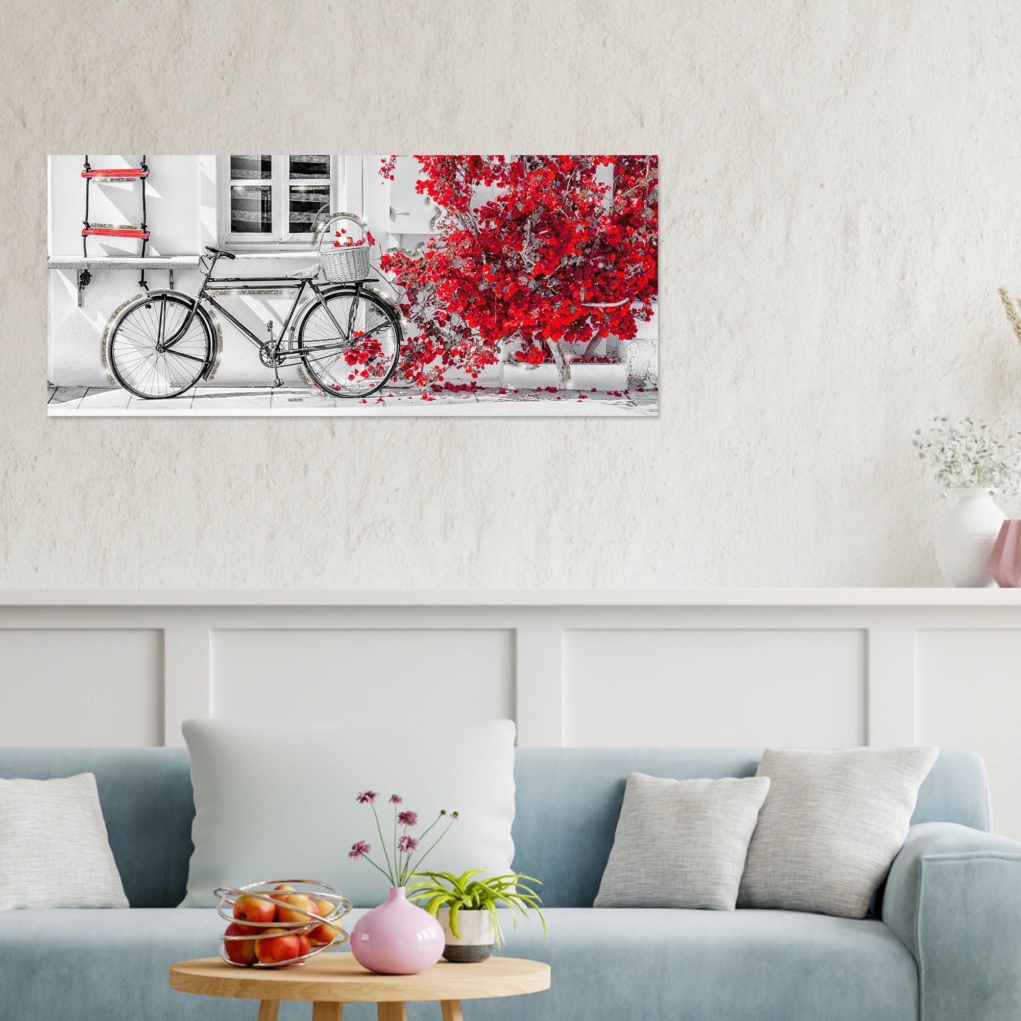 Lupia - Quadro Moderno BRILLANT con Glitter BIKE BOUGANVILLE RED | Stampa su Tela Poliestere | Decorazione Artigianale Italiana, Arte da Parete per Soggiorno e Ufficio | 65x149 cm, telaio Legno -
