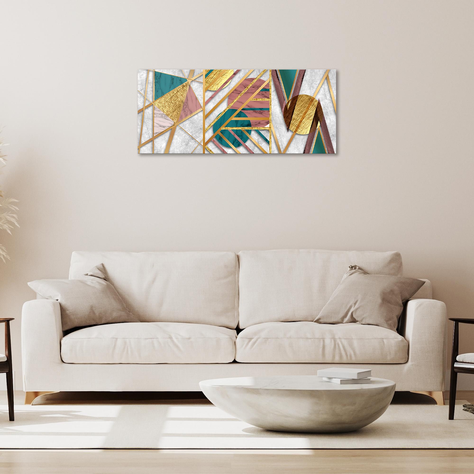 Quadro moderno Canvas World, una rappresentazione con stampa su tela pvc, con telaio in fibra di legno ecologica spesso 1,6 cm, gia’ montata, pronto da appendere facilmente. Sono stampe artistiche digitali ad alta risoluzione con tema moderno con geometrie astratte nelle tonalita' del verde, rosa e oro, una tela ricca di colori vividi e di fattura esclusivamente artigianale realizzata completamente in Italia. Il quadro dona un tocco di arte e colore alla tua parete. Un’idea originale per decorare le pareti della tua casa come soggiorno, camera da letto, in cucina, bagno, sale da pranzo, o di tutti i tuoi ambienti anche non domestici, come ufficio, Hotel, bar, negozio o laboratorio, perché sono adatte a qualsiasi tipologia di stile e arredamento. Per dare ancora piu' importanza al prodotto il bordo e' decorato sui colori della tela quindi viene data continuazione alla stampa ingrandendo cosi' l’ottimo effetto visivo del quadro. La dimensione totale del prodotto e' 52x122 cm.
