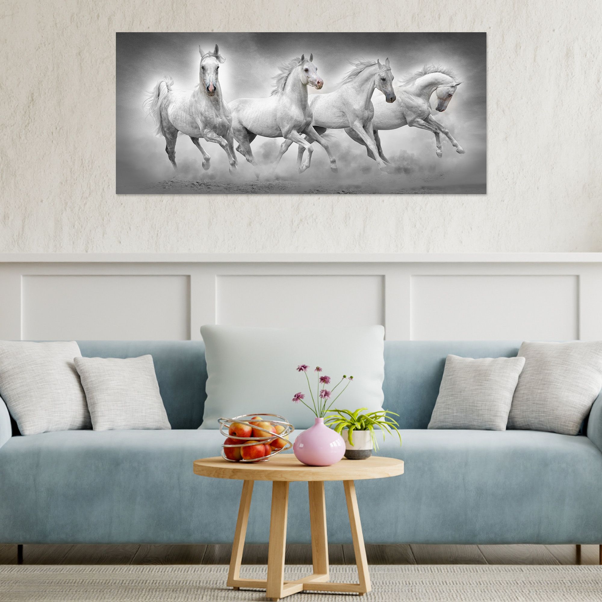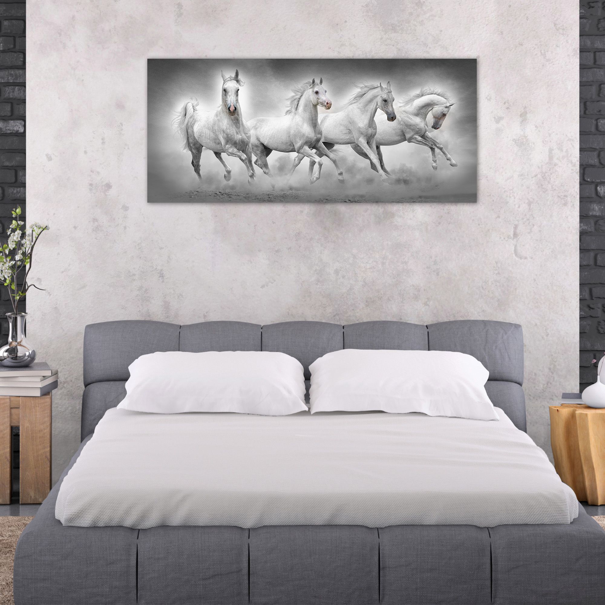 Quadro moderno Canvas World, una rappresentazione con stampa su tela pvc, con telaio in fibra di legno ecologica spesso 1,6 cm, gia’ montata, pronto da appendere facilmente. Sono stampe artistiche digitali ad alta risoluzione con tema natura con cavalli, una tela ricca di colori vividi e di fattura esclusivamente artigianale realizzata completamente in Italia. Il quadro dona un tocco di arte e colore alla tua parete. Un’idea originale per decorare le pareti della tua casa come soggiorno, camera da letto, in cucina, bagno, sale da pranzo, o di tutti i tuoi ambienti anche non domestici, come ufficio, Hotel, bar, negozio o laboratorio, perché sono adatte a qualsiasi tipologia di stile e arredamento. Per dare ancora piu' importanza al prodotto il bordo e' decorato sui colori della tela quindi viene data continuazione alla stampa ingrandendo cosi' l’ottimo effetto visivo del quadro. La dimensione totale del prodotto e' 52x122 cm.