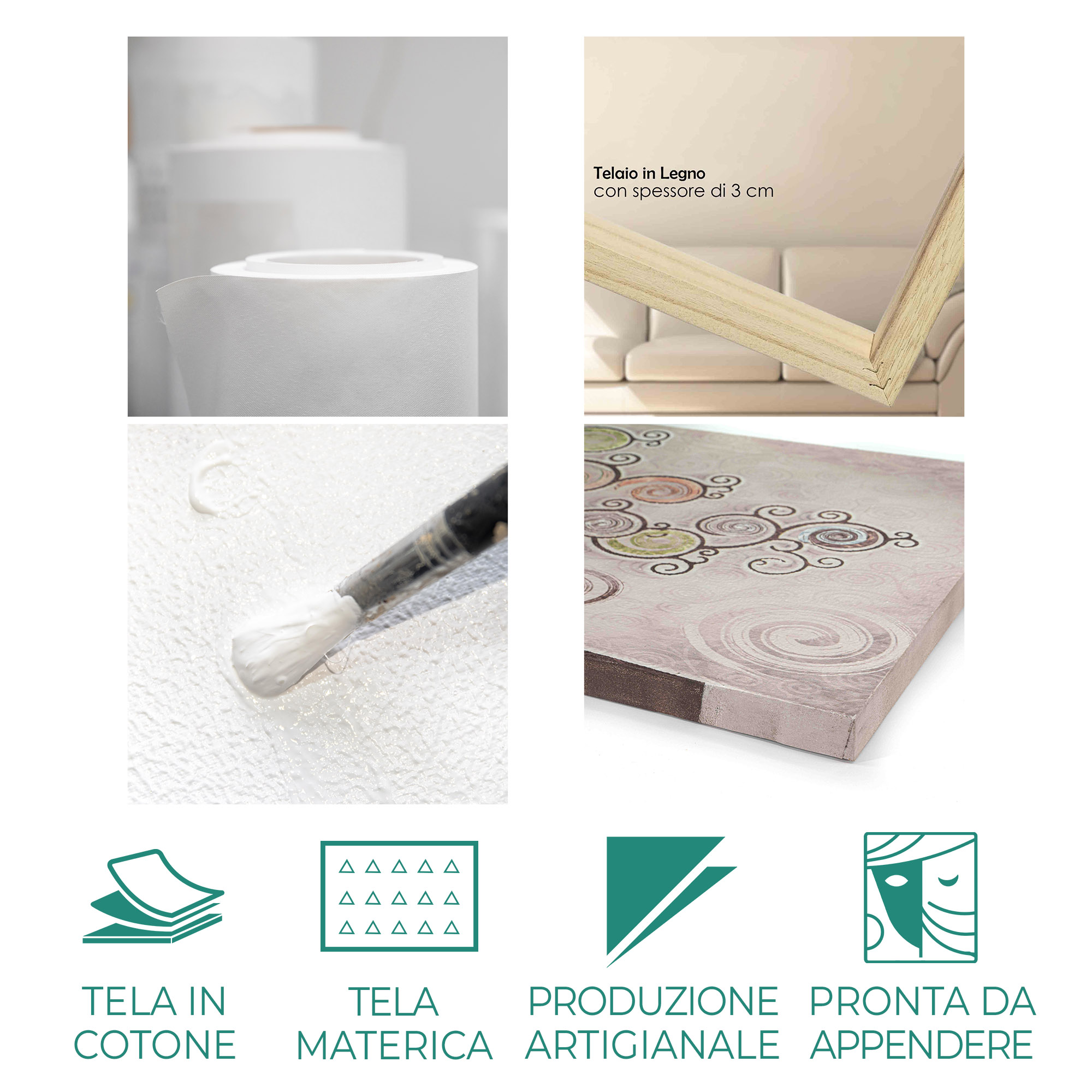 Quadro moderno astratto della nostra collezione PICTURES, di alta qualita', realizzato artigianalmente con stampa su tela in cotone, con fondo pittorico materico con vere pennellate spalmate a mano sulla quale viene stampato in altissima definizione il soggetto artistico della decorazione. La tela e' ricca di colori forti e vividi e di fattura esclusivamente artigianale, realizzata e intelaiata completamente in Italia. Il quadro ha un telaio in fibra di legno ecologica con spessore di 3 cm. Per dare ancora piu' importanza al prodotto il bordo e' decorato sui colori della tela quindi viene data continuazione alla stampa ingrandendo cosi' l’ottimo effetto visivo del quadro. Il Prodotto e' pronto per essere appeso anche con due semplici chiodi grazie al telaio di alto spessore. Adatto per decorare le pareti della tua casa come soggiorno, camera da letto, in cucina, bagno, sale da pranzo, o di tutti i tuoi ambienti anche non domestici, come ufficio, Hotel, bar, negozio o laboratorio, perché si mescola a qualsiasi tipologia di stile e arredamento. Disponibile nella misura 52x122cm.