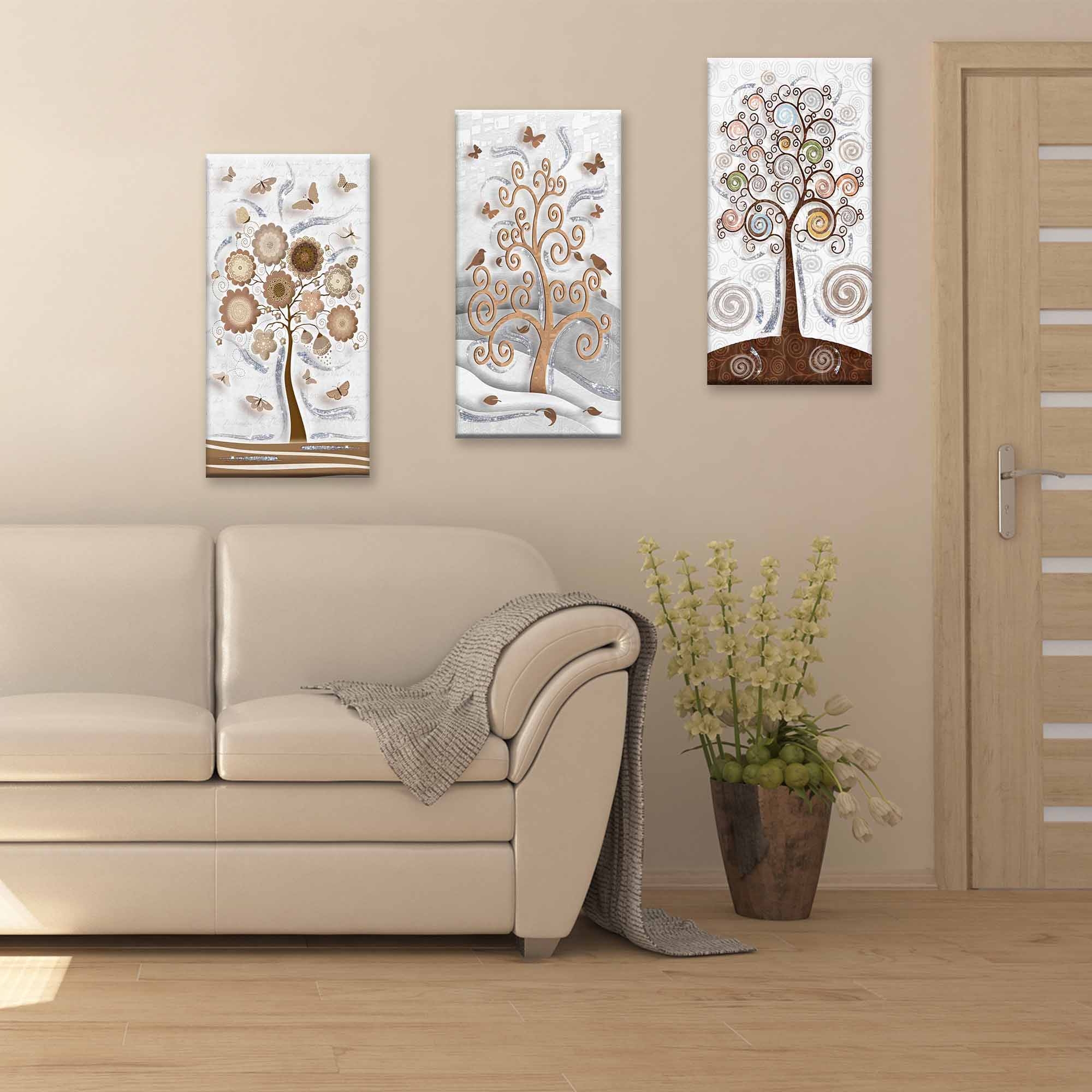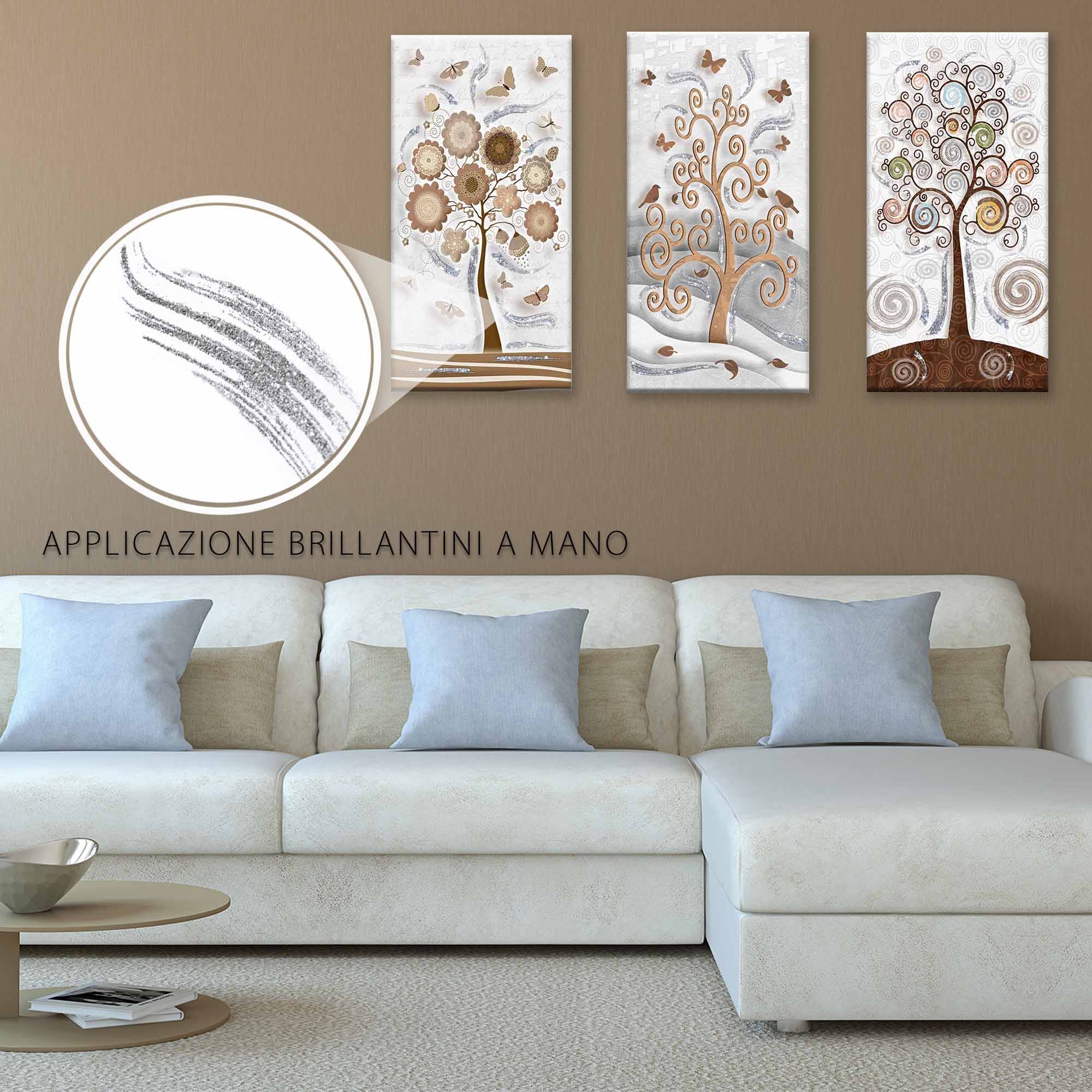 Il nostro Set composto da 3 Quadri su tela moderni offre 3 pezzi separati nelle dimensioni 38x75 cm ciascuno, caratterizzati da stampe con colori profondi e vividi. Una nuova ed originale decorazione con il tema albero della vita che nobilita e rende piacevole il tuo arredo con brillantini GLITTER. Ogni quadro è pronto da appendere con telaio in legno e tela pvc con spessore di 12mm, già montato, puoi appendere i 3 quadri come preferisci e nell'ordine che più ti piace per decorare la tua parete al meglio. Abbellisci la testa del tuo letto matrimoniale, la parete dietro al tuo divano o cucina, corridoio, ufficio, ingresso, bagno e dai spazio alla tua creativita'. Realizzato completamente in Italia.