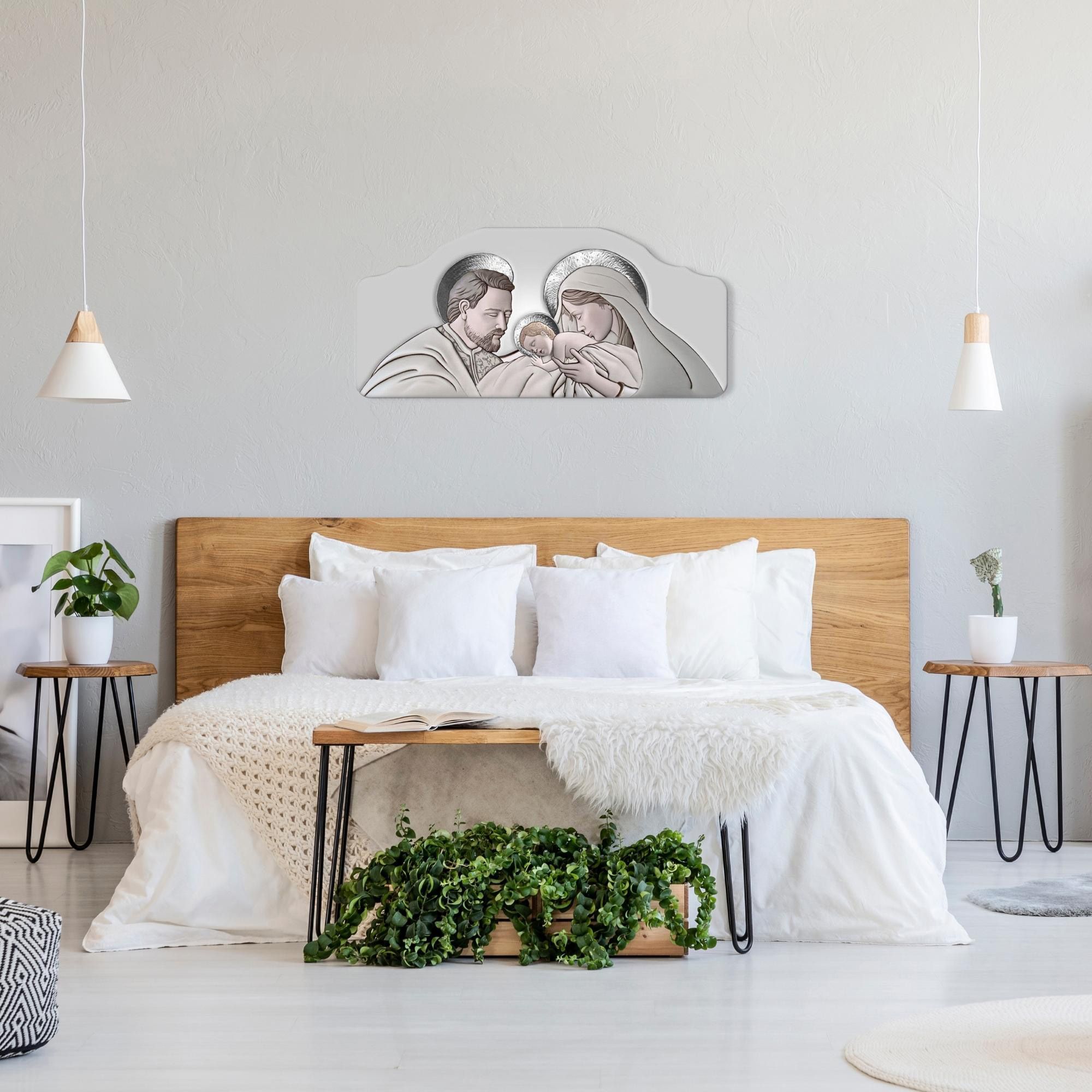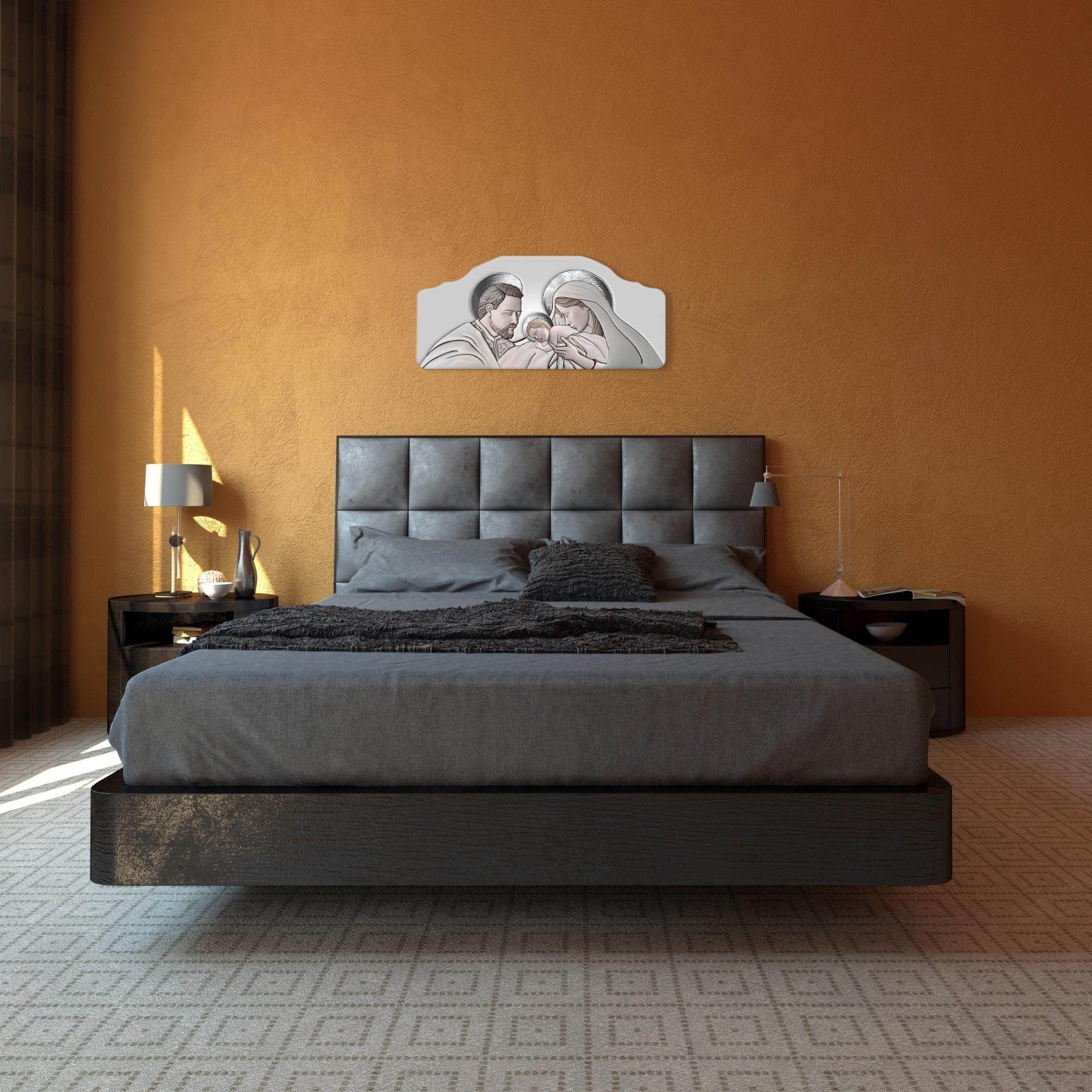 Quadro moderno Capezzale Sacra Famiglia 42x92 cm THE KISS CERAMIC GREY su tavola lavorata -