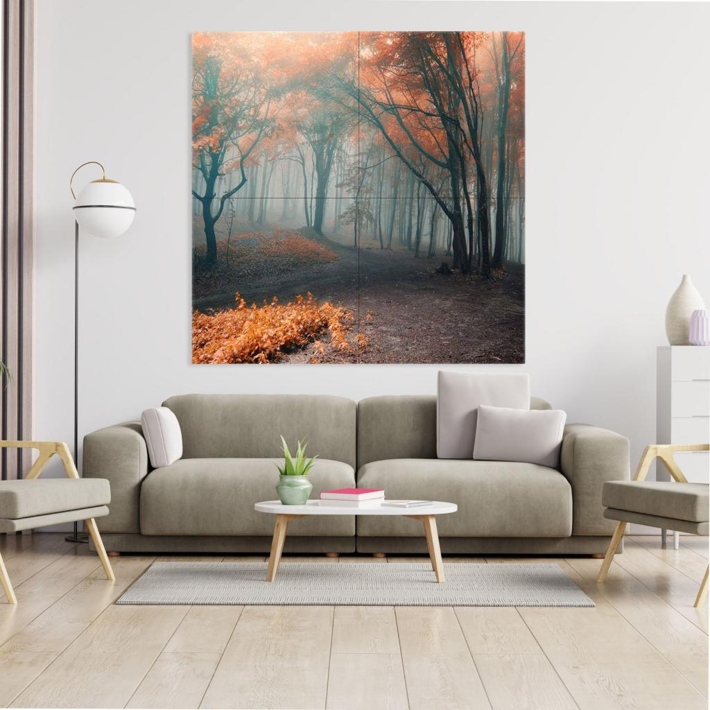 Uno dei modi più semplici per arredare casa in autunno è cambiare la palette dei colori. Opta per tonalità autunnali come il bordeaux, il senape, il terracotta e il verde oliva per le pareti o gli arredi. Prodotti di VorreiShop.it come tessuti e quadri decorativi possono aiutarti a implementare questa idea, proprio come questo quadro che riprende un'atmosfera autunnale.