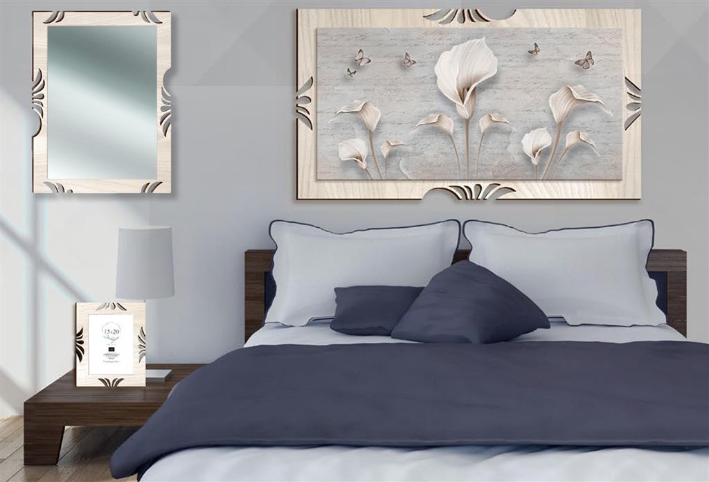 La cornice lavorata, intagliando la cornice del quadro crea una caratteristica unica per tutta la linea, dando eleganza con un tocco di modernita’ a tutti i complementi d’arredo disponibili.