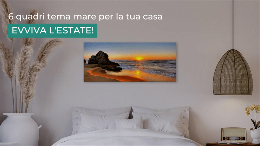 L'estate è il momento perfetto per dare nuova vita alla tua casa, abbandonando i toni scuri dell'inverno e introducendo colori vivaci e accessori moderni. Pertanto, per creare uno spazio ispirato all’atmosfera estiva, dei quadri colorati a tema mare saranno la scelta ideale. Potrai optare per tante diverse fantasie tra cui opere che raffigurano paesaggi marini, spiagge sabbiose e onde oceaniche. Inoltre, ti suggeriamo di arricchire il tuo arredamento con cuscini a motivi marini, tende in tessuti leggeri e trasparenti, tappeti con texture ispirate al mare e oggetti decorativi come conchiglie, stelle marine e vasi di vetro colmi di sabbia. L'importante è saper cogliere gli elementi essenziali del mare e trasportarli nella nostra casa.