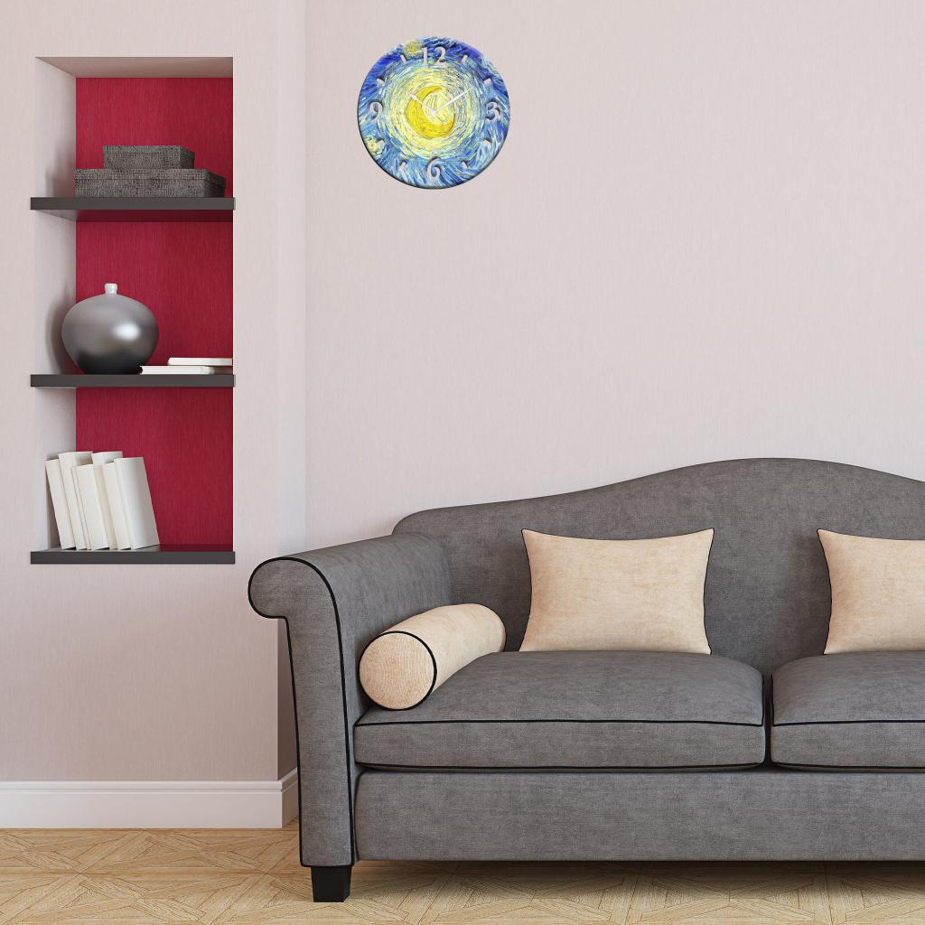 3) Orologio Da Parete Lavorato In Legno 32x32 Cm Notte Stellata: realizzato in fibra di legno, è ispirato al celebre dipinto di Vincent van Gogh, "Notte Stellata". La tela, che raffigura un paesaggio notturno illuminato dalla luna, è stata riportata in modo impeccabile sul pannello da 3 mm, e sarà perfetto per decorare la parete del tuo soggiorno o della sala da pranzo.