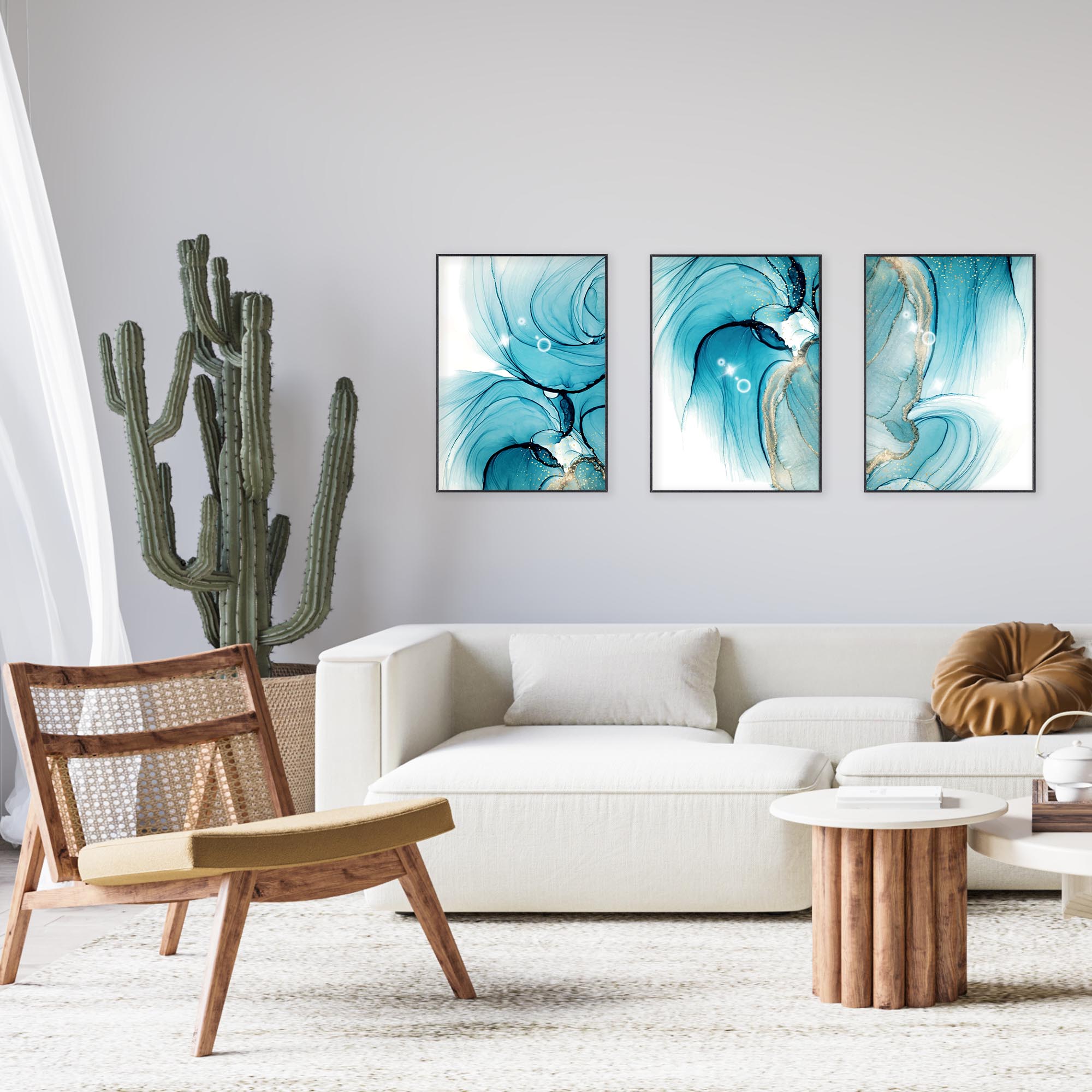 Il nostro set di 3 poster dona particolare eleganza e contemporaneità ad ogni angolo della tua casa al mare. Con una finitura metallizzata, sono perfetti come quadri per salotto o per la camera da letto, fornendo un design astratto con tonalità che spaziano dal blu tiffany al dorato, capaci di evocare una particolare freschezza estiva. Le dimensioni di ciascun quadro soggiorno sono di 29,7x42 cm e sono forniti senza cornice, offrendo versatilità e facilità di integrazione in qualsiasi arredamento.