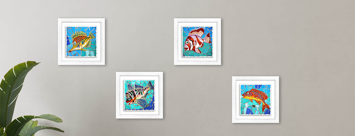 Il nostro esclusivo set di 4 quadri moderni particolari è realizzato con stampe su base in ceramica e presenta una cornice shabby chic di colore bianco. Ogni quadretto misura 18x18 cm e rappresenta pesci stilizzati in vetrate colorate, evocando un ambiente marino rilassante e artistico. Perfetti da appendere in cucina o nella sala da pranzo, questi quadri per soggiorno moderni donano vivacità e freschezza estiva ad ogni stanza.