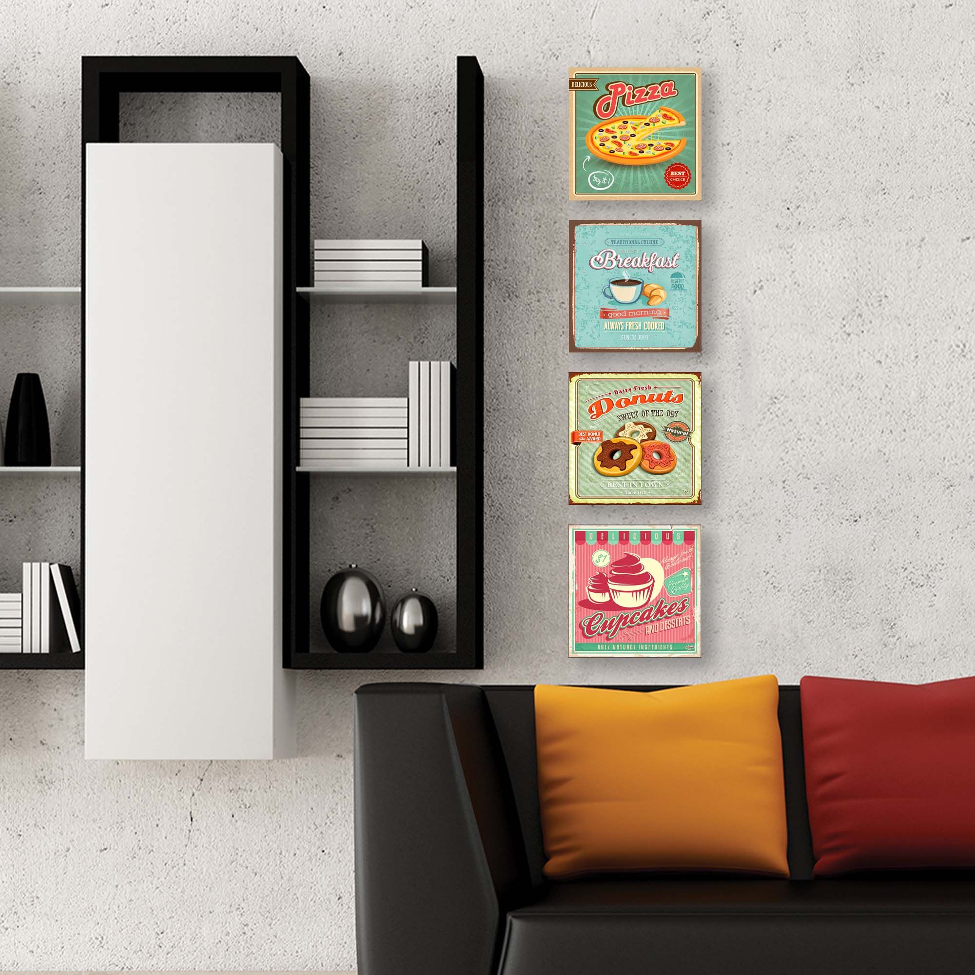 Il nostro Set composto da 4 Quadretti moderni su carta telata con finitura lucida offre 4 pezzi separati nelle dimensioni 16x16 cm ciascuno, caratterizzati da stampe con colori profondi e vividi con tema vintage food. Una nuova ed originale decorazione che rende piacevole il tuo arredo. Ogni quadro è pronto da appendere con telaio in legno e tela con spessore di 1,6 cm, già montato, puoi appendere i 4 quadri come preferisci e nell'ordine che più ti piace per decorare la tua parete al meglio. Abbellisci la tua cucina, la parete dietro al tuo divano, corridoio, ufficio, ingresso, bagno e dai spazio alla tua creativita'. Perfetti come idea regalo o Bomboniere per eventi. Realizzato completamente in Italia.