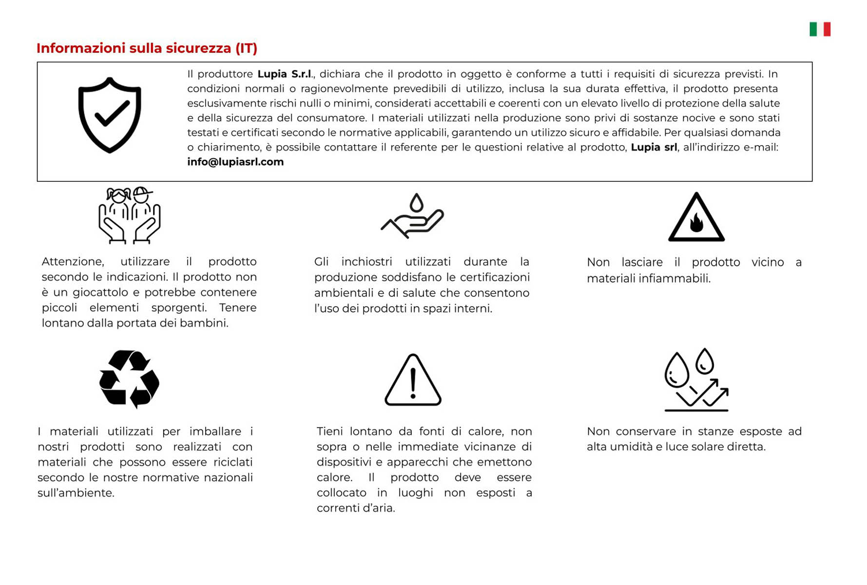 Vorreishop si impegna, per ogni prodotto venduto, a offrire schede di sicurezza e manuali utente dettagliati, nel pieno rispetto della normativa europea GPSR, garantendo che tutti i prodotti siano conformi agli standard di sicurezza richiesti. Puoi accedere e scaricare le immagini di sicurezza e il manuale utente nella sezione dedicata "Risorse per la sicurezza" presente su questa pagina. Per maggiori informazioni visita Condizioni Generali di Vendita