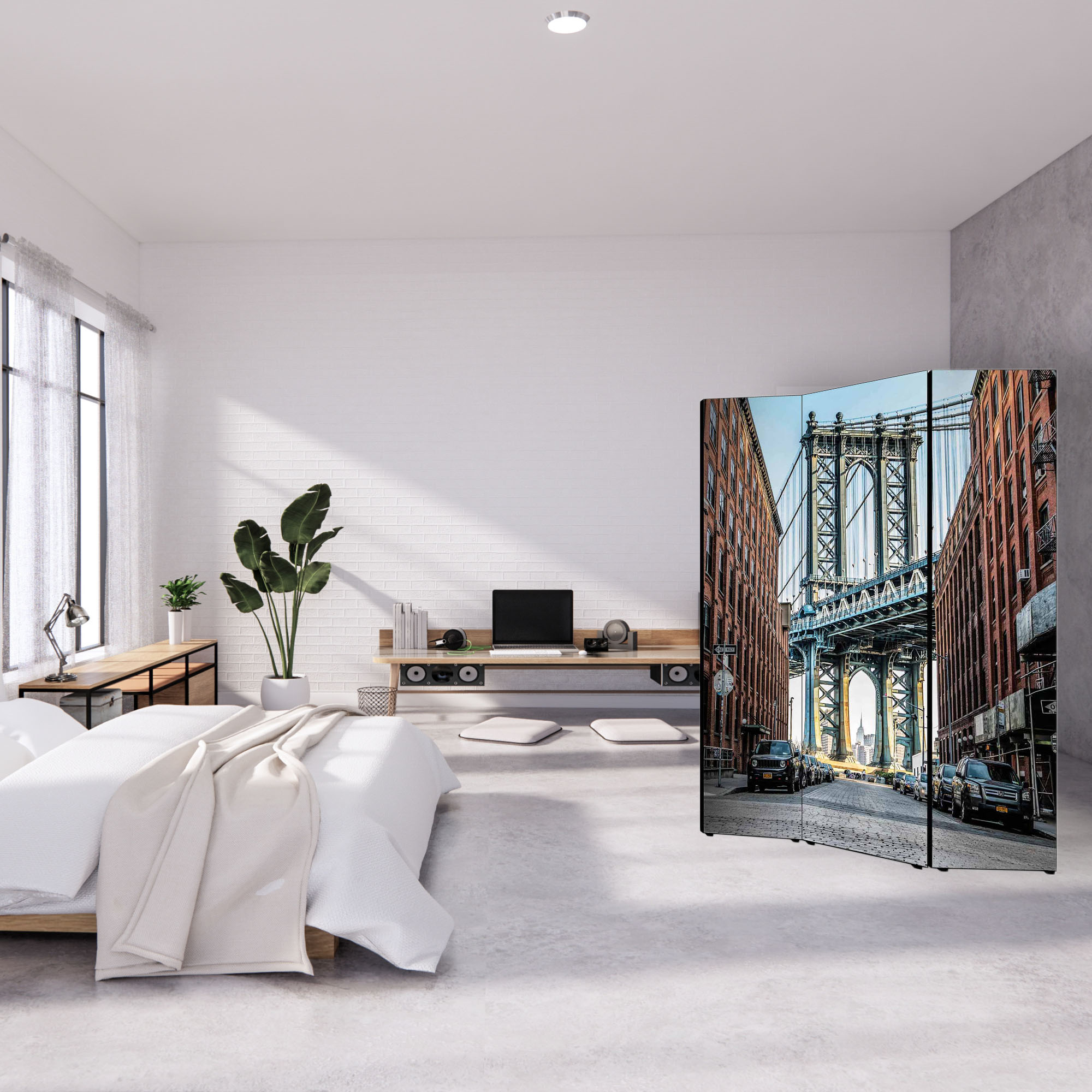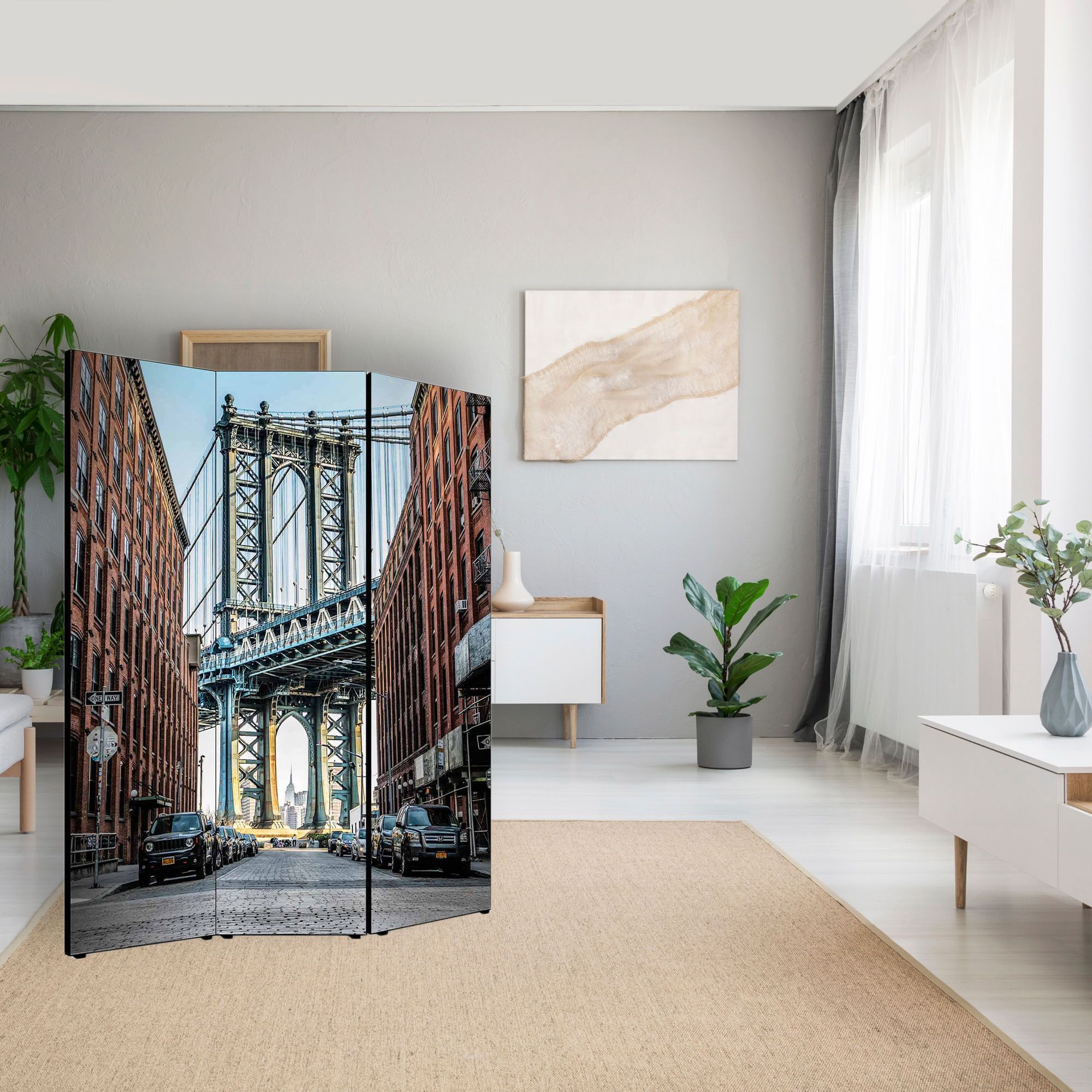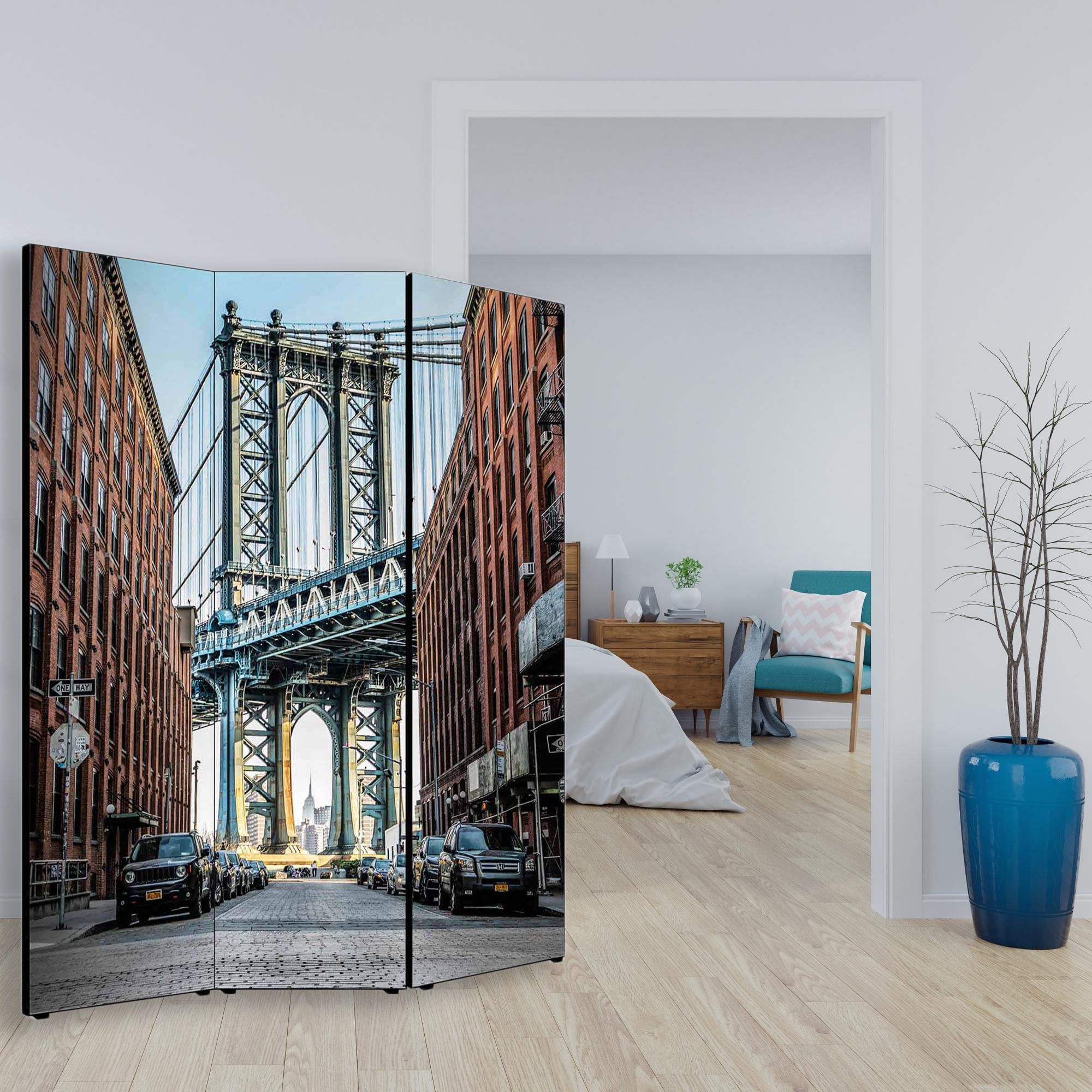 Divisore con struttura in Legno e Tela in cotone con soggetto unico stampata in alta definizione su fronte e retro, e’ un utile Separe’ Bifacciale mobile che vi permette di dividere per privacy una parte del vostro ambiente, creando un originale panorama con sfondo artistico grazie all’immagine ed al tema scelti. Il Paravento ha una struttura mobile solida composto da 3 Pannelli pieghevoli, da posizionare su qualsiasi tipo di pavimento grazie al supporto offerto dai piedini in plastica forniti. Un complemento d’arredo che decora o nasconde angoli della vostra stanza, permettendovi di strutturare e organizzare uno spazio con grande facilita’. Le 3 ante pieghevoli sono fissate tramite un sistema di cerniere che ne consente la facile mobilita’ e apertura a seconda delle esigenze. Un’idea originale per gli ambienti di casa come soggiorno, camera da letto, in cucina, bagno, sale da pranzo, ingresso, o per tutti i luoghi non domestici, come ufficio, Hotel, bar, negozio o laboratorio, perché sono adatti a qualsiasi tipologia di stile e arredamento. Prodotto completamente in Italia, le sue dimensioni sono 135,6 cm di larghezza frontale, 176 di altezza e 3,1 cm di profondita'.