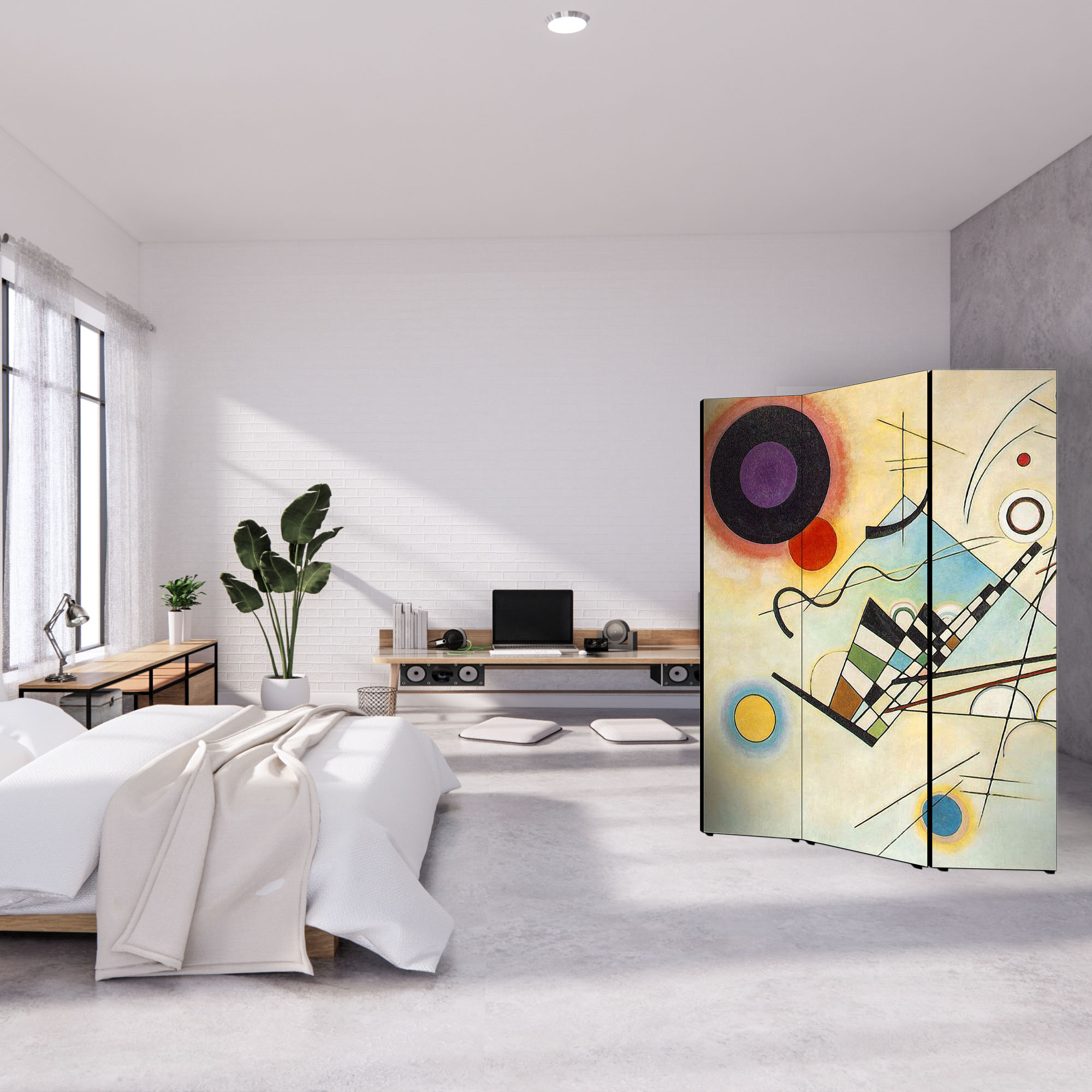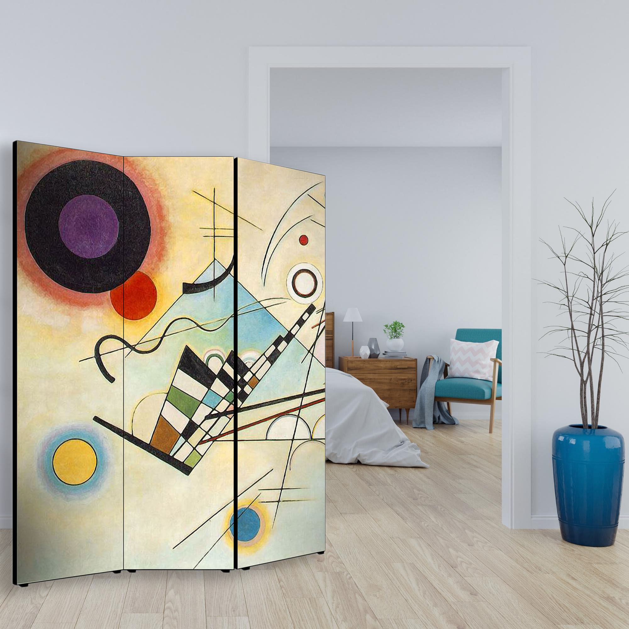 Divisore con struttura in Legno e Tela in cotone con soggetto unico stampata in alta definizione su fronte e retro, e’ un utile Separe’ Bifacciale mobile che vi permette di dividere per privacy una parte del vostro ambiente, creando un originale panorama con sfondo artistico grazie all’immagine ed al tema scelti. Il Paravento ha una struttura mobile solida composto da 3 Pannelli pieghevoli, da posizionare su qualsiasi tipo di pavimento grazie al supporto offerto dai piedini in plastica forniti. Un complemento d’arredo che decora o nasconde angoli della vostra stanza, permettendovi di strutturare e organizzare uno spazio con grande facilita’. Le 3 ante pieghevoli sono fissate tramite un sistema di cerniere che ne consente la facile mobilita’ e apertura a seconda delle esigenze. Un’idea originale per gli ambienti di casa come soggiorno, camera da letto, in cucina, bagno, sale da pranzo, ingresso, o per tutti i luoghi non domestici, come ufficio, Hotel, bar, negozio o laboratorio, perché sono adatti a qualsiasi tipologia di stile e arredamento. Prodotto completamente in Italia, le sue dimensioni sono 135,6 cm di larghezza frontale, 176 di altezza e 3,1 cm di profondita'.