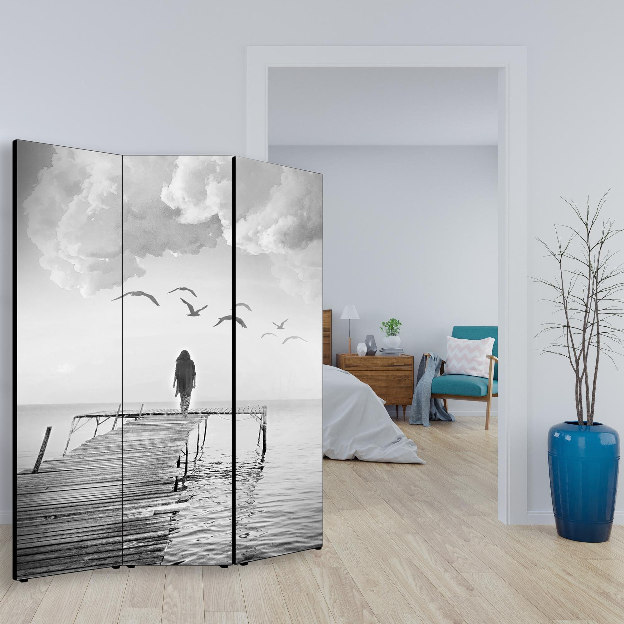 Separe' per interni, Divisorio 135,6 x H 176 x P 3,1 cm DONNA SUL PONTILE paravento 3 Ante in legno con Tele stampate fronte retro Soggetto unico -