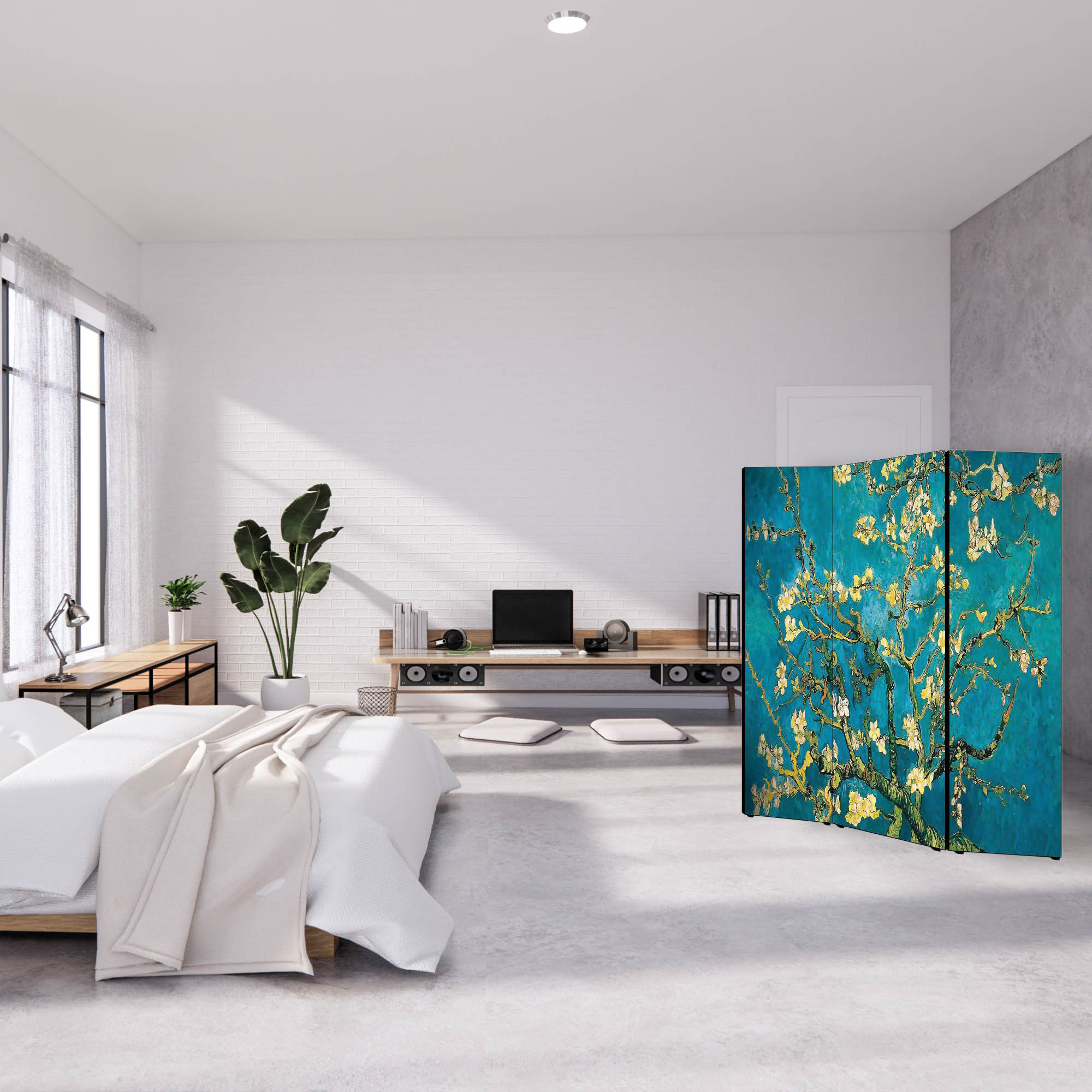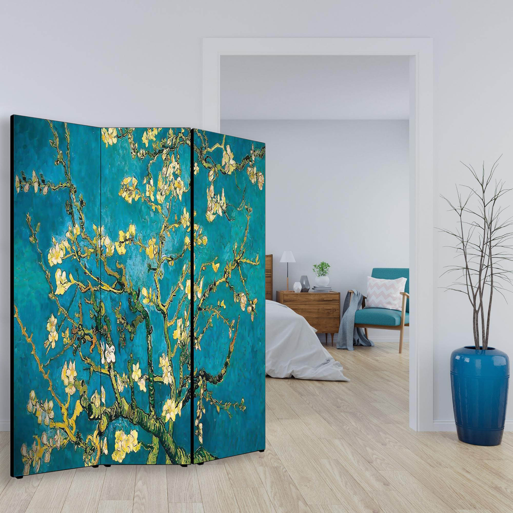 Divisore con struttura in Legno e Tela in cotone con soggetto unico stampata in alta definizione su fronte e retro, e’ un utile Separe’ Bifacciale mobile che vi permette di dividere per privacy una parte del vostro ambiente, creando un originale panorama con sfondo artistico grazie all’immagine ed al tema scelti. Il Paravento ha una struttura mobile solida composto da 3 Pannelli pieghevoli, da posizionare su qualsiasi tipo di pavimento grazie al supporto offerto dai piedini in plastica forniti. Un complemento d’arredo che decora o nasconde angoli della vostra stanza, permettendovi di strutturare e organizzare uno spazio con grande facilita’. Le 3 ante pieghevoli sono fissate tramite un sistema di cerniere che ne consente la facile mobilita’ e apertura a seconda delle esigenze. Un’idea originale per gli ambienti di casa come soggiorno, camera da letto, in cucina, bagno, sale da pranzo, ingresso, o per tutti i luoghi non domestici, come ufficio, Hotel, bar, negozio o laboratorio, perché sono adatti a qualsiasi tipologia di stile e arredamento. Prodotto completamente in Italia, le sue dimensioni sono 135,6 cm di larghezza frontale, 176 di altezza e 3,1 cm di profondita'.