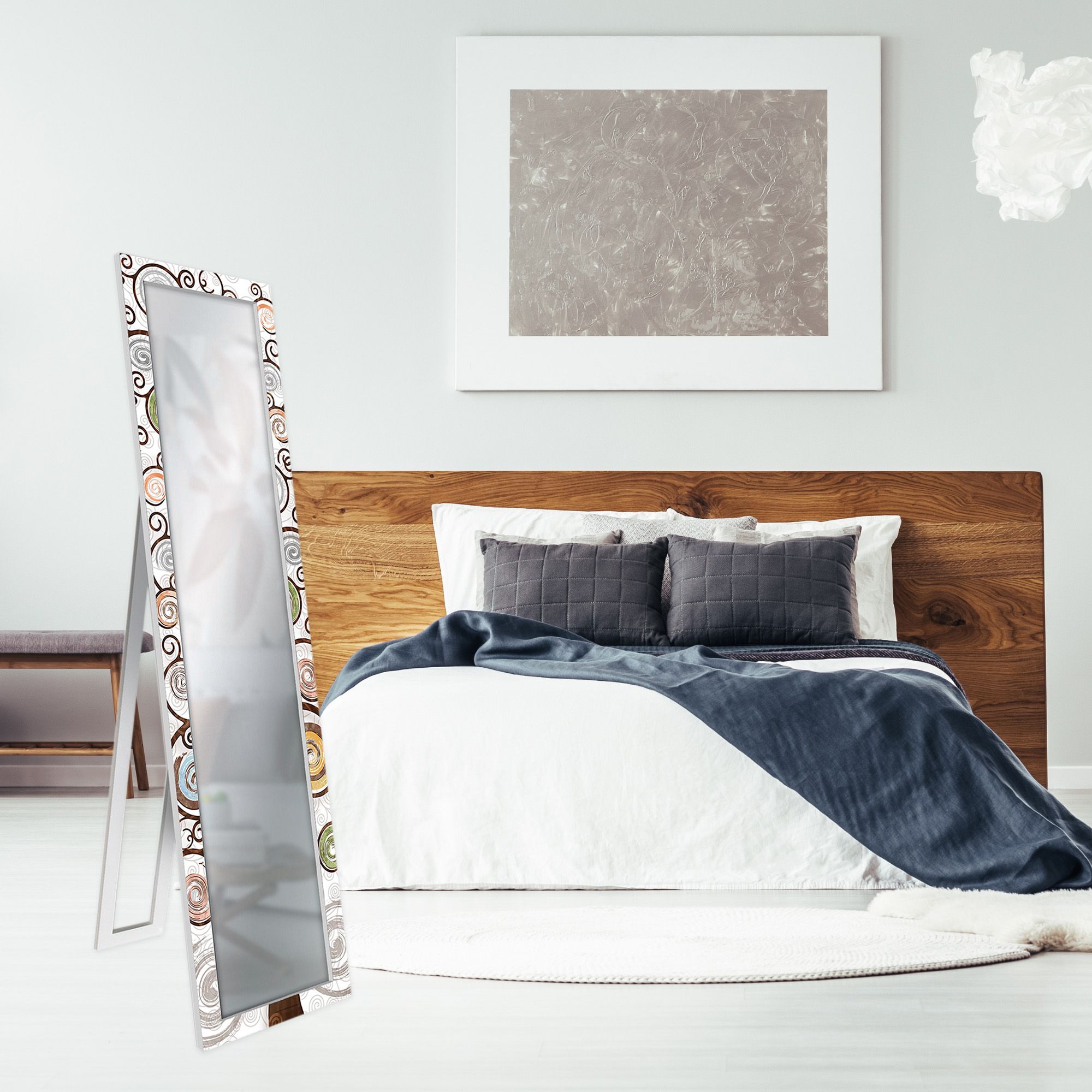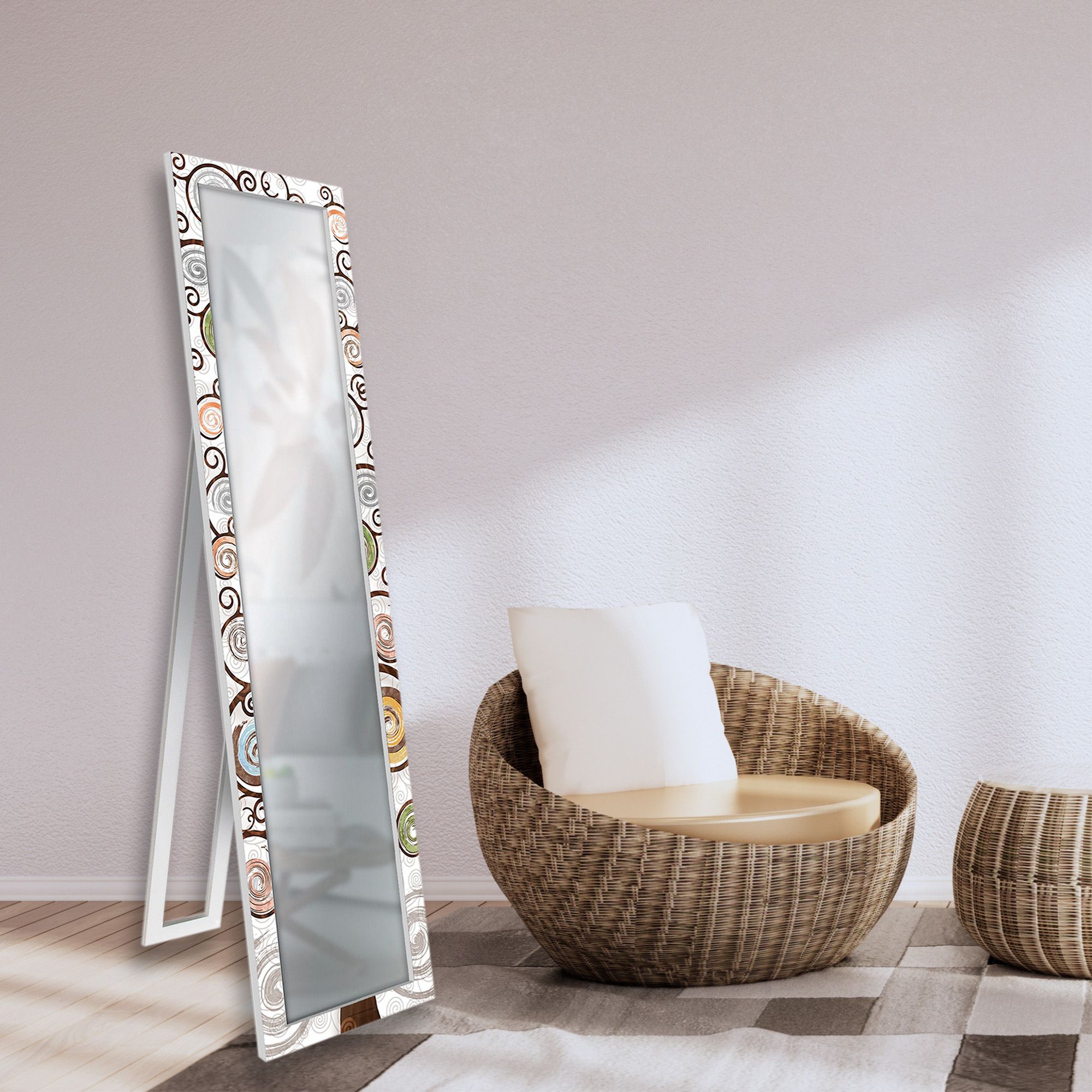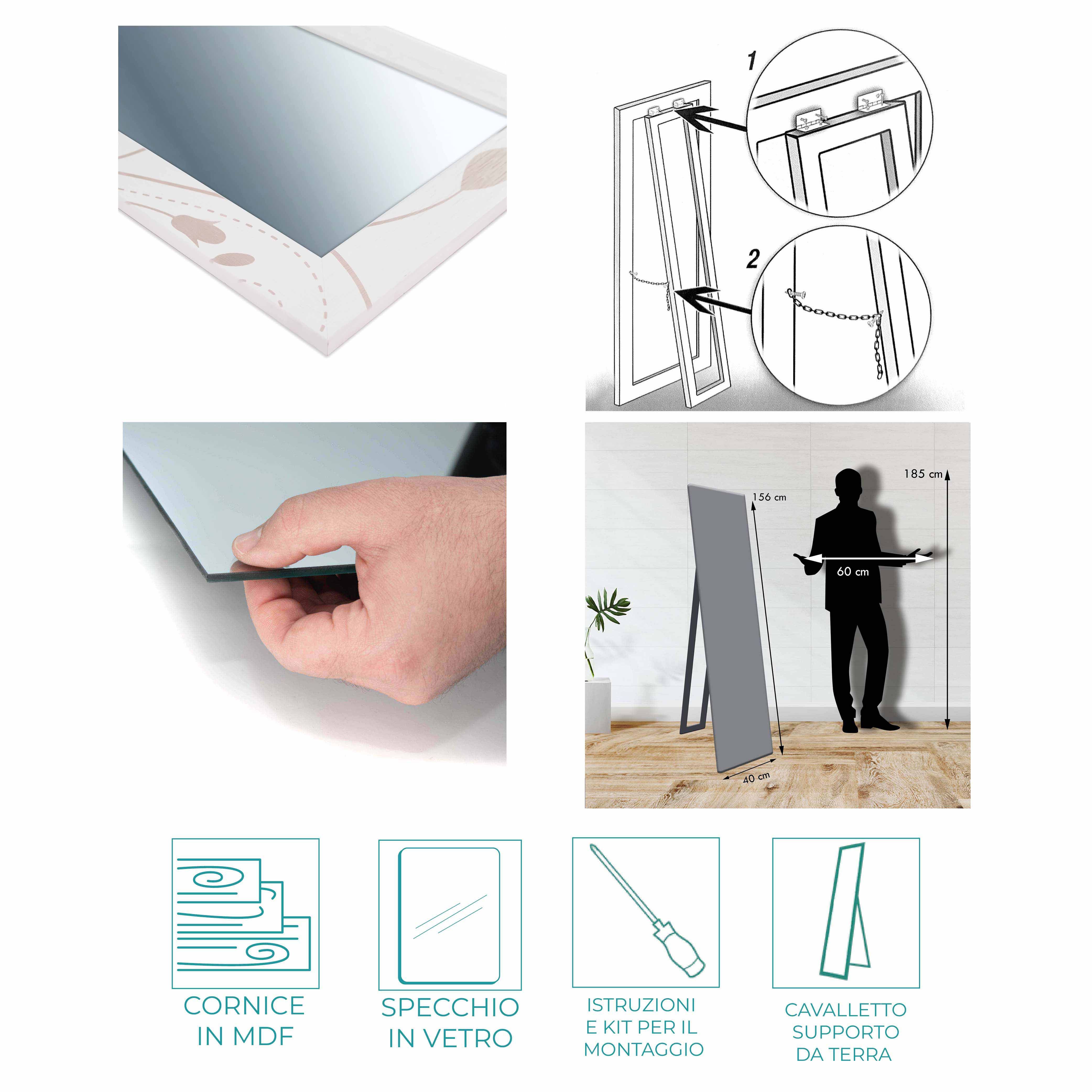 Dotato di un pratico cavalletto, lo specchio puo’ essere facilmente posizionato a terra e inclinato secondo le tue esigenze grazie a una comoda catenella. Se preferisci, puo’ anche essere appeso al muro, eliminando il cavalletto per un look piu’ pulito e moderno.