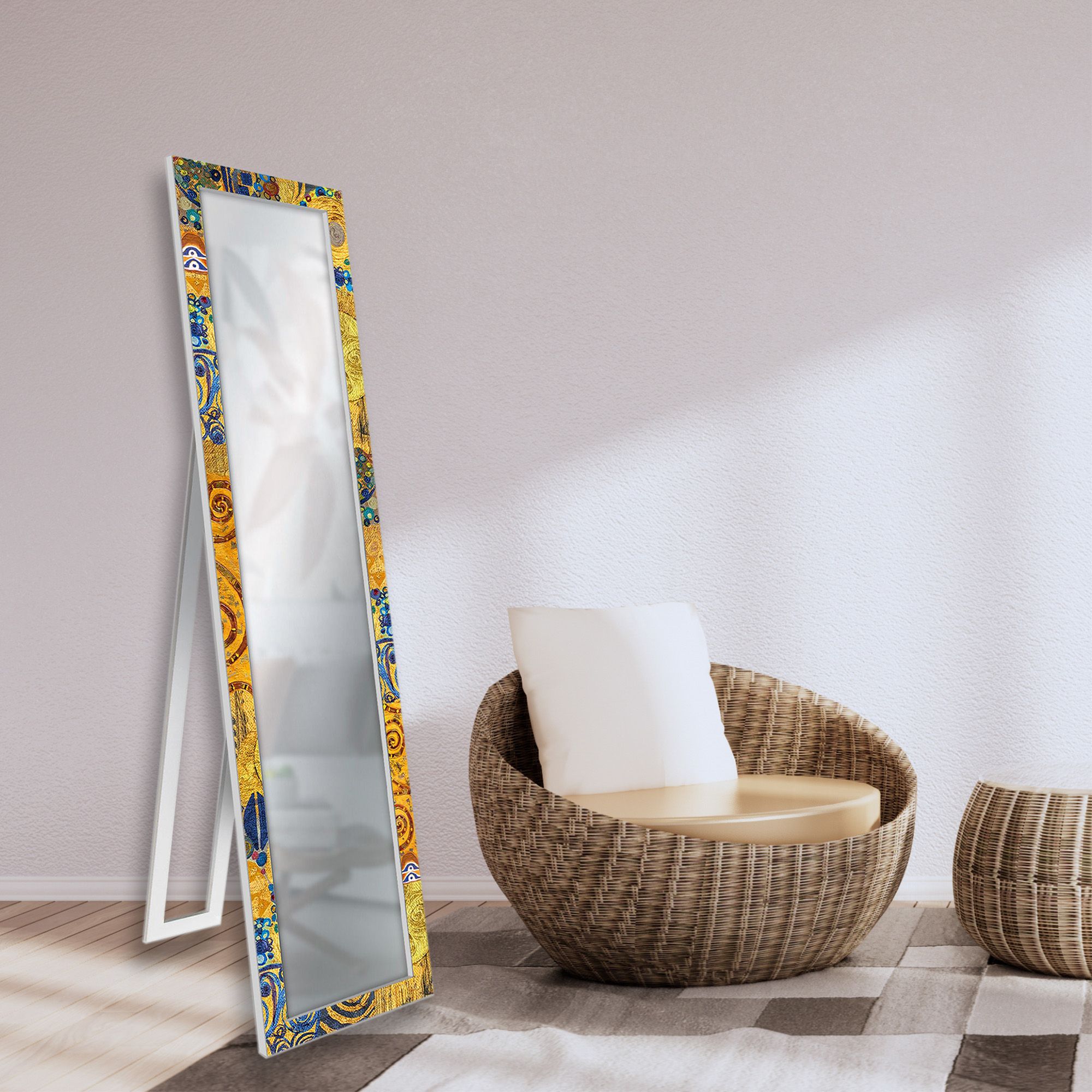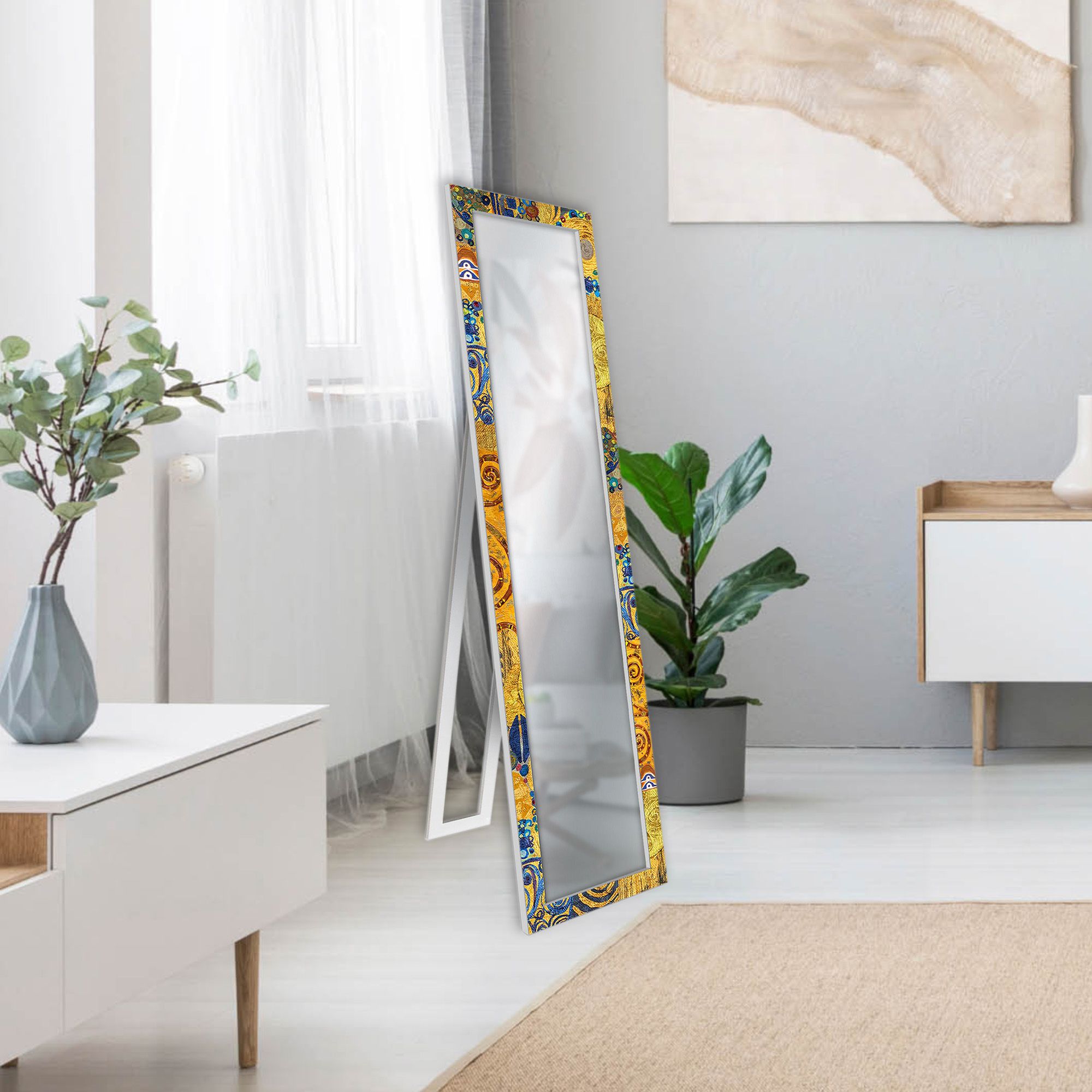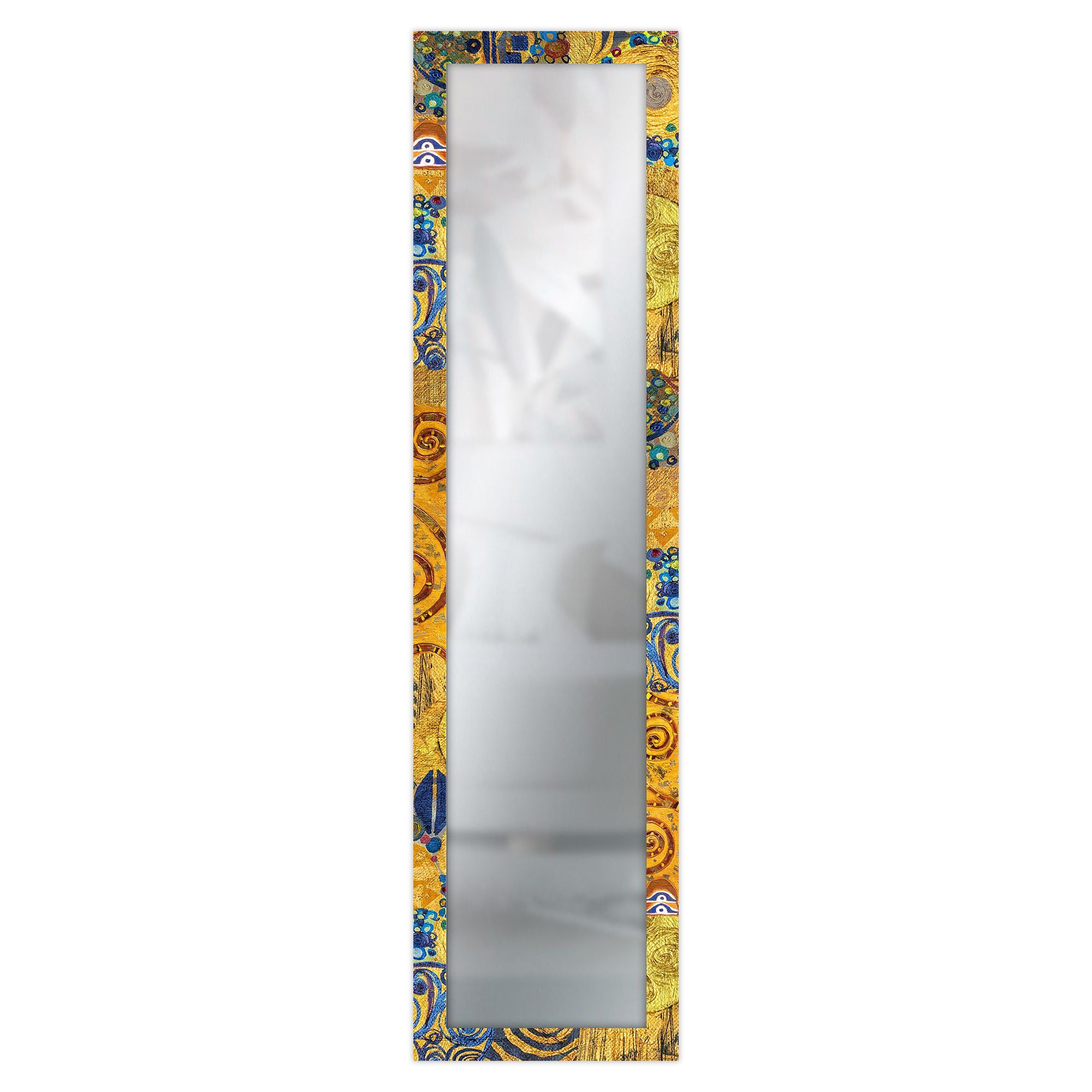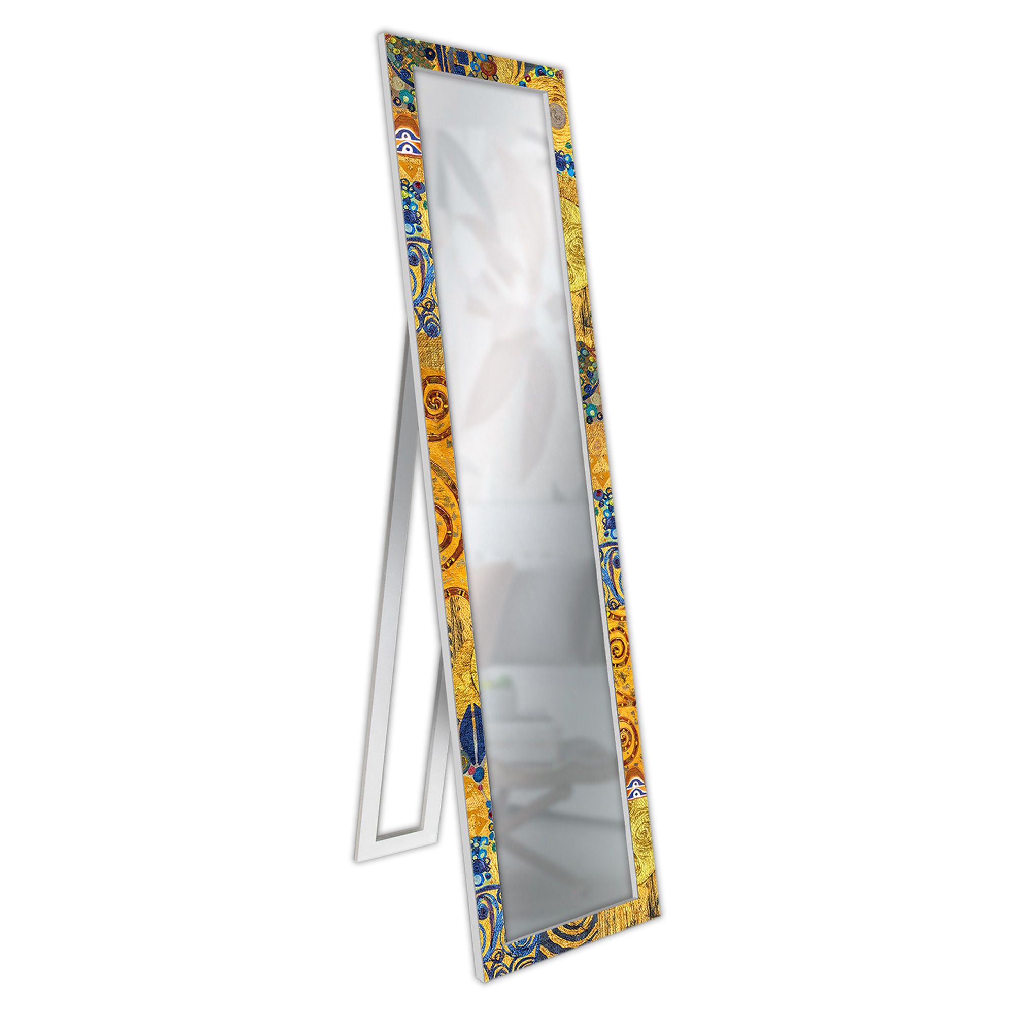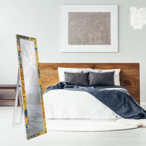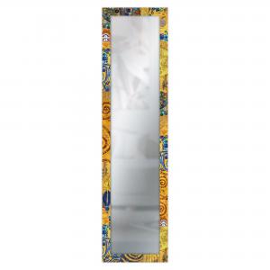 La cornice, ispirata alle celebri opere di Gustav Klimt, presenta uno sfondo giallo tendente al dorato con raffinate sfumature calde e dettagli blu che donano eleganza, profondità e una forte identità visiva allo specchio.