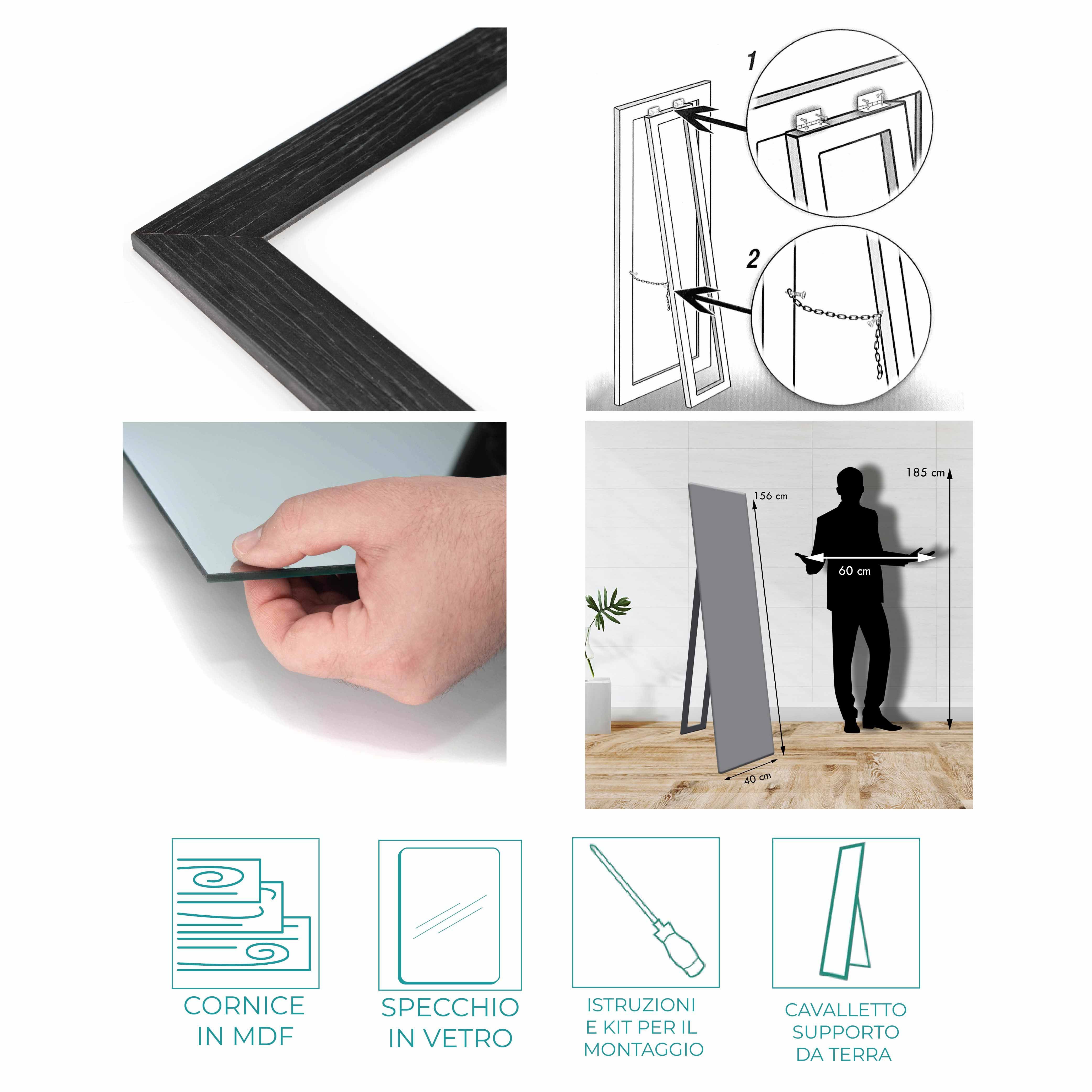 Lo specchio da terra è dotato di cavalletto come supporto da terra, molto semplice da montare grazie alle istruzioni e tutti gli accessori per il montaggio inclusi nella confezione. Il cavalletto permette di regolare l'inclinazione dello specchio nella posizione desiderata grazie ad una catenella. La specchiera puo' anche essere appesa sulla parete eliminando il cavalletto.