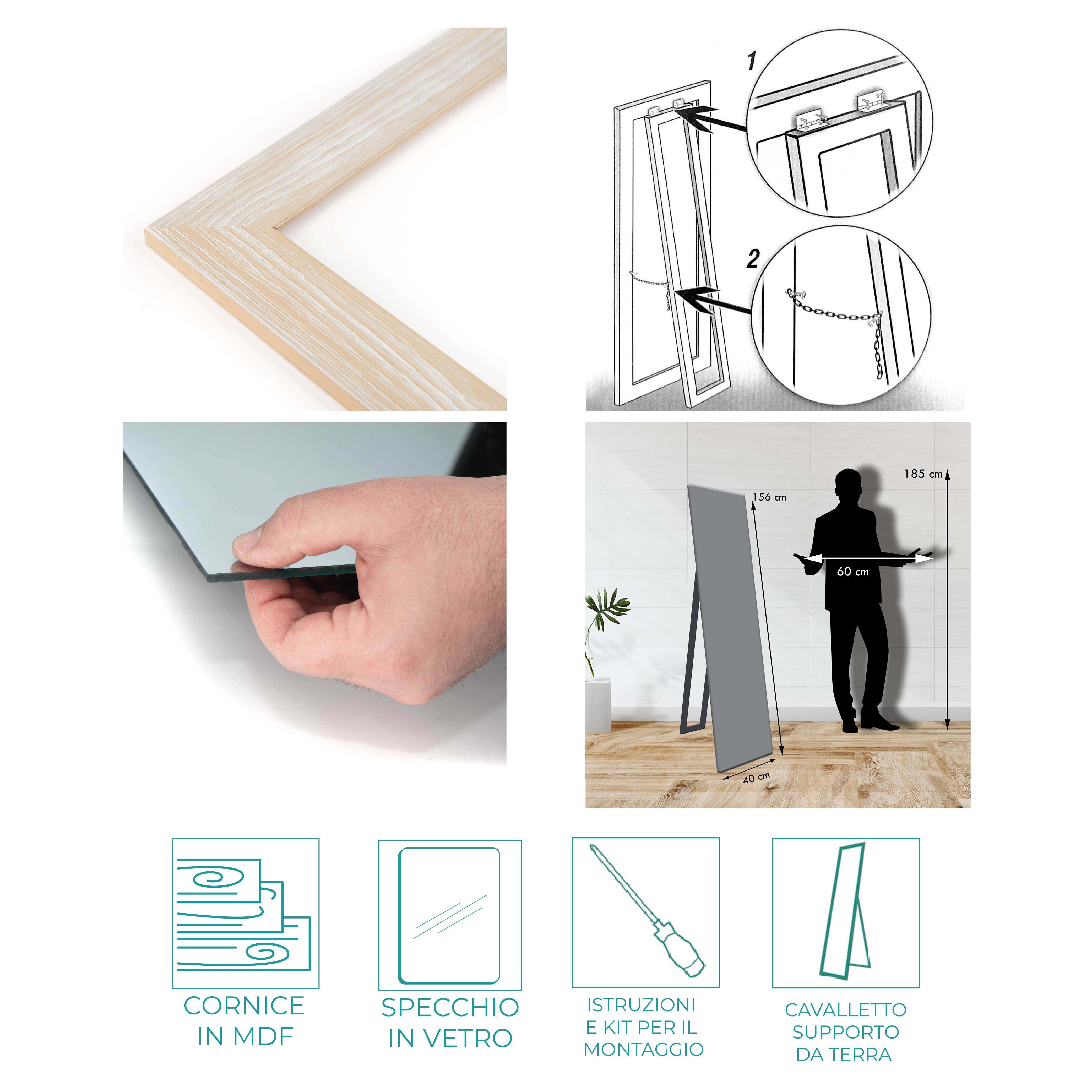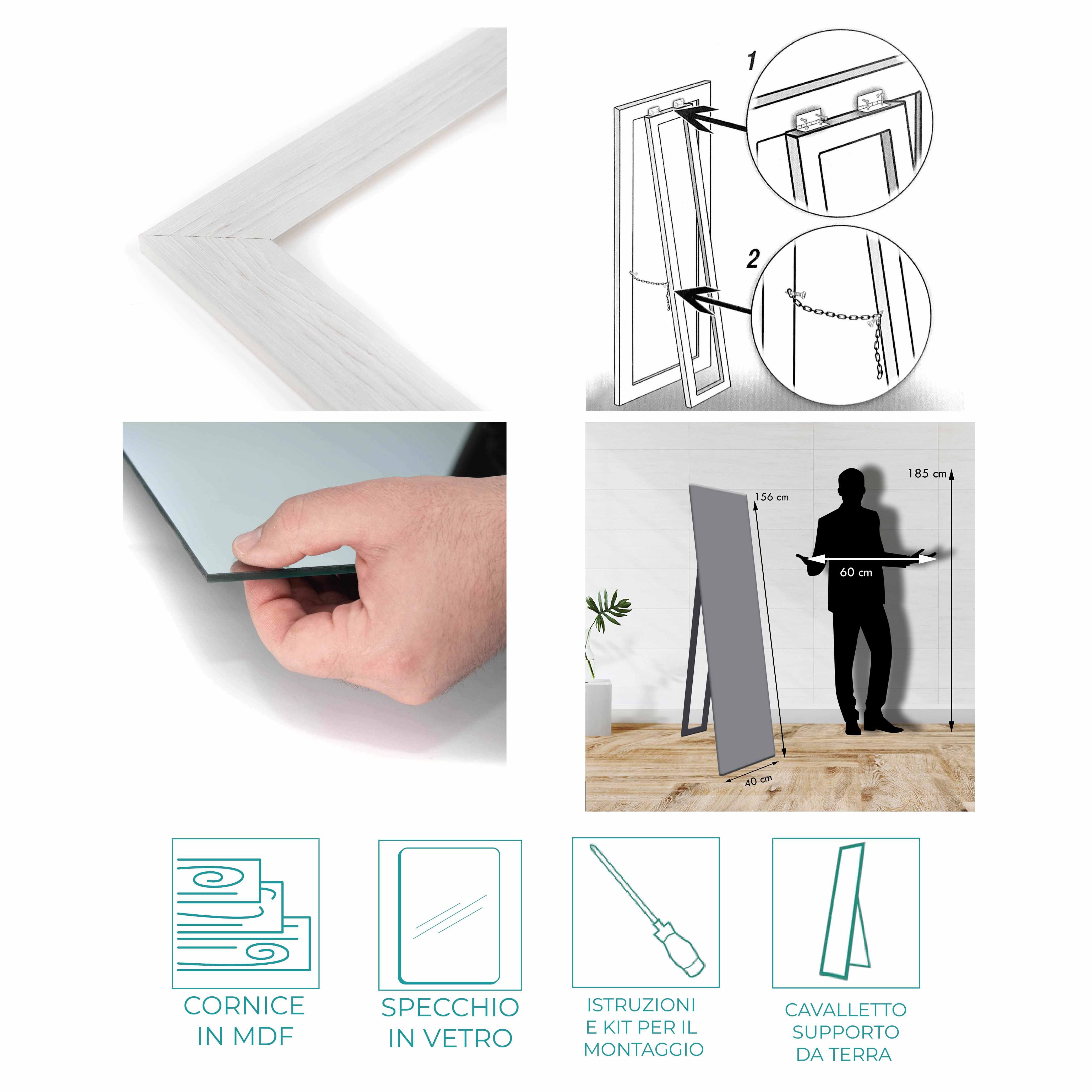llumina e valorizza ogni angolo della tua casa con la nostra Specchiera da Terra Mirror con cornice Boston. Realizzato interamente in Italia con materiali di alta qualità, questo specchio in legno dona lucentezza e profondità ad ingressi, soggiorni, camere da letto, bagni e molti altri ambienti. Dotato di un robusto cavalletto come supporto da terra, il questo specchio da terra è molto semplice da montare grazie alle istruzioni e tutti gli accessori inclusi nella confezione. Il cavalletto permette di regolare facilmente l'inclinazione dello specchio nella posizione desiderata, grazie ad una pratica catenella. In alternativa, la specchiera può essere facilmente appesa alla parete, eliminando il cavalletto. Con la sua Cornice Boston 40x156 Cm in legno ecologico, questo specchio da terra si adatta perfettamente a qualsiasi stile di arredamento, dal più classico al più moderno, aggiungendo un tocco di charme e raffinatezza a qualsiasi ambiente.