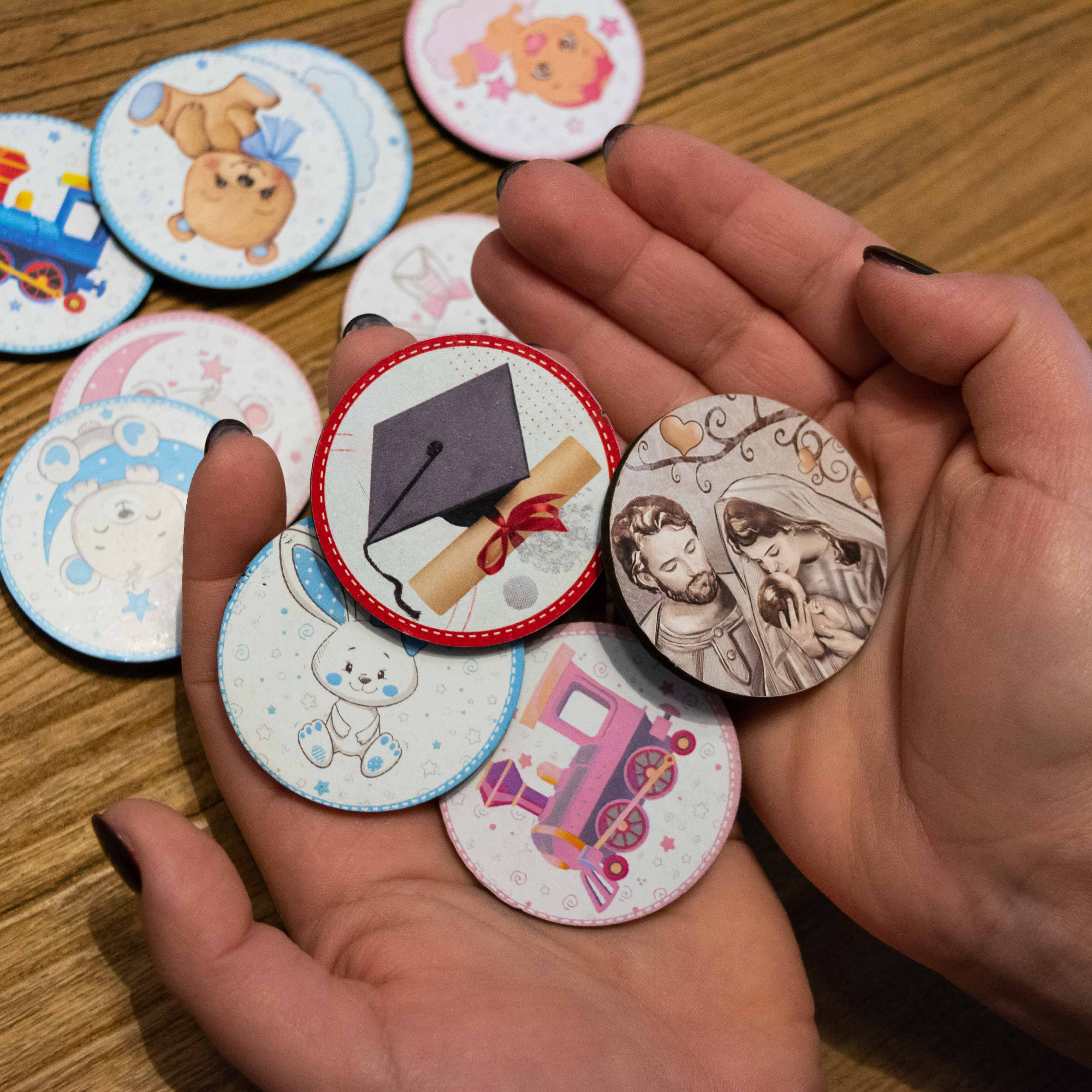 Set composto da 24 pezzi di Calamite Rotonde con struttura in Legno e decorazione nel tema del soggetto scelto, con un diametro di dimensione pari a 4,5 cm e uno spessore di 3 mm.