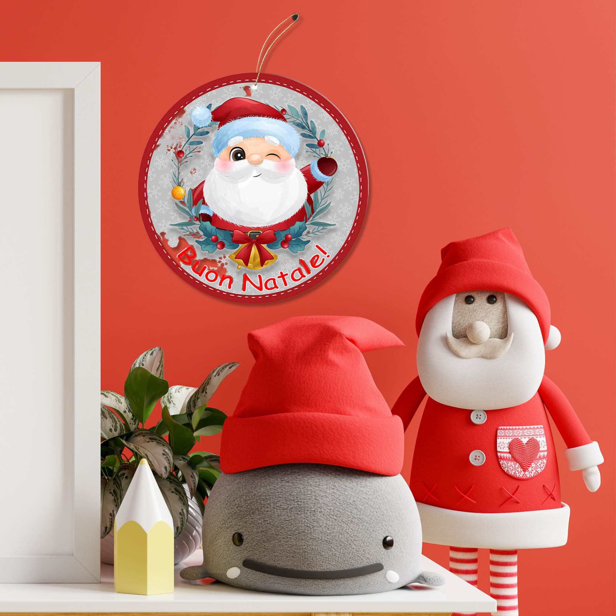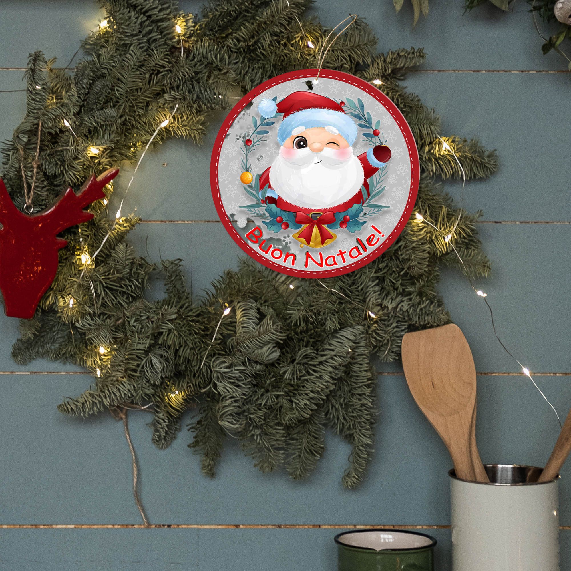 Aggiungi un tocco di magia alle tue festività con questa bellissima decorazione natalizia da parete o per addobbare il tuo albero o ghirlanda di Natale raffigurante una pallina con Babbo Natale. Realizzata in legno con spessore di 4mm, stampa a colori con motivi natalizi solo su un lato e con testo ‘Buon Natale!’.