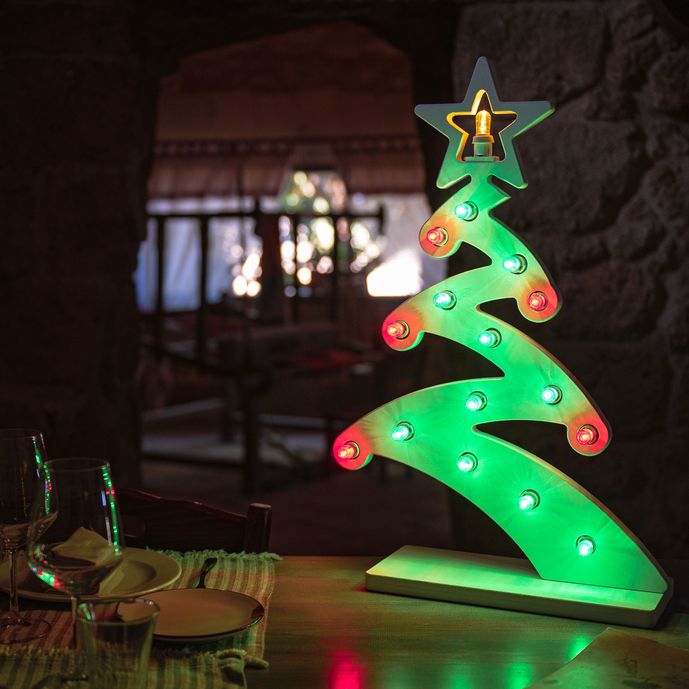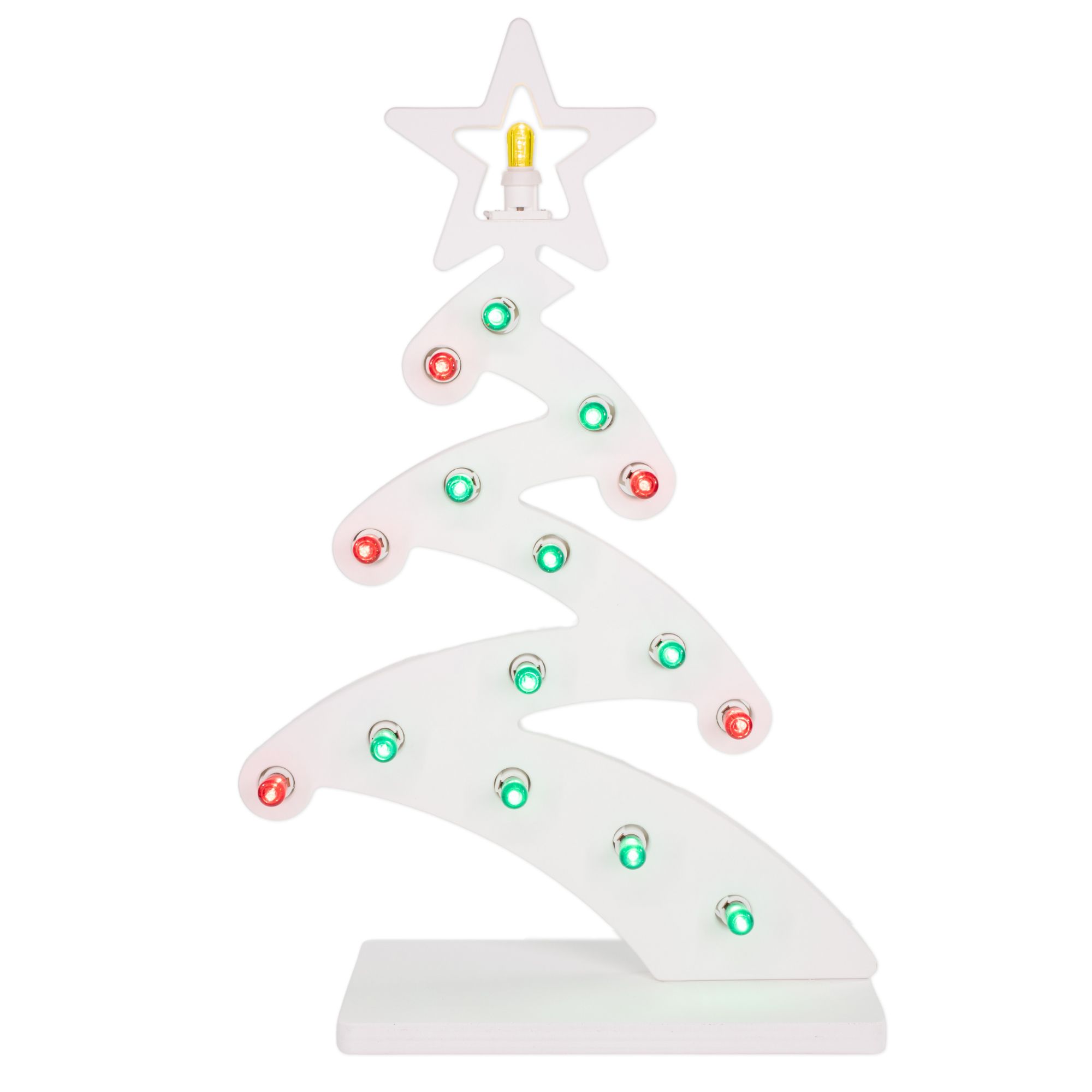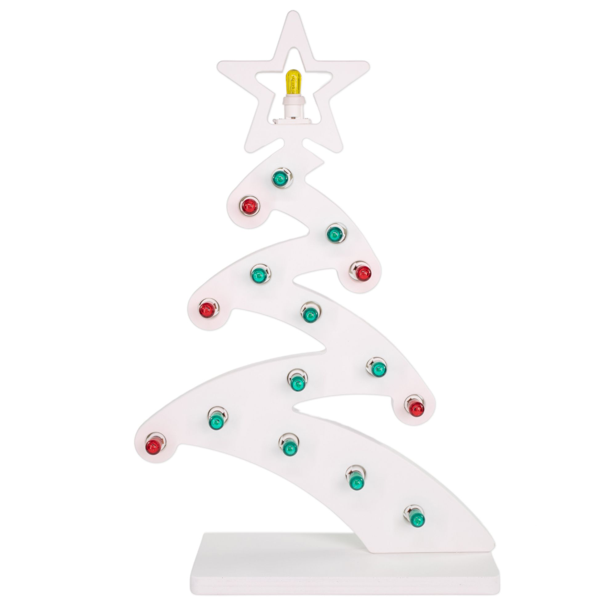 Lampada decorativa da tavolo lavorata a mano da artigiani pugliesi in legno verniciato Bianco, secondo la tradizione, ricavando una forma moderna e stilizzata del tipico Albero di Natale o abete decorato con lampadine verdi a rappresentare la chioma di foglie e lampadine rosse per le tradizionali palline, in cima la stella di Natale con lampadina gialla.