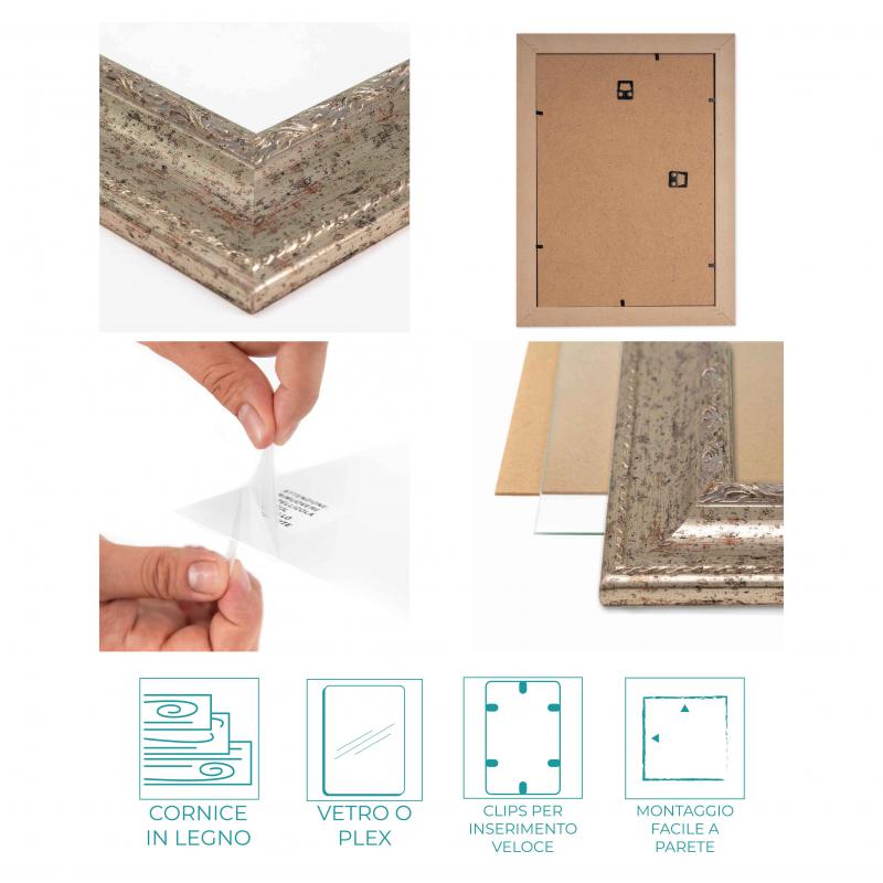 La cornice è già provvista di ganci che permettono di appenderla sia verticale che orizzontale, offrendo massima flessibilità a seconda del formato scelto e del layout della parete.