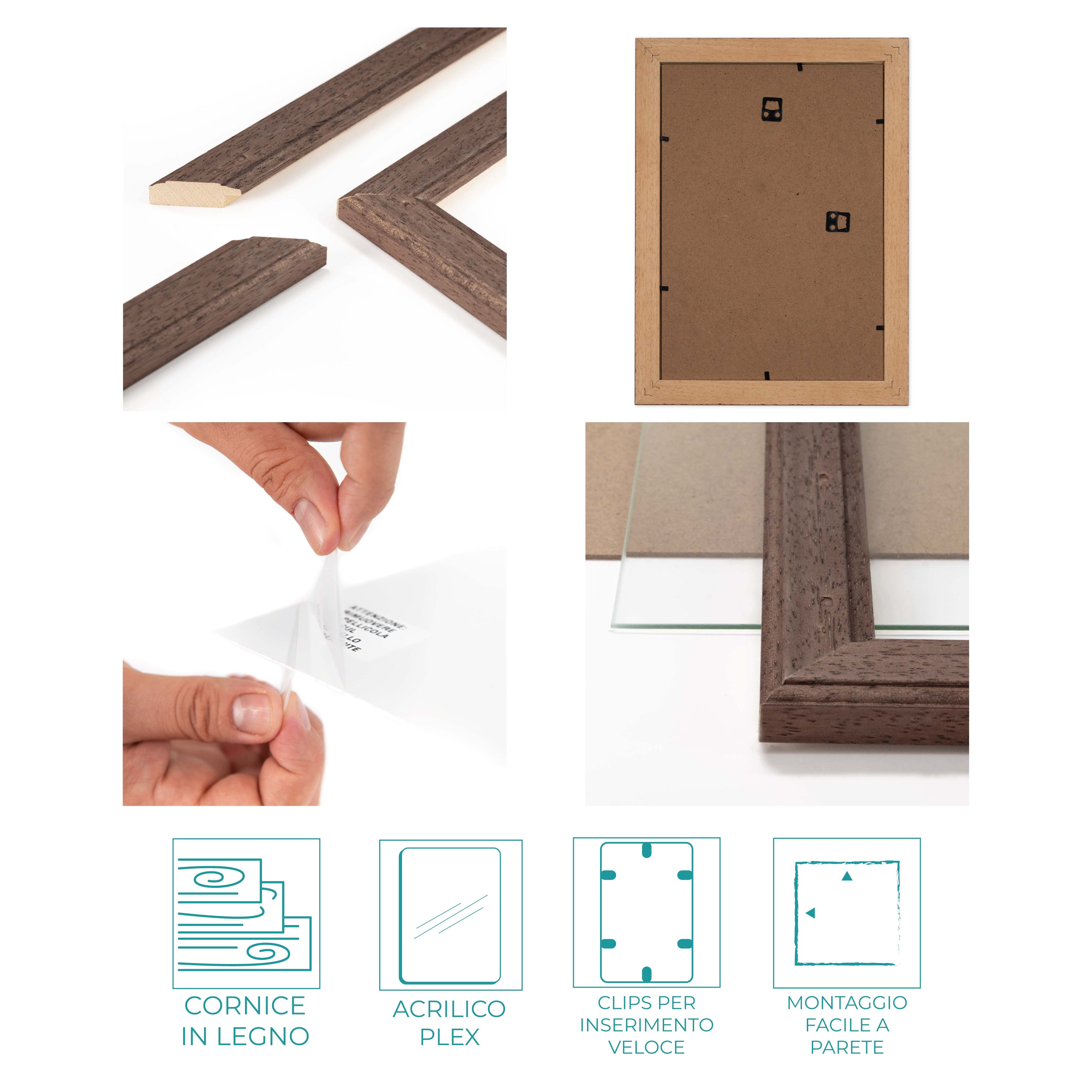 La protezione frontale del quadro è realizzata in Crilex (vetro acrilico trasparente) da 1 mm, un materiale infrangibile e sicuro, ideale per l’arredamento di ambienti domestici e commerciali. Grazie al suo elevato indice di trasparenza, protegge e valorizza la stampa senza alterarne i colori. Dotato di doppia pellicola protettiva su entrambi i lati, da rimuovere durante il montaggio per garantire la massima brillantezza. Ogni cornice è dotata di un sistema di clips in metallo che consente di inserire facilmente la tua foto o immagine. L'apposito pannello in legno ecologico fornito insieme alla cornice assicura una tenuta sicura e stabile, mantenendo la tua immagine al suo posto. La Cornice ARTE POVERA è dotata di ganci a scomparsa sul retro, che permettono di appendere la cornice sia in posizione orizzontale che verticale garantendo una presentazione pulita e senza ingombri.