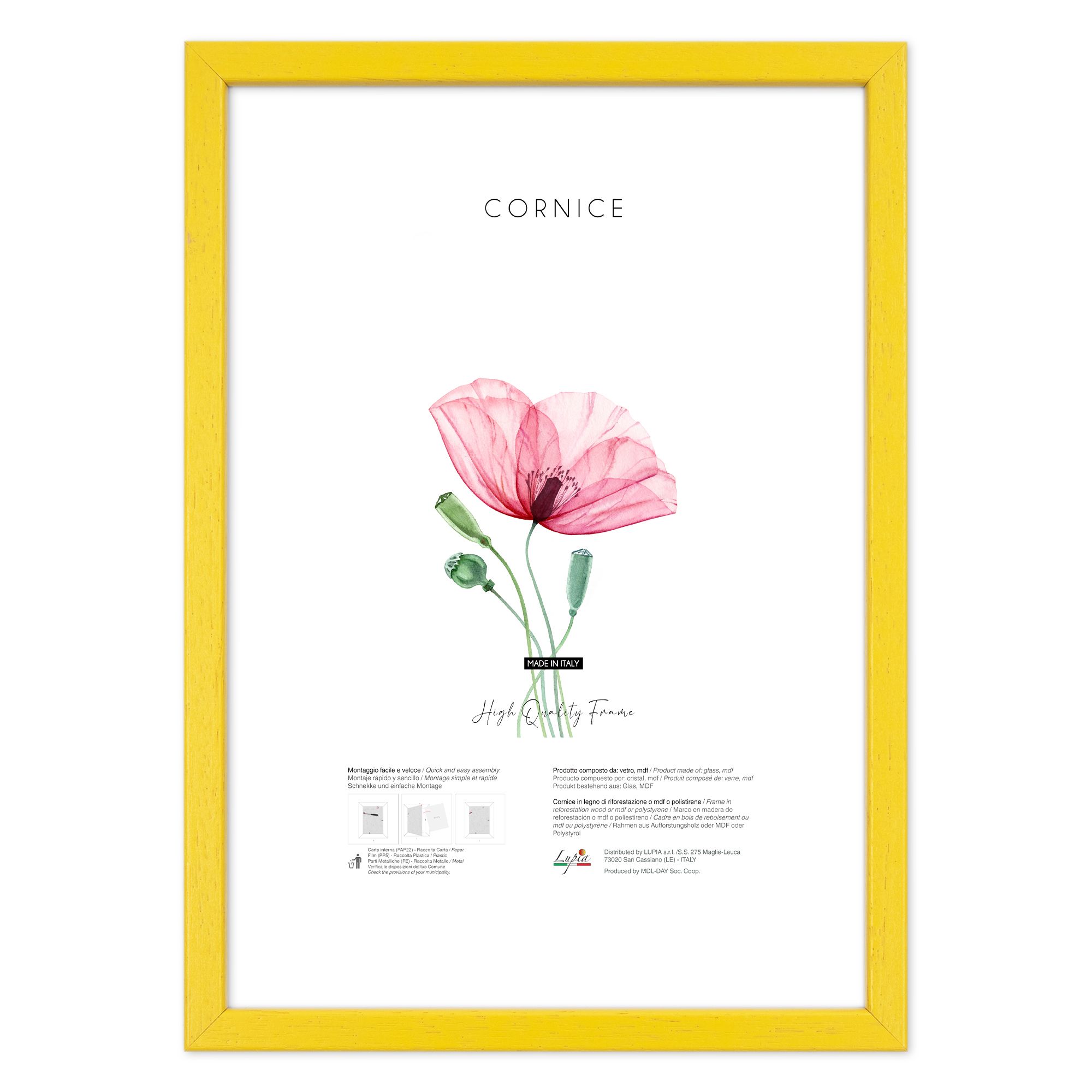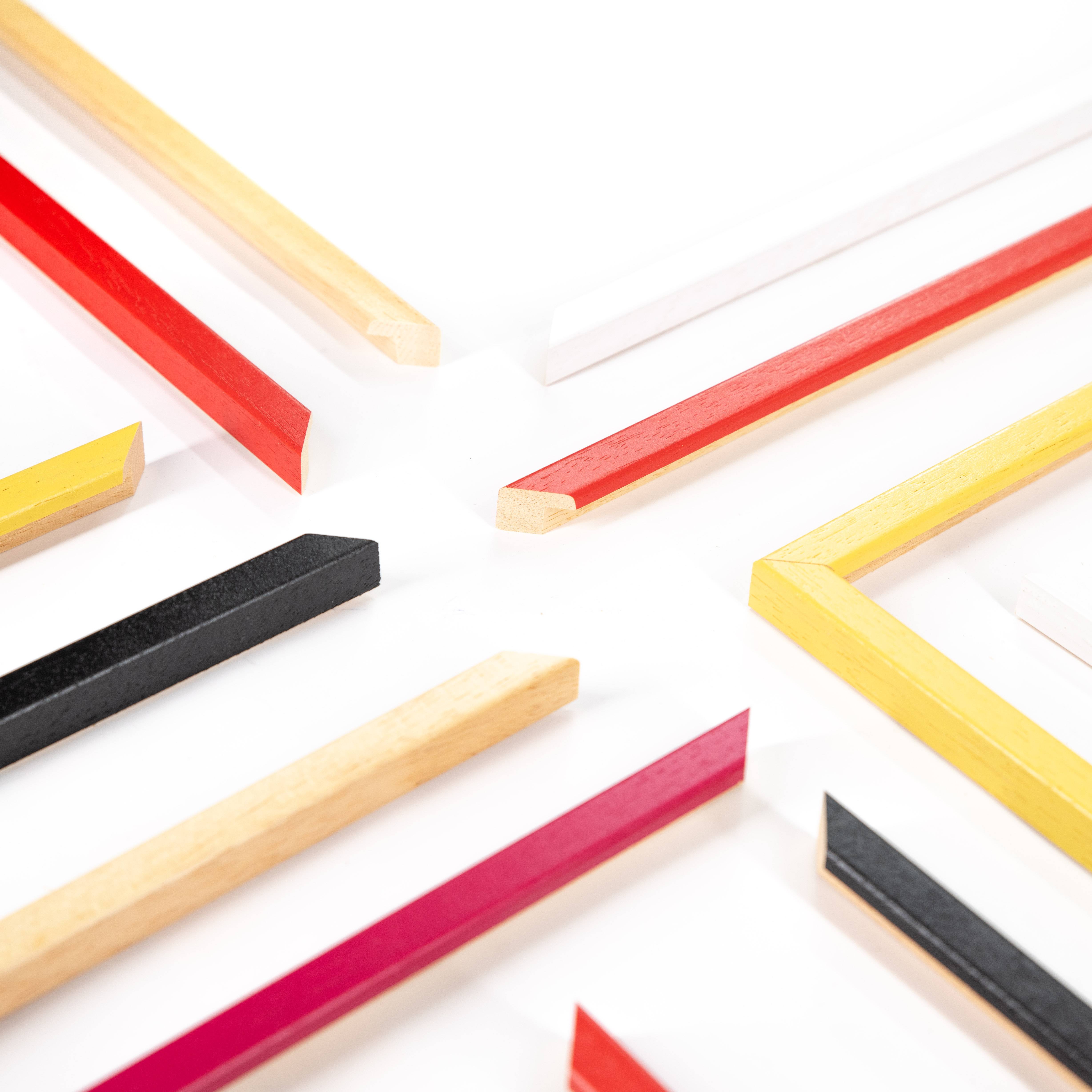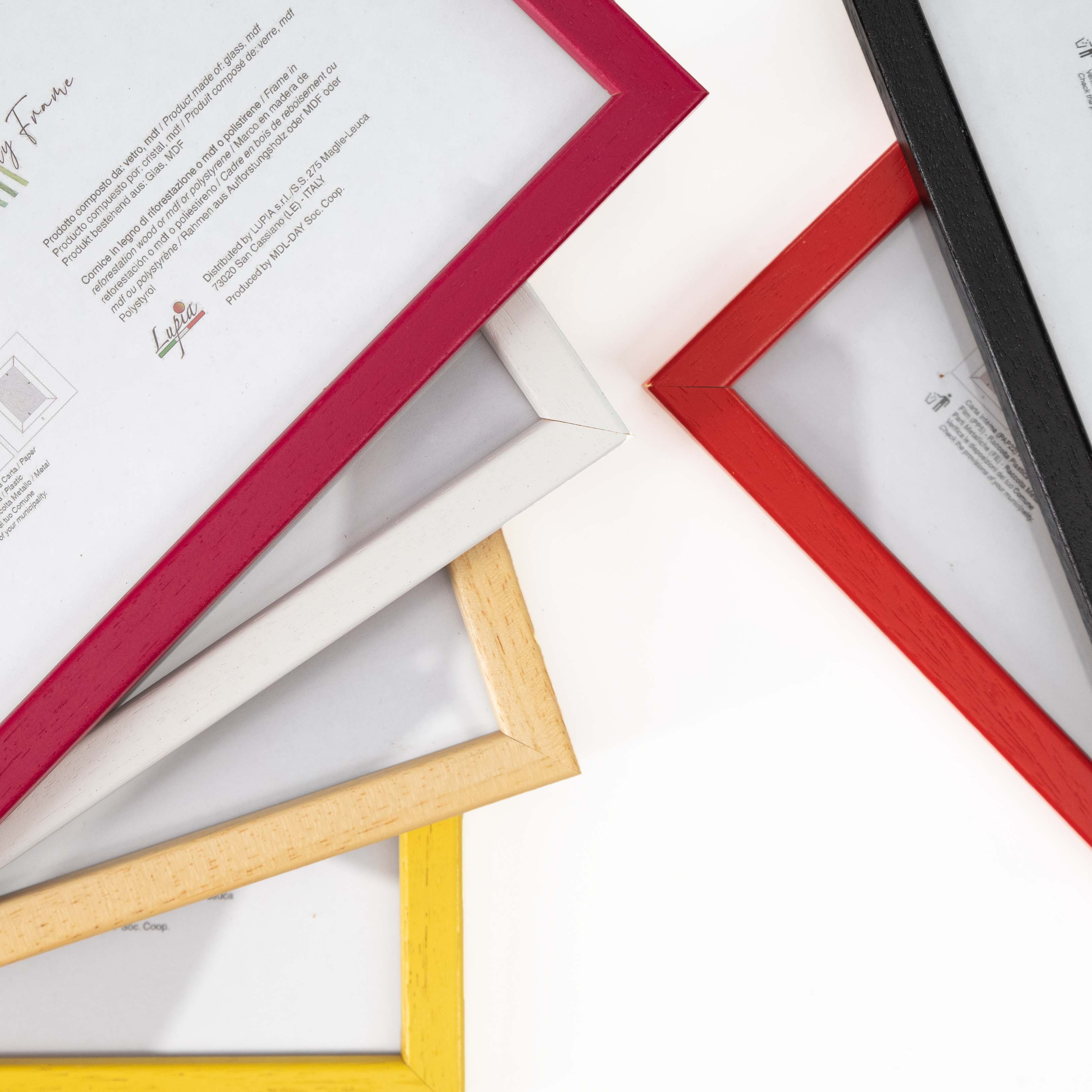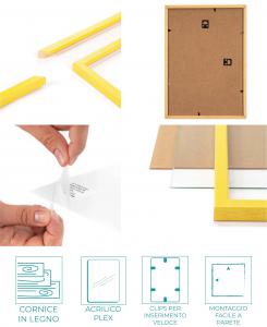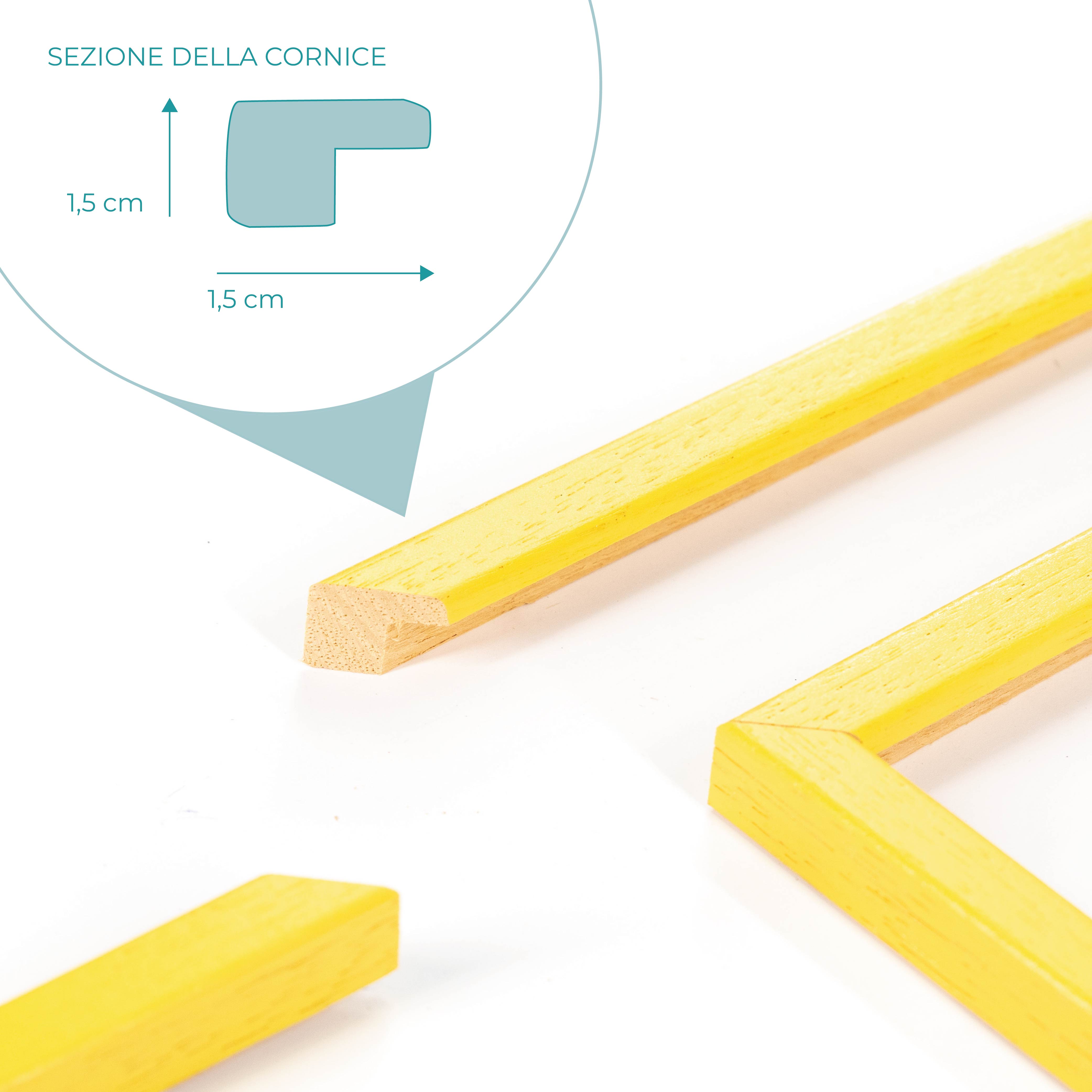 La cornice in legno Bomber gialla è disponibile in diverse misure e ha uno spessore o altezza della cornice di 1,5 cm e larghezza di 1,5 cm.