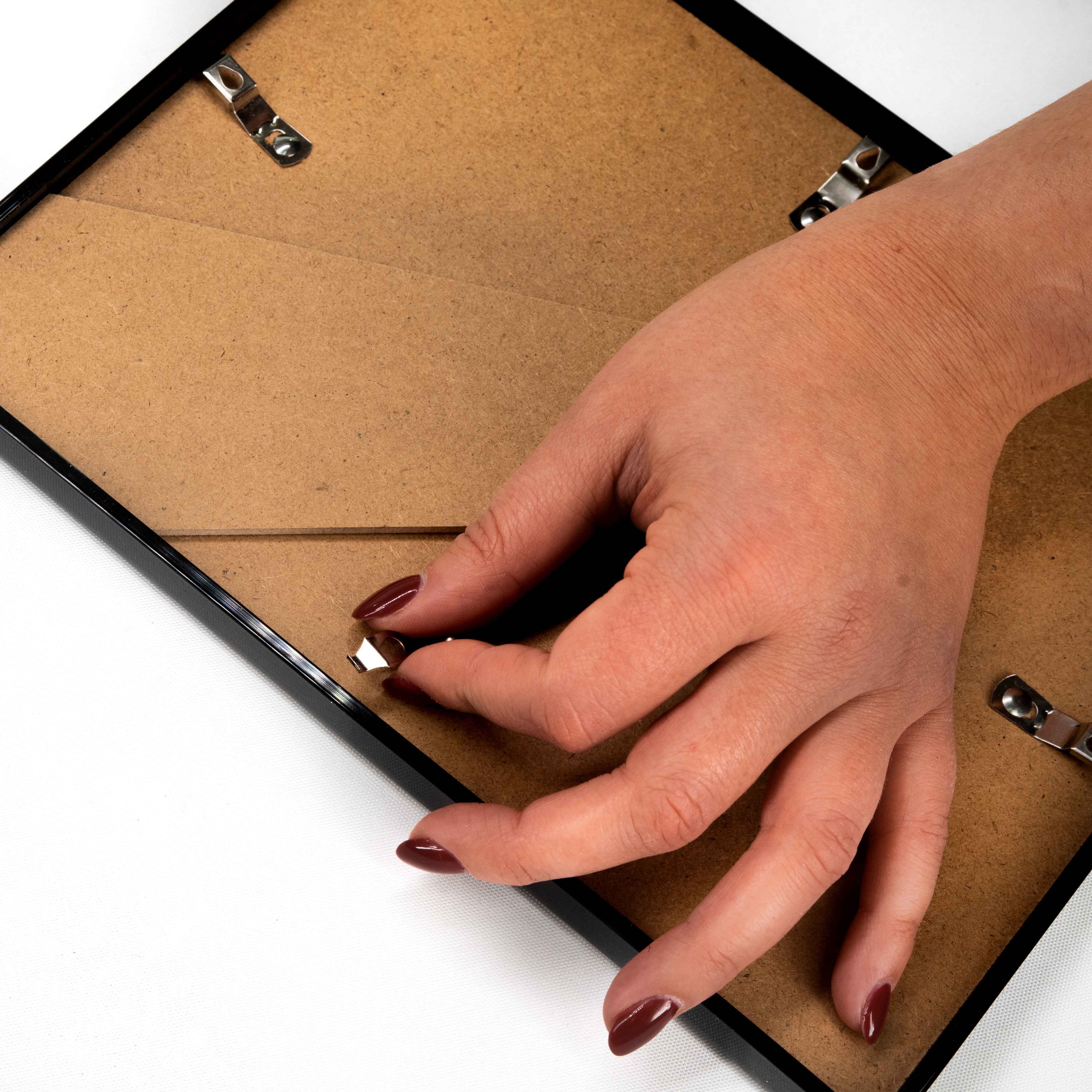 Il sistema di clips in metallo e il pannello posteriore in legno ecologico assicurano una chiusura stabile e un montaggio semplice e sicuro. Ideale anche per chi desidera cambiare frequentemente il contenuto della cornice.