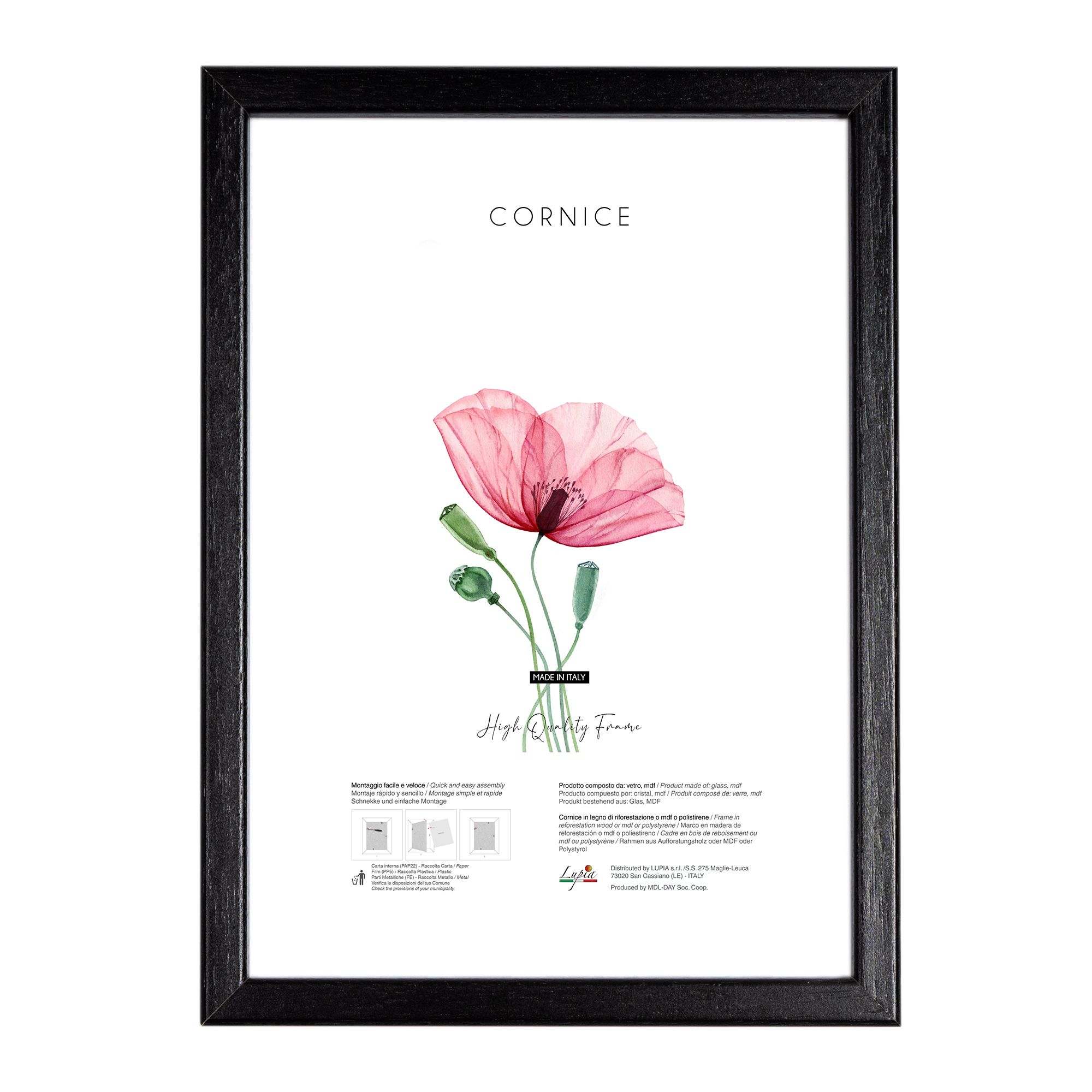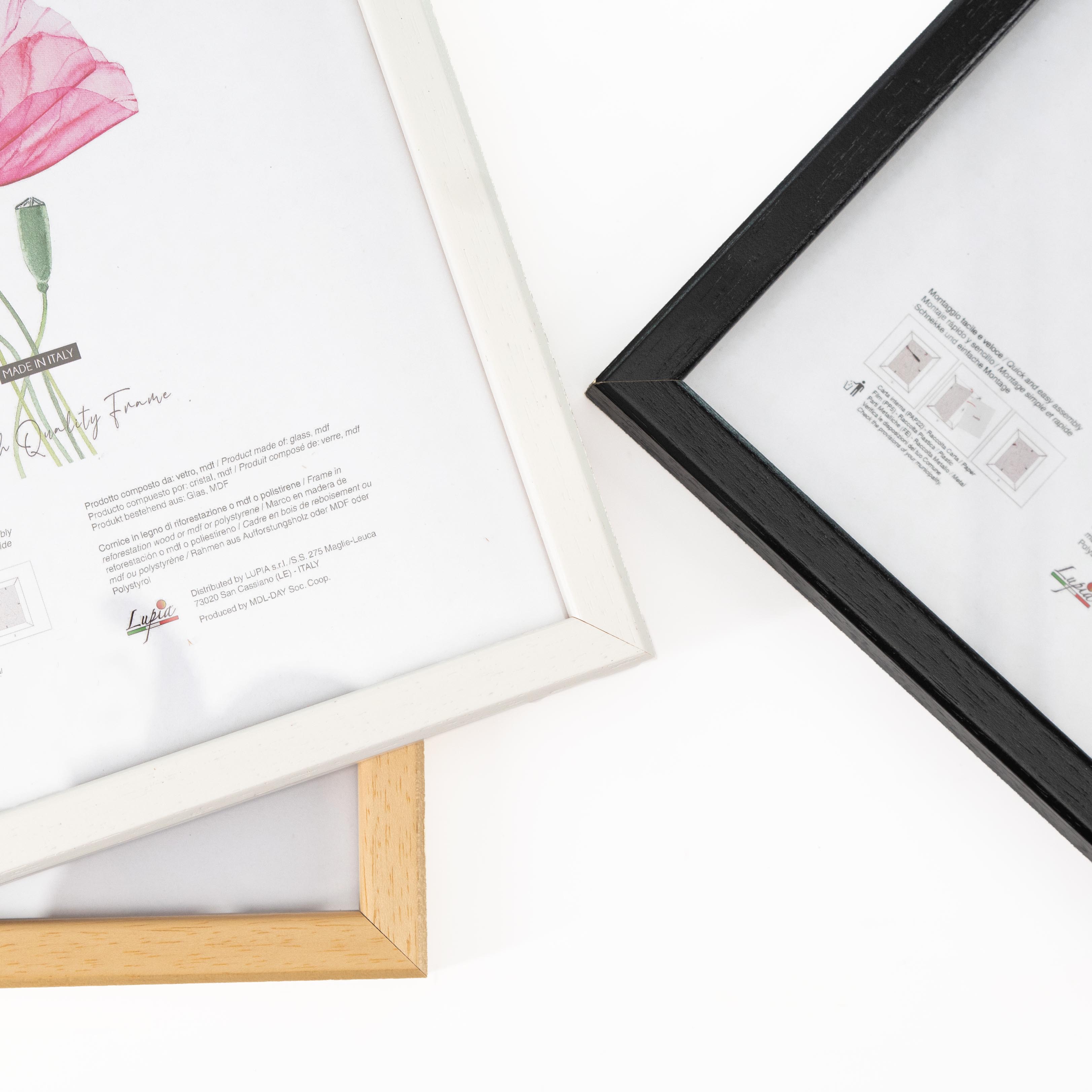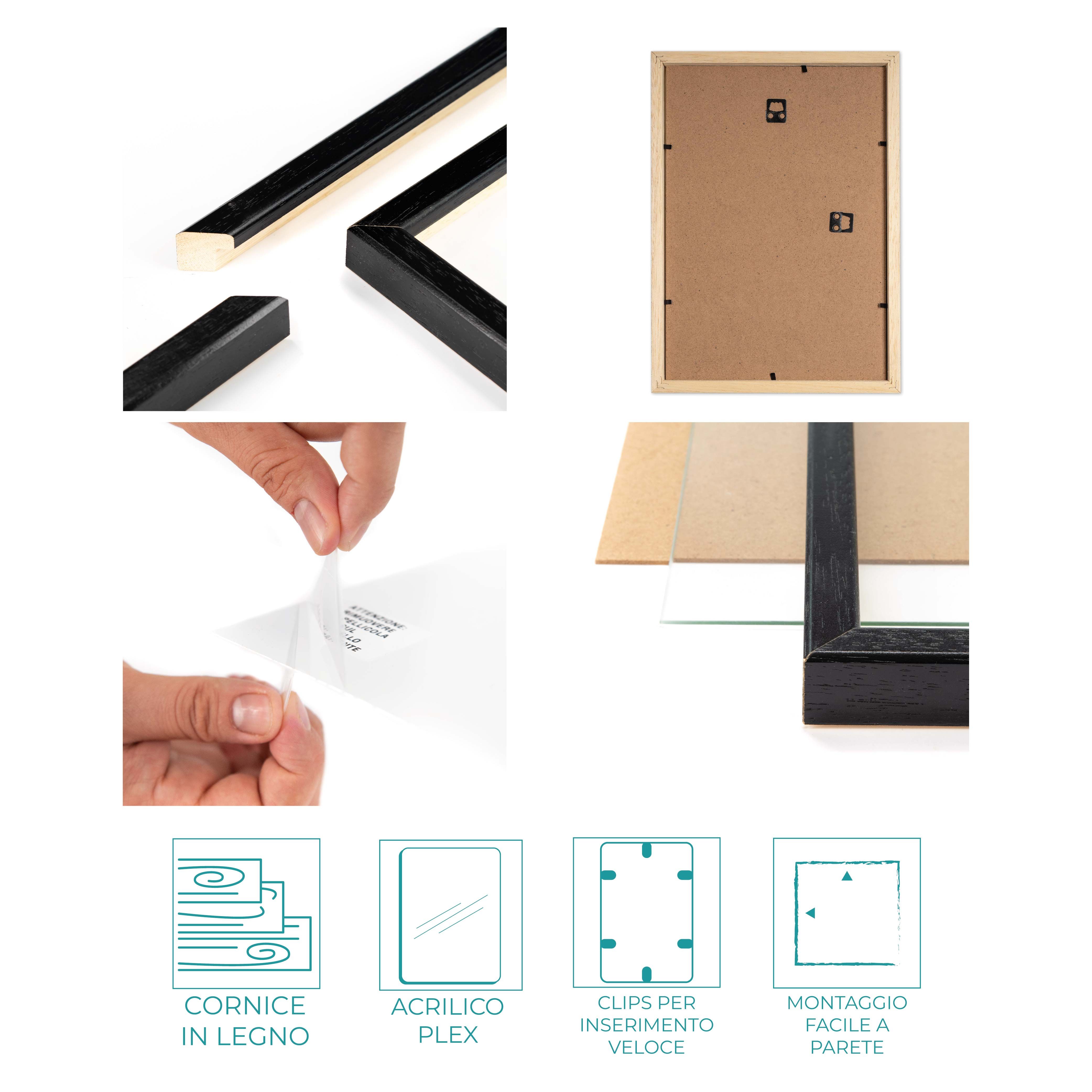Il colore nero del legno della cornice è elegante e senza tempo e ben si abbina a qualsiasi stile di arredamento e ai colori del soggetto da incorniciare. La cornice portafoto è disponibile in tantissime dimensioni e varianti di colore tra le quali poter scegliere.